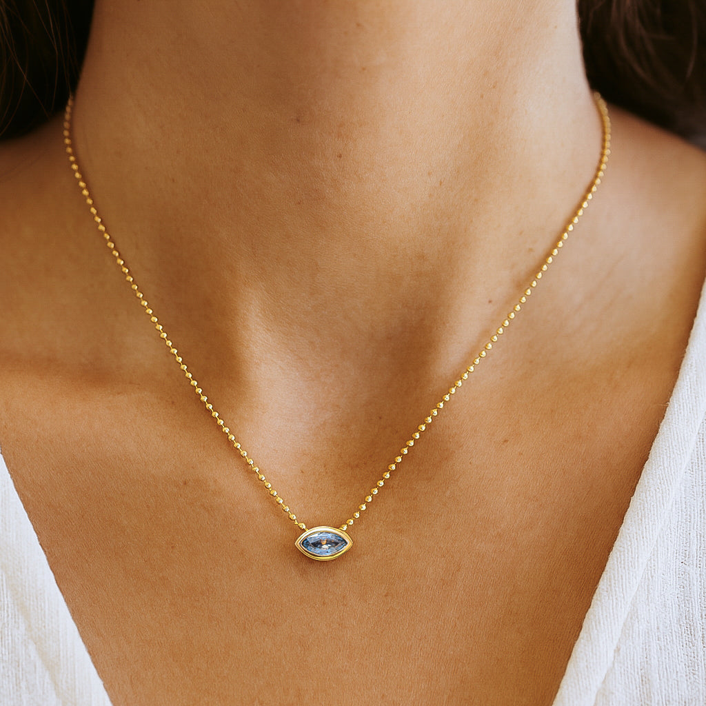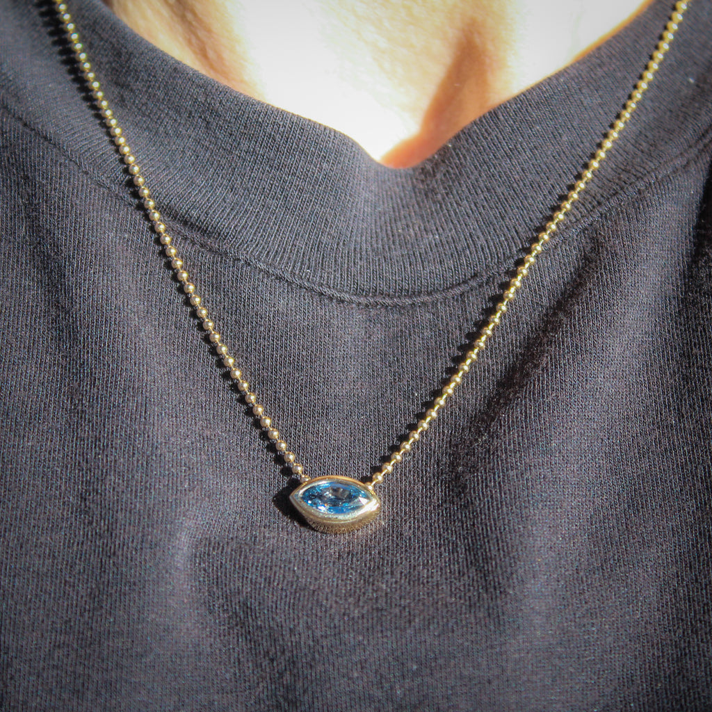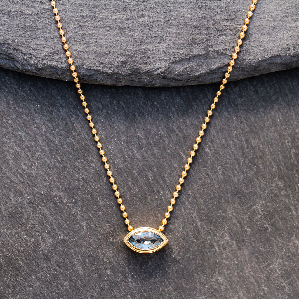 This elegant 14k yellow gold necklace showcases a marquise-cut light blue spinel set in a sleek bezel, gliding gracefully along a sturdy ball link chain. Its refined design adds a vibrant touch of color, whether worn as a standalone statement piece or layered effortlessly with other favorites.