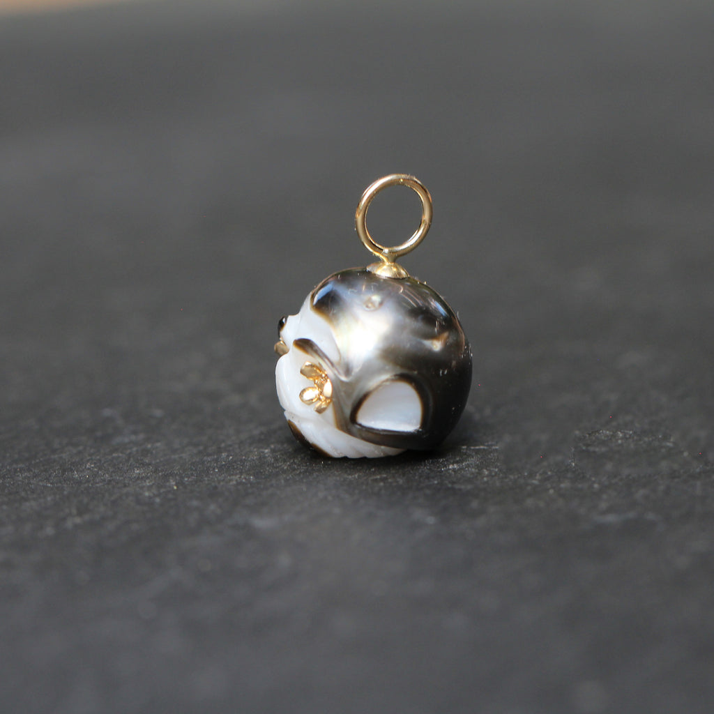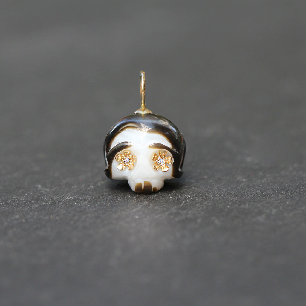 This adorable 14k yellow gold and diamond skull charm features an intricately carved grey and white pearl into the shape of a skull. It has been upcycled by adding round cut diamond daisies to the eyes as well as a 14k yellow gold bail.
