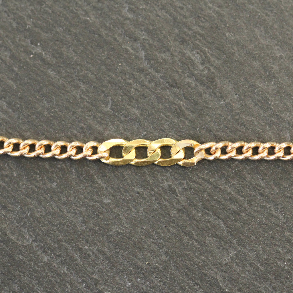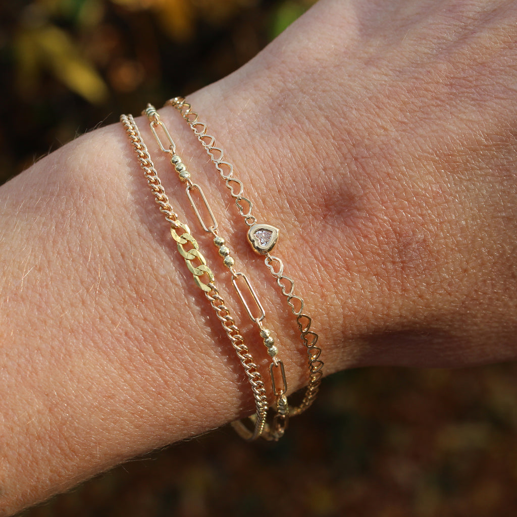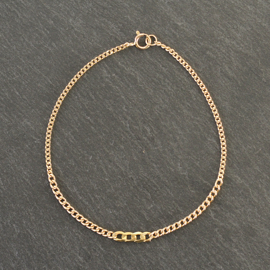 This unique 14k yellow gold curb chain bracelet has been upcycled by using 14k yellow gold recycled curb chain at 3 different widths.