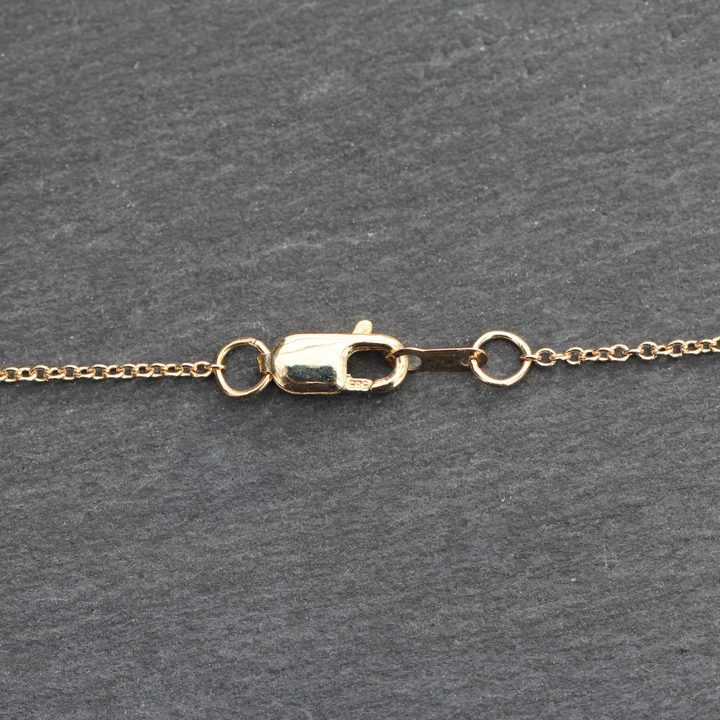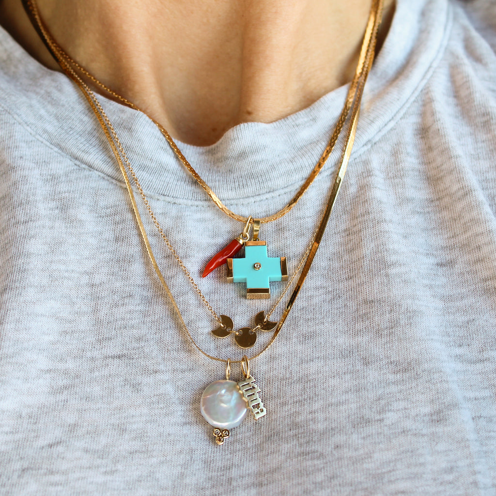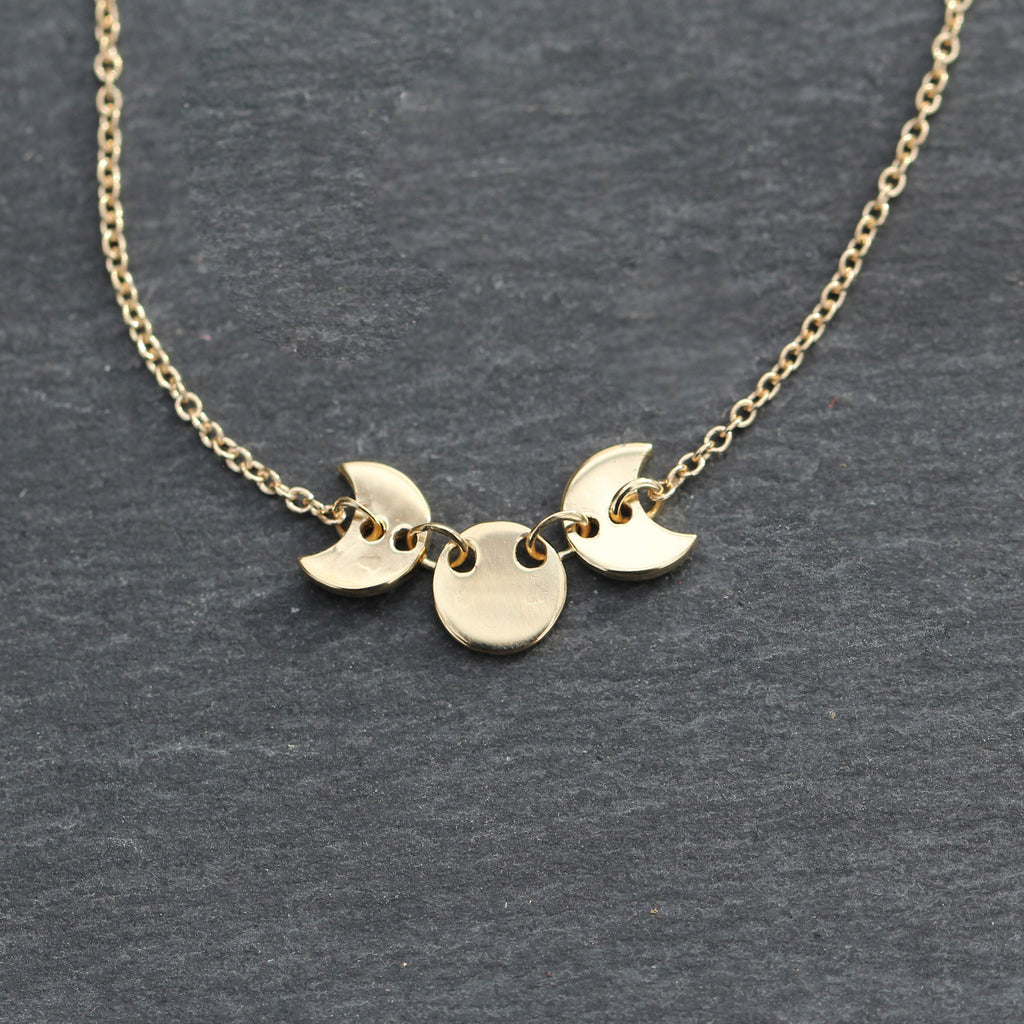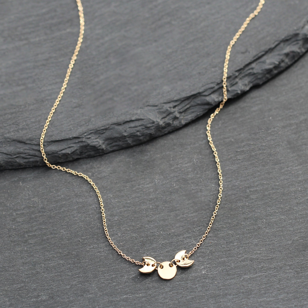 This 14k yellow gold station necklace features a moon phase style stationed center with 2 crescent moons on the sides of one full moon in the center. It's perfect for layering and makes a simple statement on it's own.