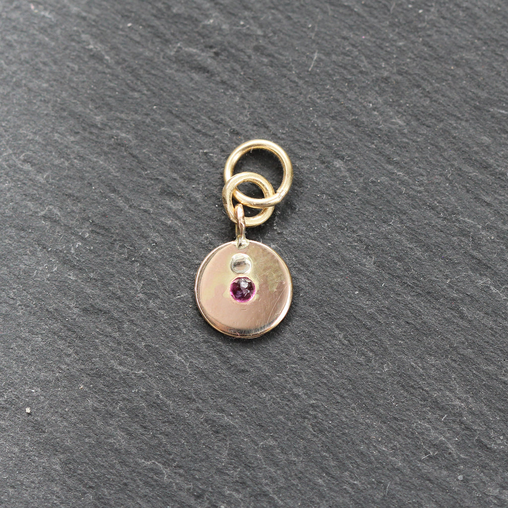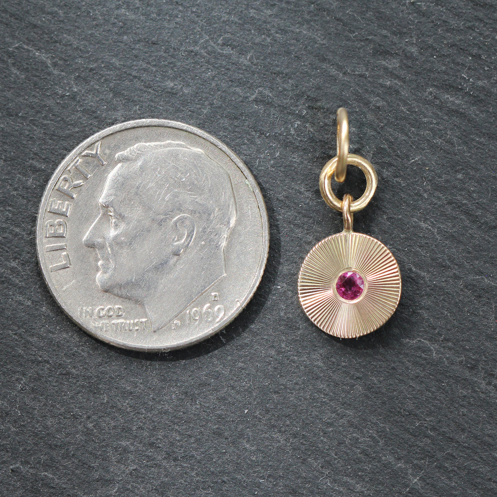 This beautiful sunburst style 14k gold and ruby charm features the perfect pop of color with the center round cut flush set ruby. It has been upcycled from a vintage stick pin creating a one of a kind, ethically made gem!