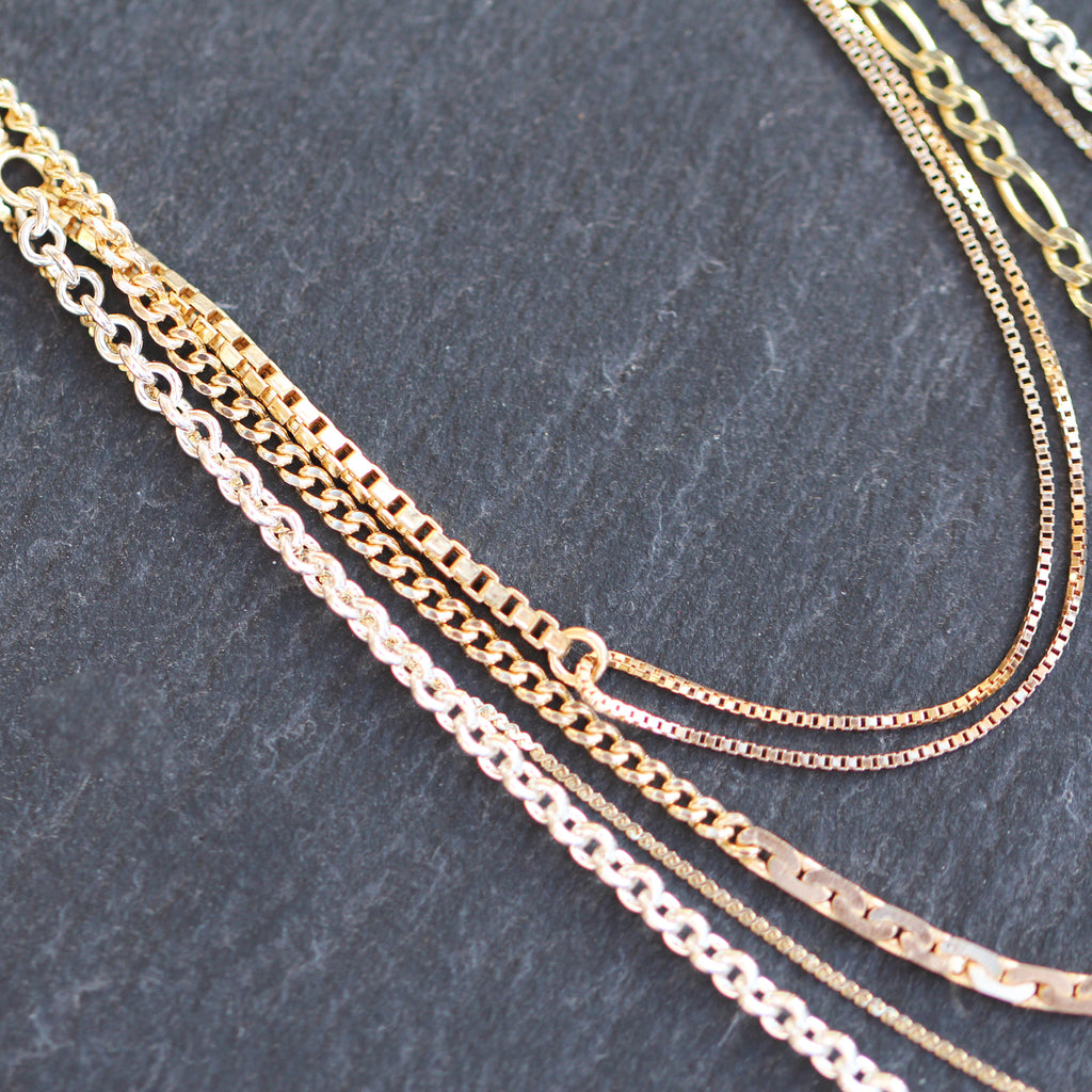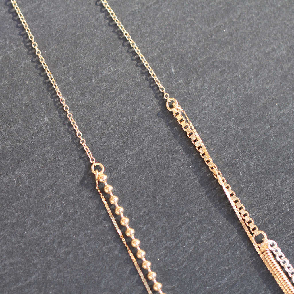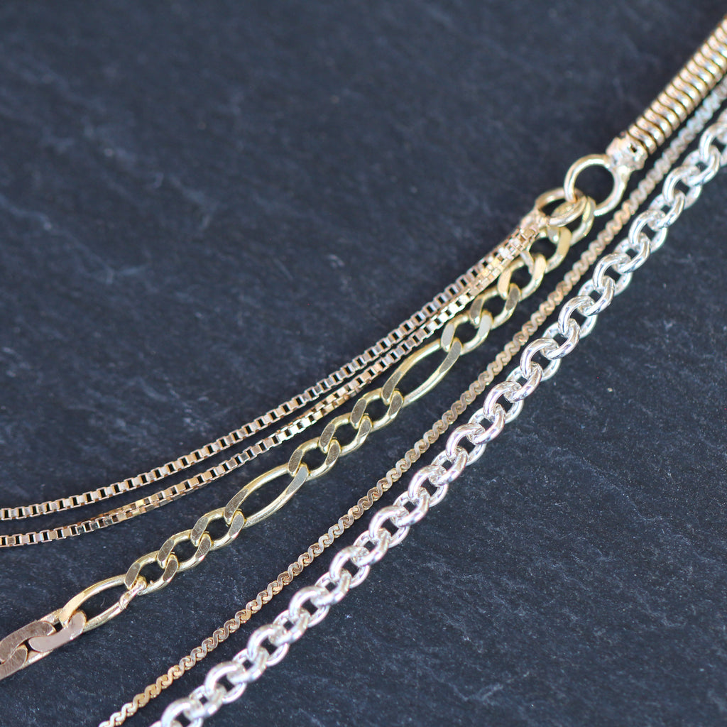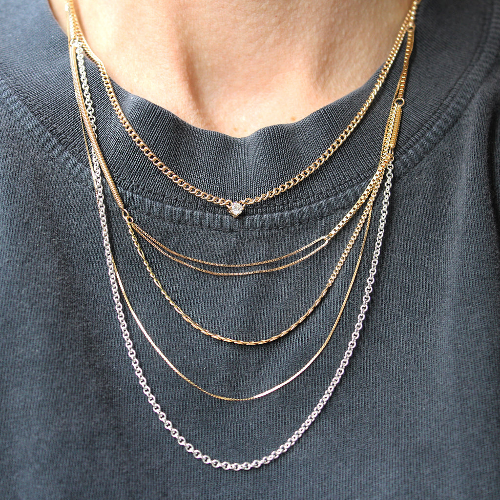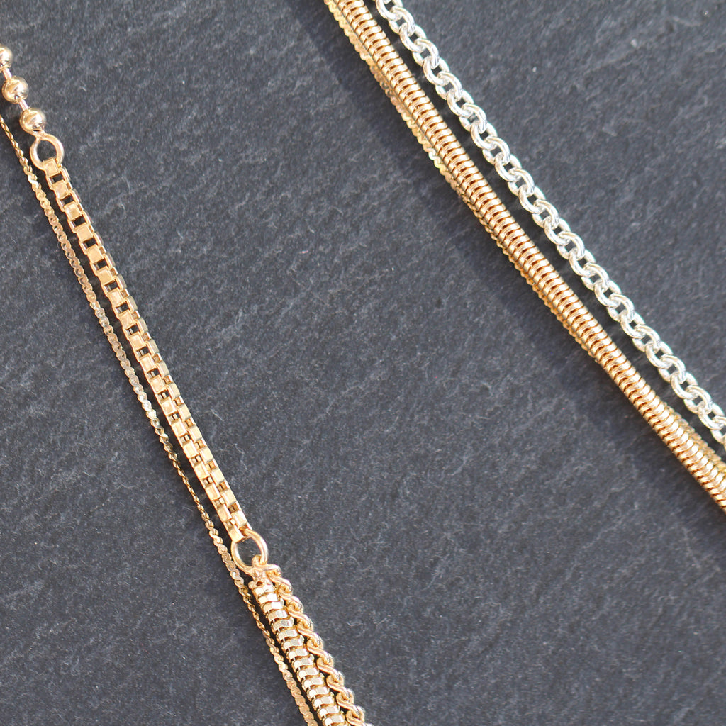 This beautifully unique mixed metal necklace has been upcycled by using multiple different styles of 14k yellow gold chains and one cable link chain. The tiers of chain styles give it a the look of wearing multiple chains. Through recycling all of these chains, we have created a one of a kind, ethically made statement necklace!