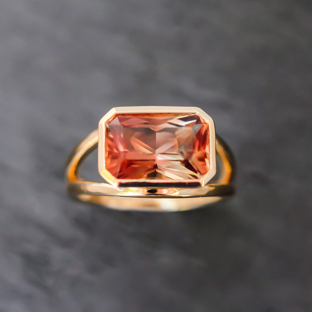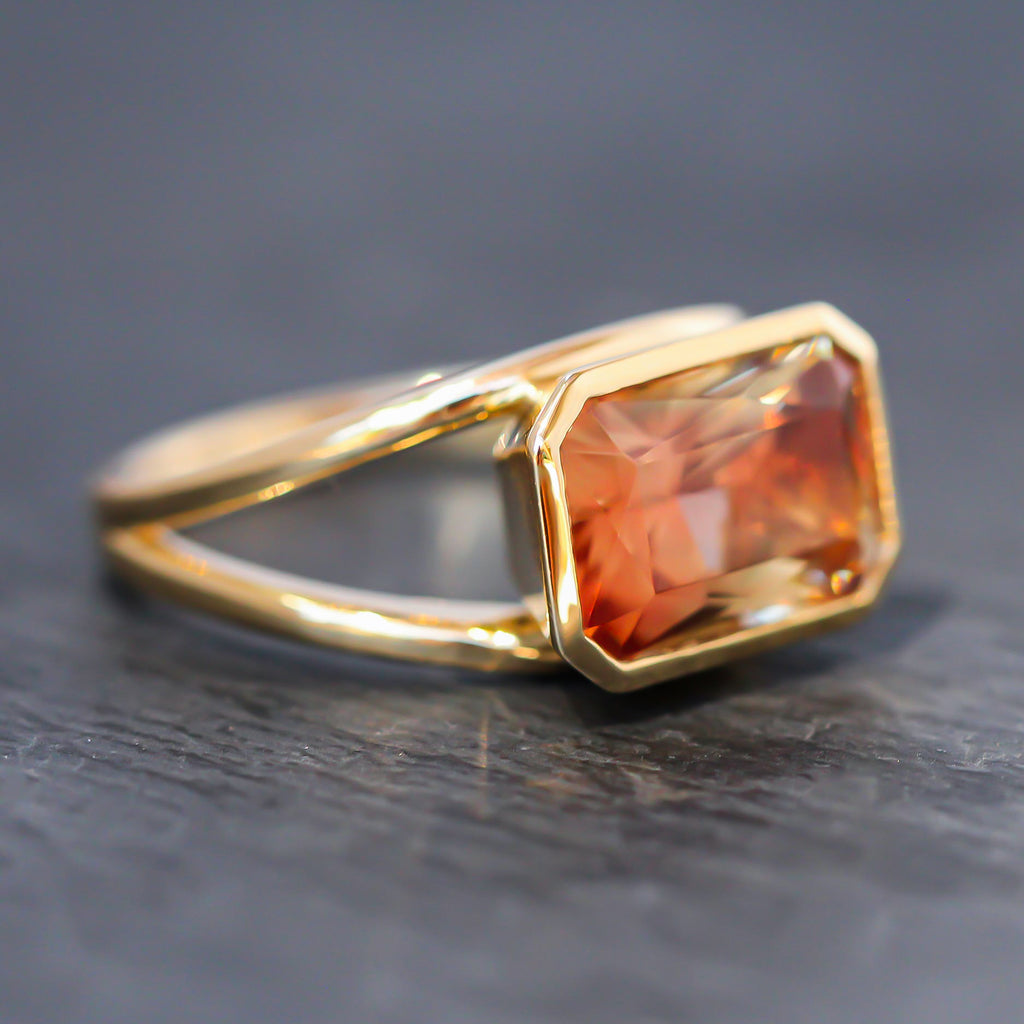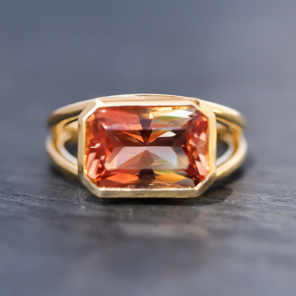 This 14k yellow gold sunstone cocktail ring was designed in-house and newly made. It features a stunning 4-carat emerald-cut sunstone in a beautiful bezel setting. The stone shifts in color—showing warm tones of orange, red, yellow, and green depending on the light. A split-shoulder band allows more light to reach the stone, enhancing its natural glow. With a high-polish finish and bold presence, this ring is an elegant way to make a statement.