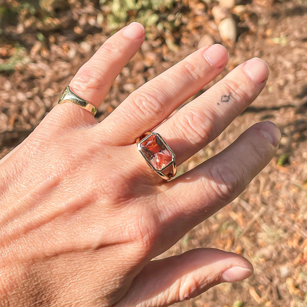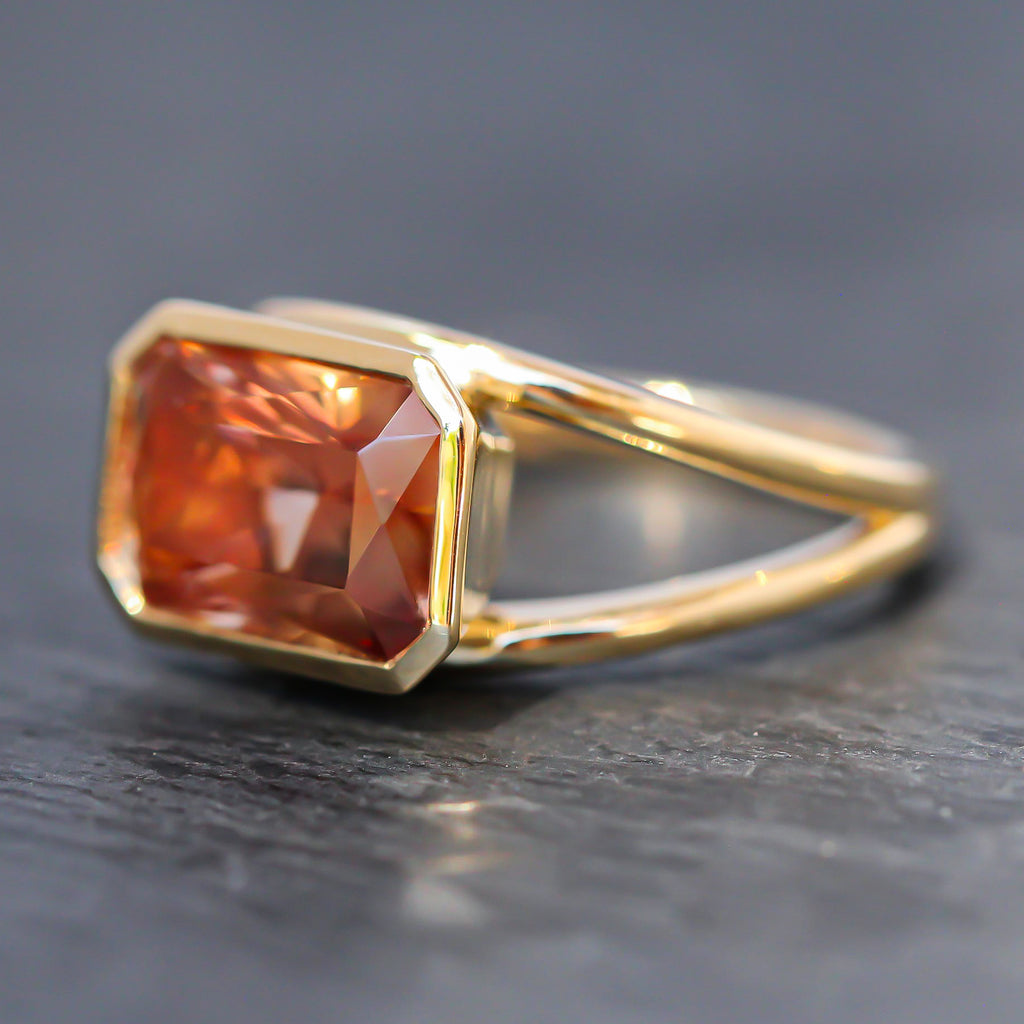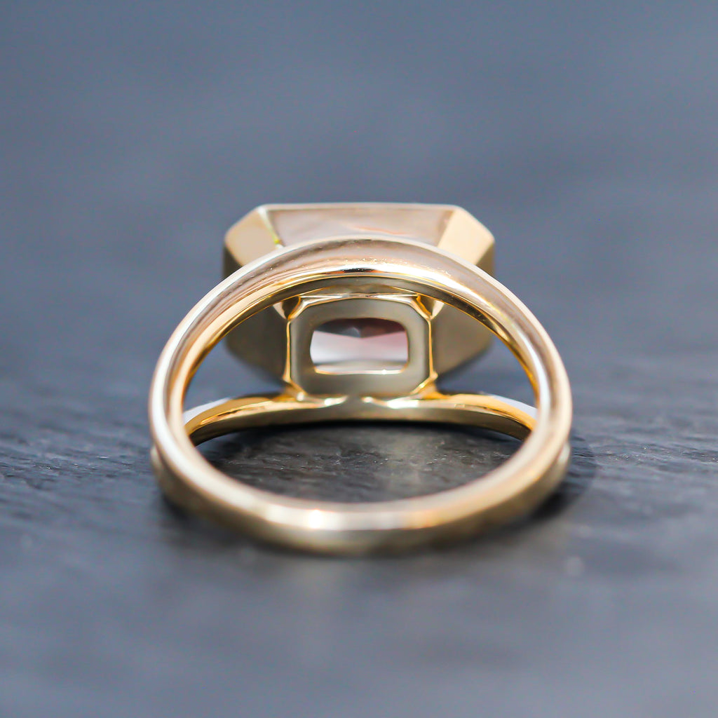 This 14k yellow gold sunstone cocktail ring was designed in-house and newly made. It features a stunning 4-carat emerald-cut sunstone in a beautiful bezel setting. The stone shifts in color—showing warm tones of orange, red, yellow, and green depending on the light. A split-shoulder band allows more light to reach the stone, enhancing its natural glow. With a high-polish finish and bold presence, this ring is an elegant way to make a statement.