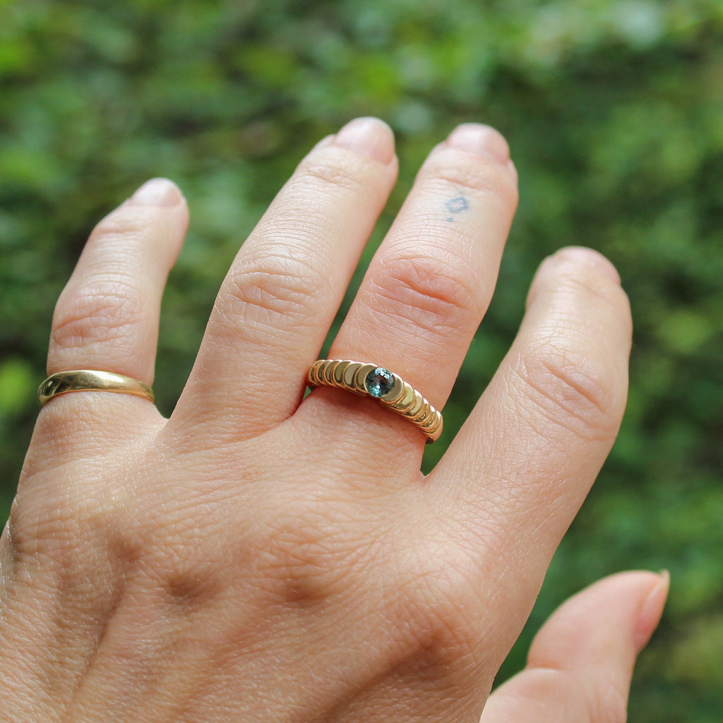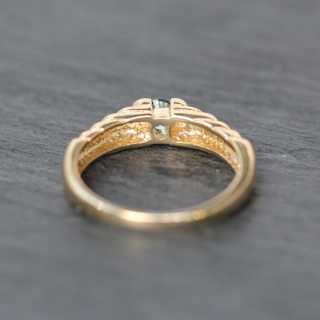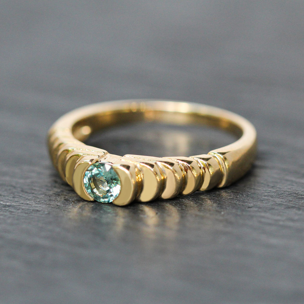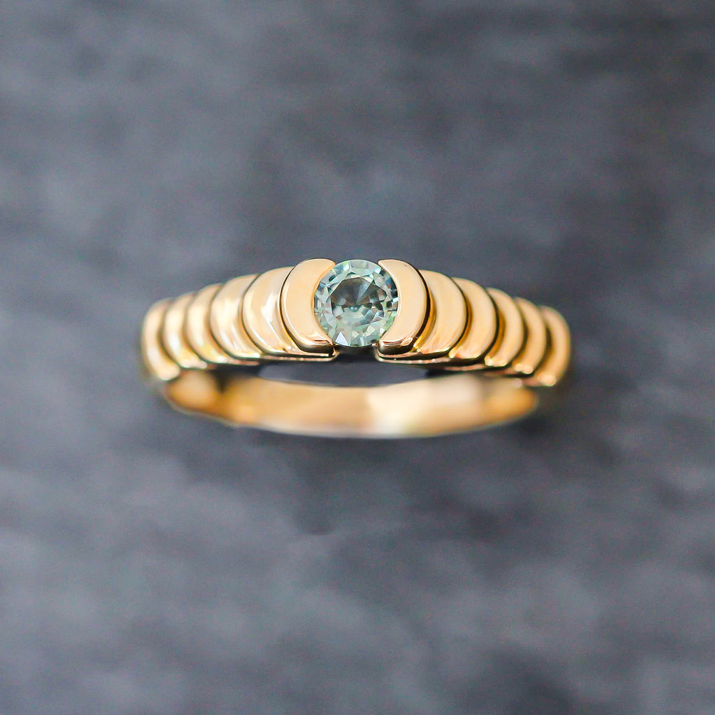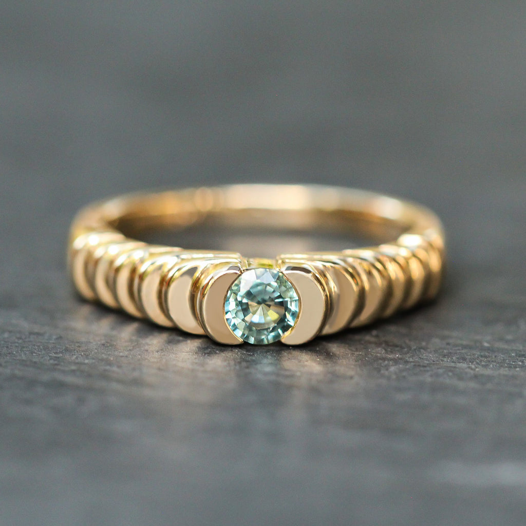 This stunning 14k yellow gold and teal sapphire signet ring features a round cut half bezel set sapphire with hues of light green and blue. The ring has step details on the shoulders creating a signet ring style with a stunning sparkly solitaire sapphire in the center!