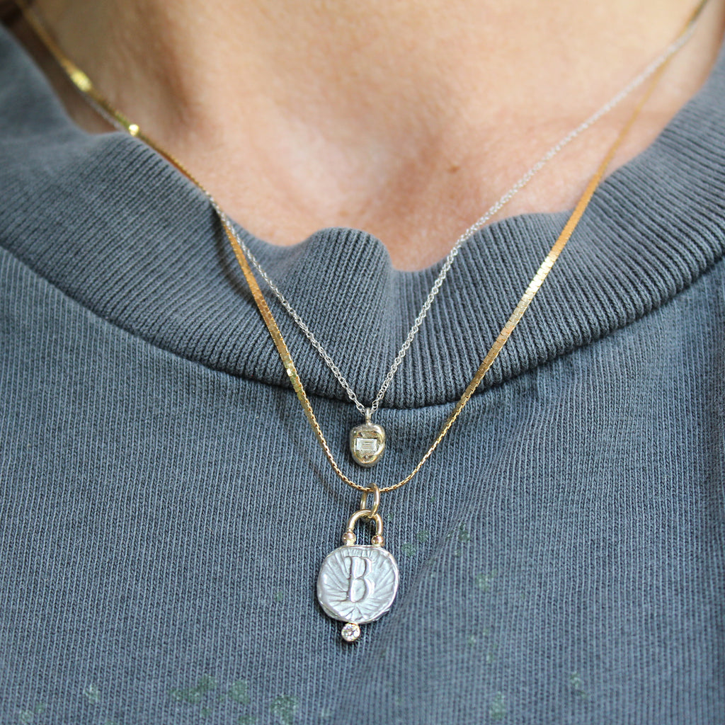 Note: There is a slight color difference between the chain and the charm due to the process of recycling the white gold used for the charm.