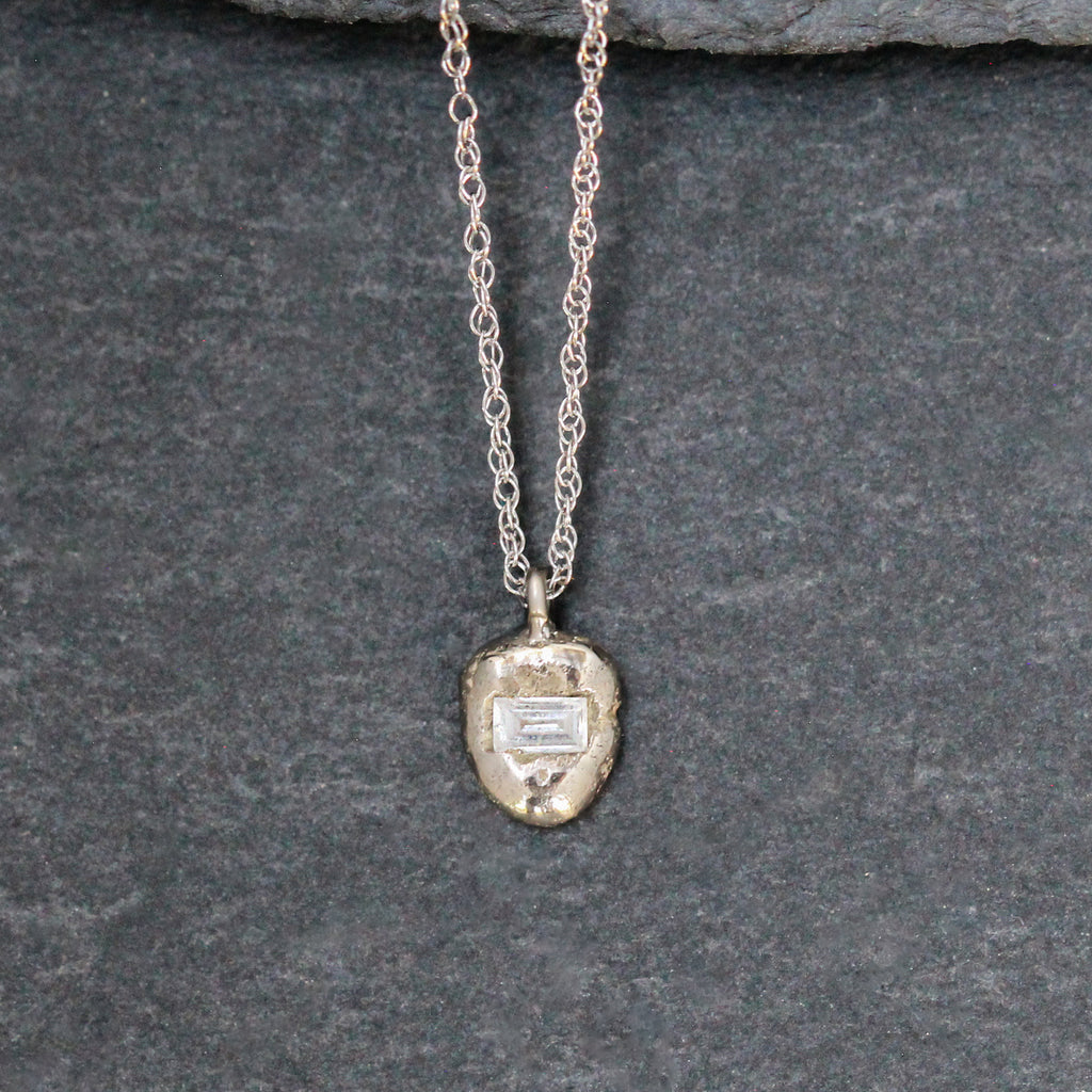 This gorgeous 14k white gold and diamond charm necklace features an organic shaped white gold bubble centerpiece adorned with a flush-set, baguette cut diamond. It's set on a vintage 14k white gold Singapore link chain.