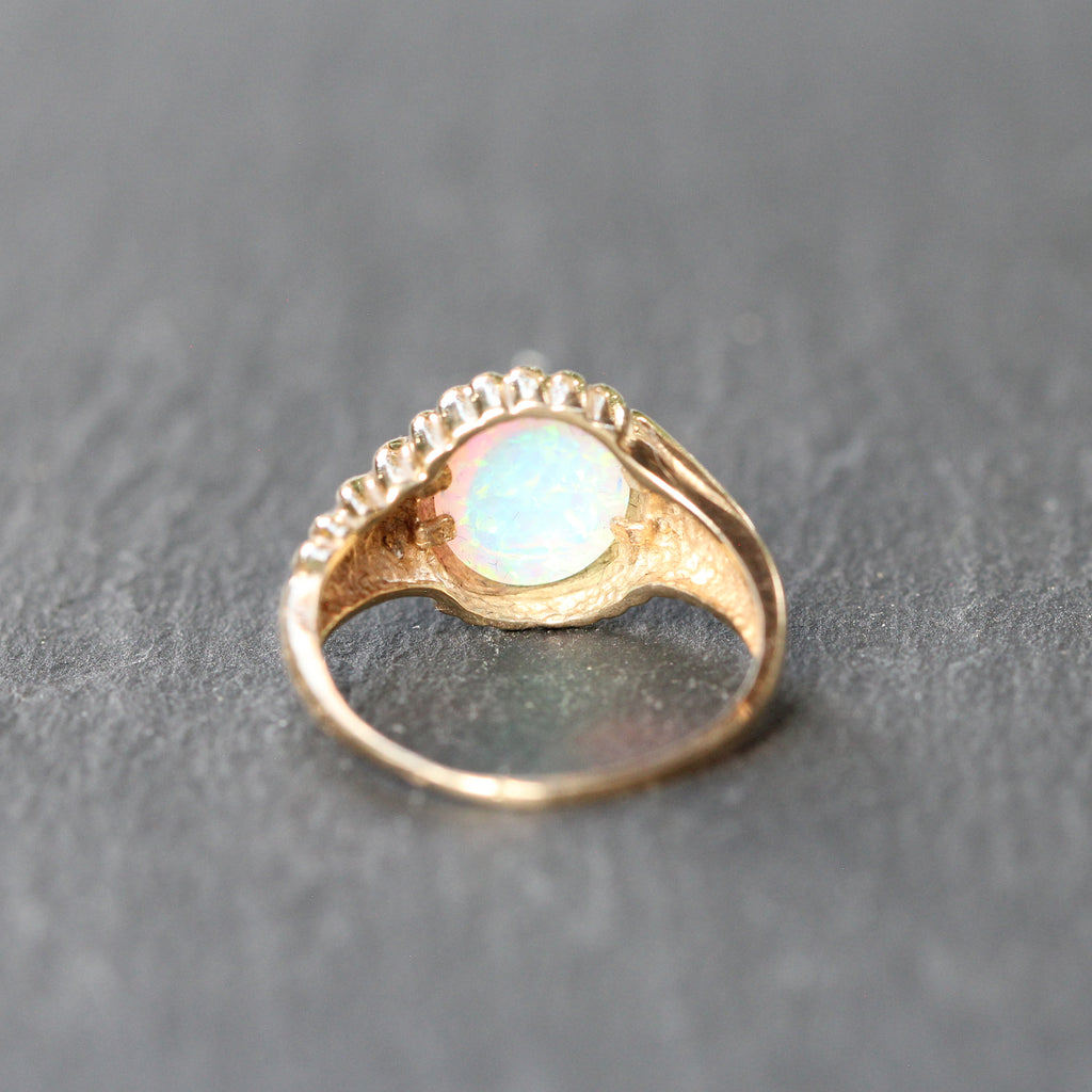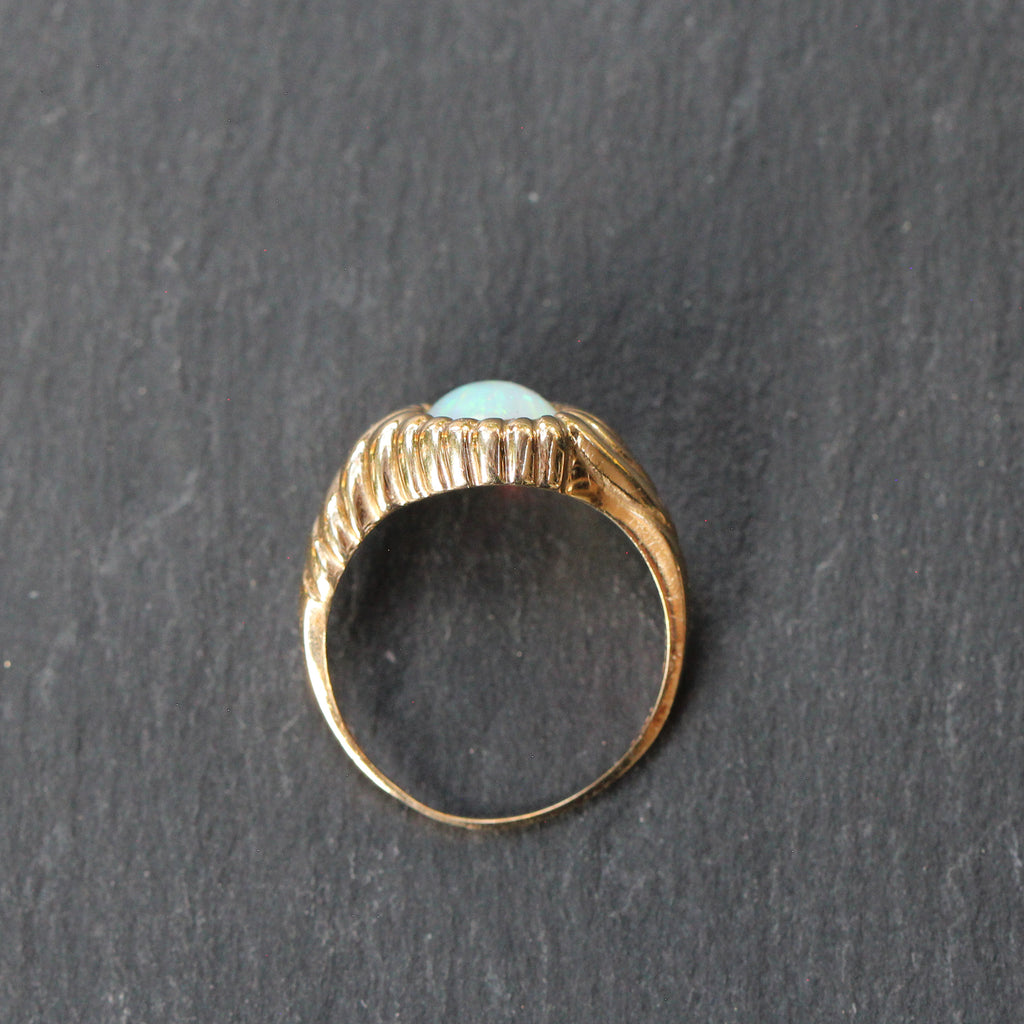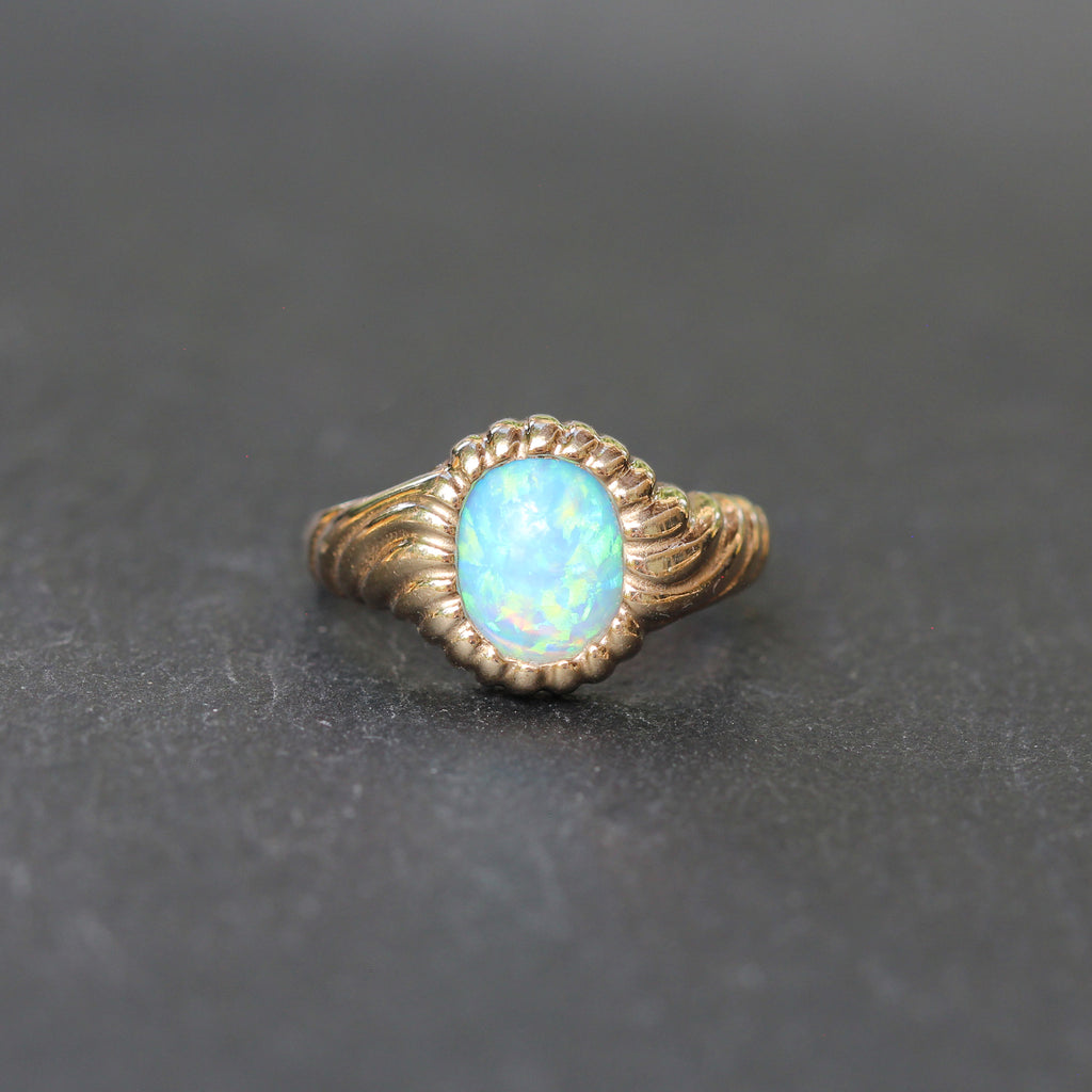 This beautiful vintage 10k yellow gold and opal ring features an oval cut bezel set opal with a shrimp style tapered band