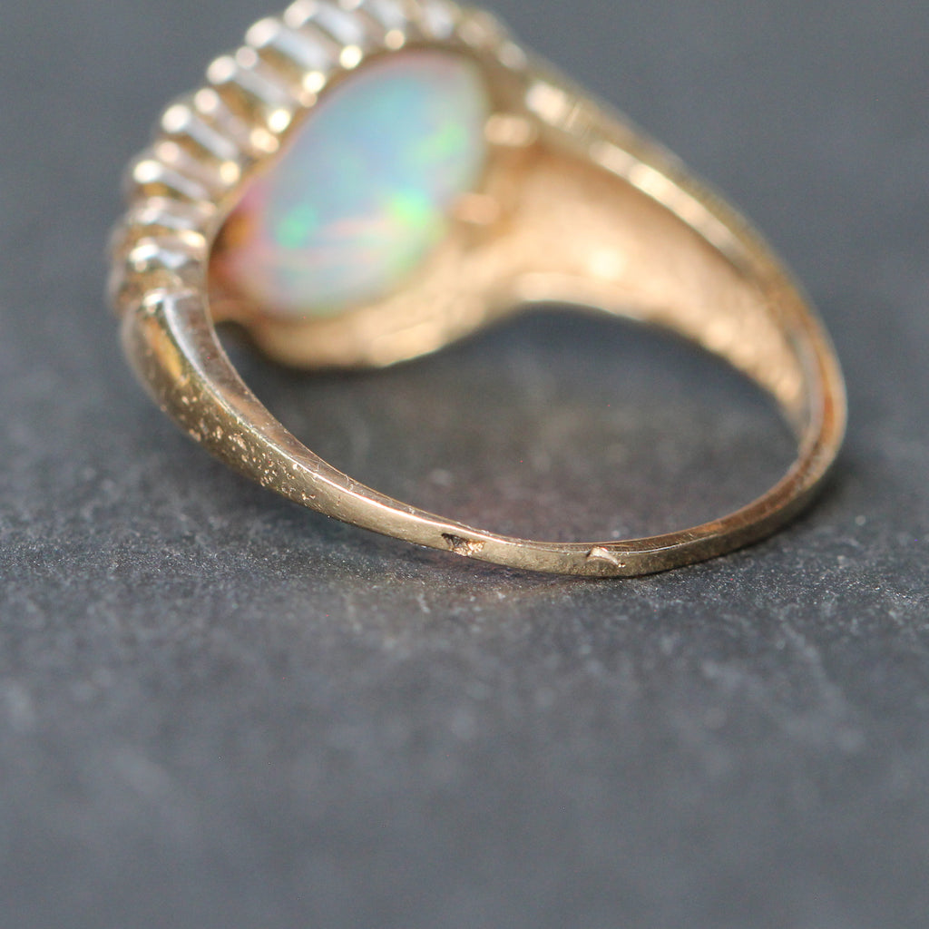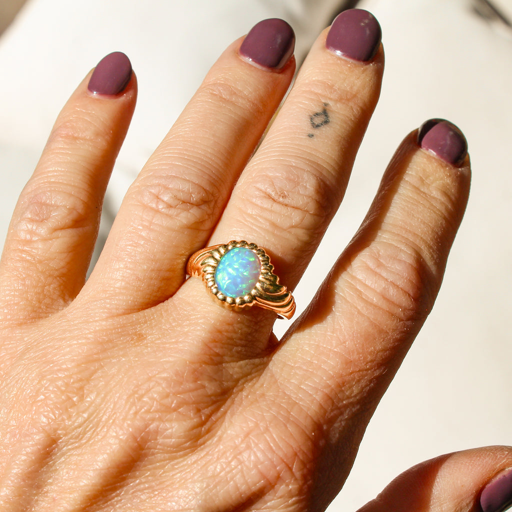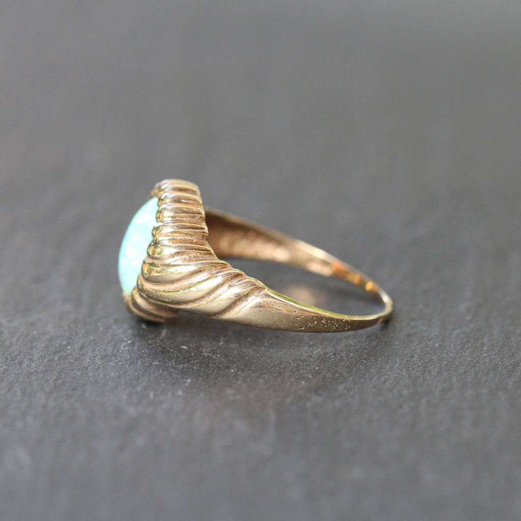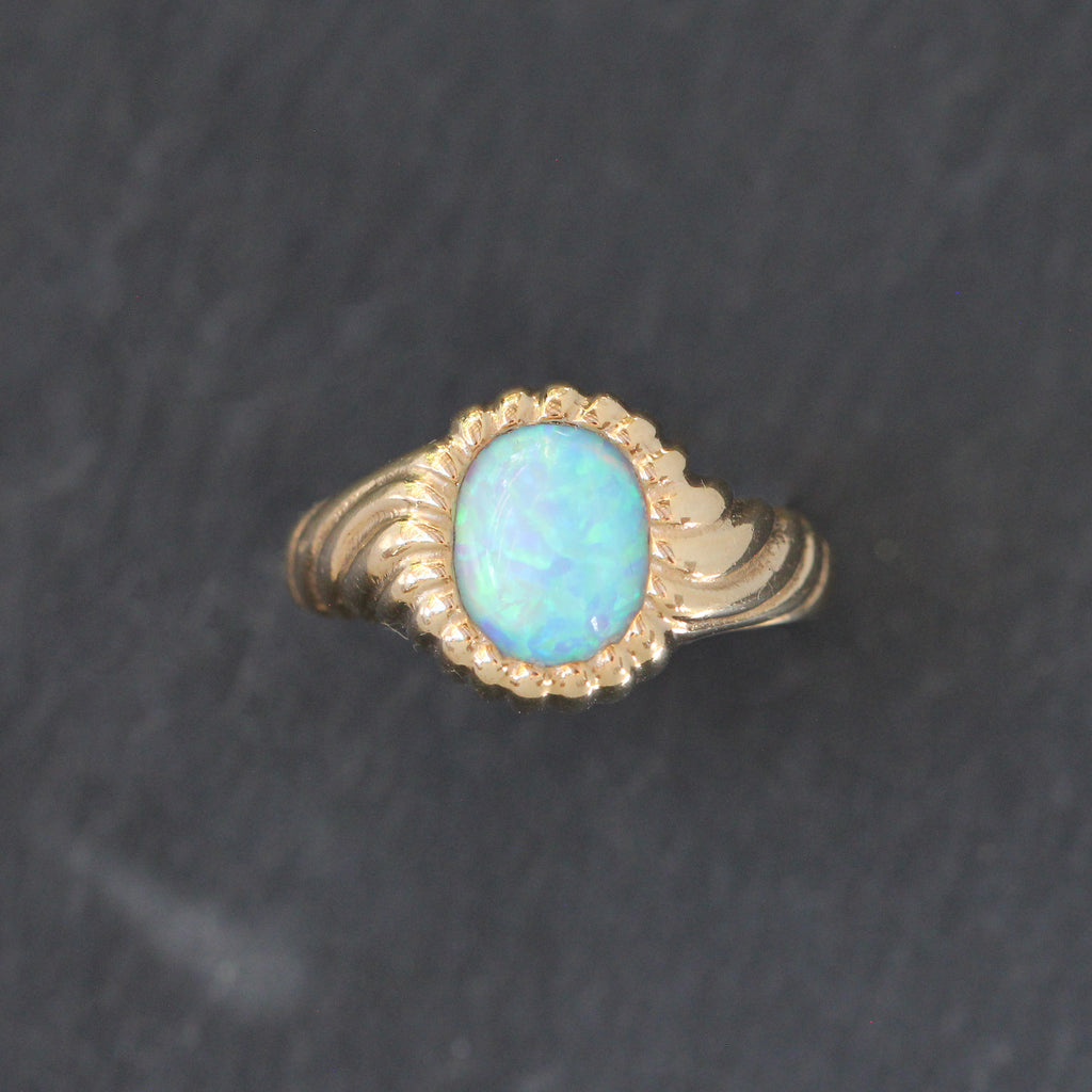 This beautiful vintage 10k yellow gold and opal ring features an oval cut bezel set opal with a shrimp style tapered band