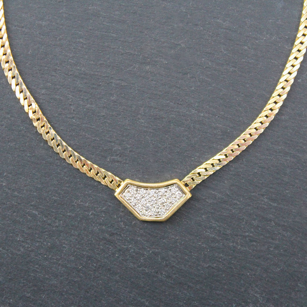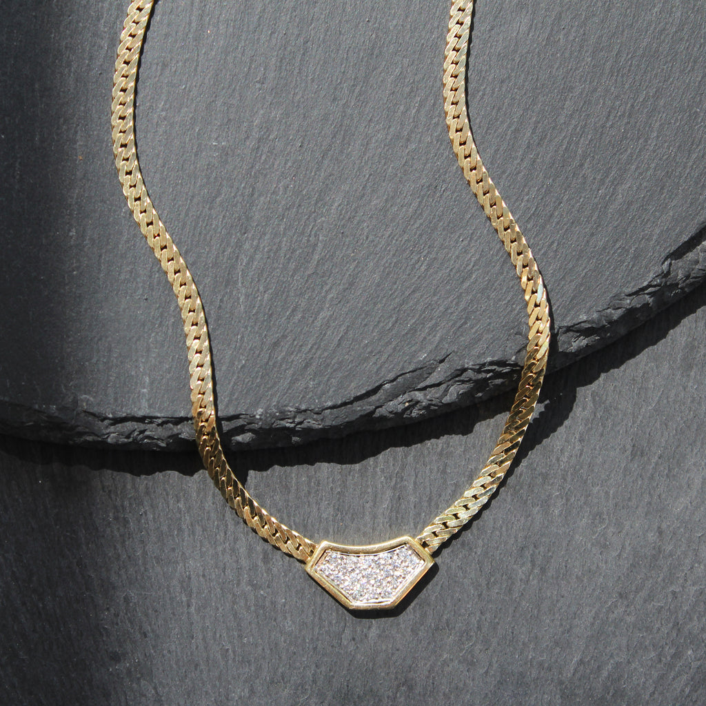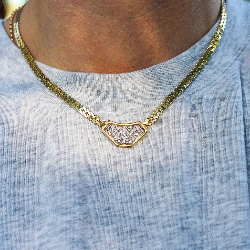 This stunning 14k yellow gold and diamond vintage necklace makes a big statement! Featuring a wide tight curb link chain with a geometric plate in the center and round cut diamond details within the plate. It packs a hefty punch and is truly a one of a kind find for any jewelry lover!