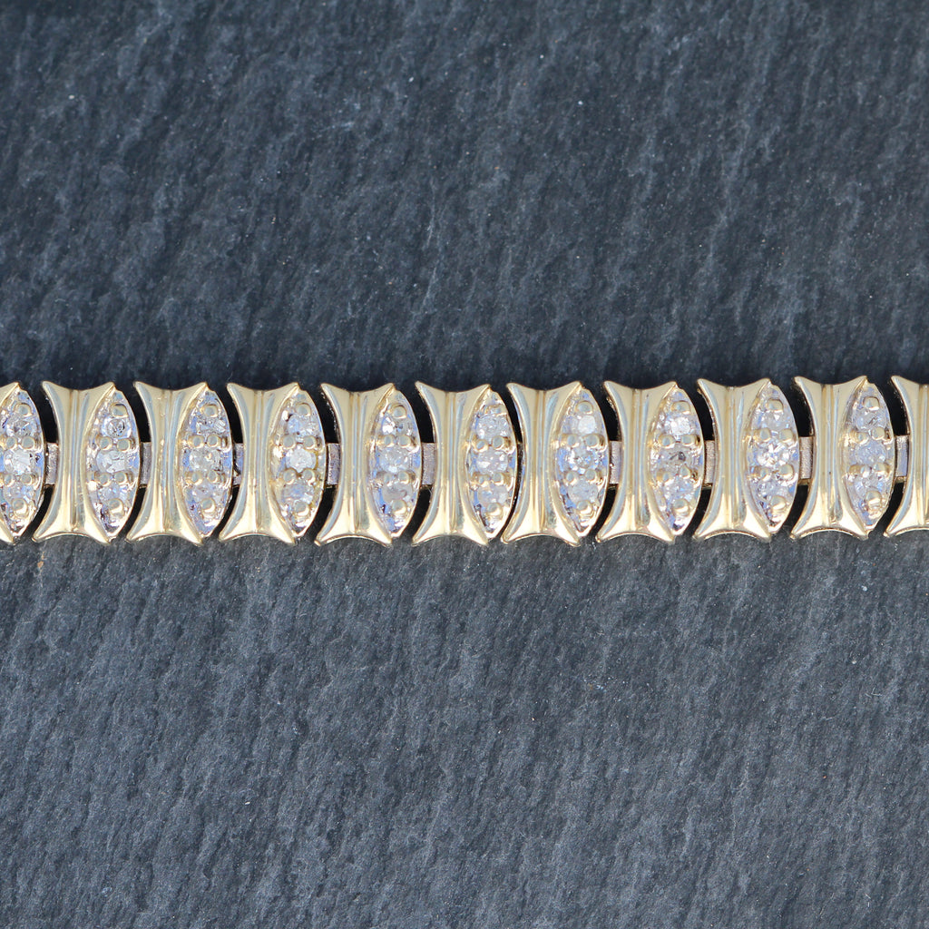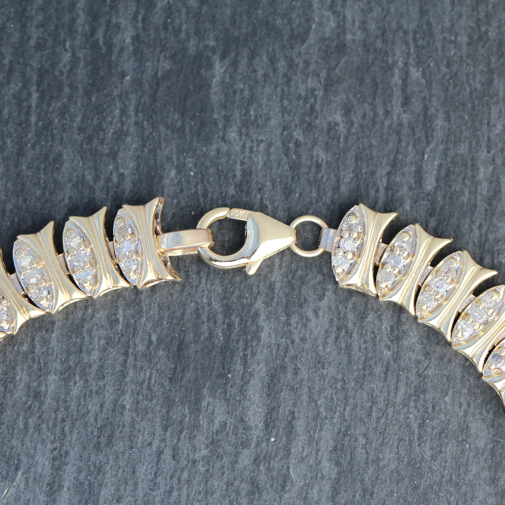 This stunning, vintage 10k yellow gold tennis bracelet features round cut diamonds set in marquise shaped links throughout. With 1.1TCW and a hefty buttery yellow gold, this gem is a sparkly piece perfect for any occasion!