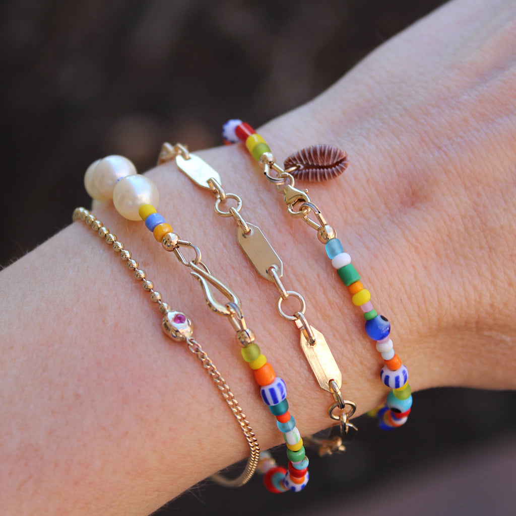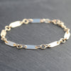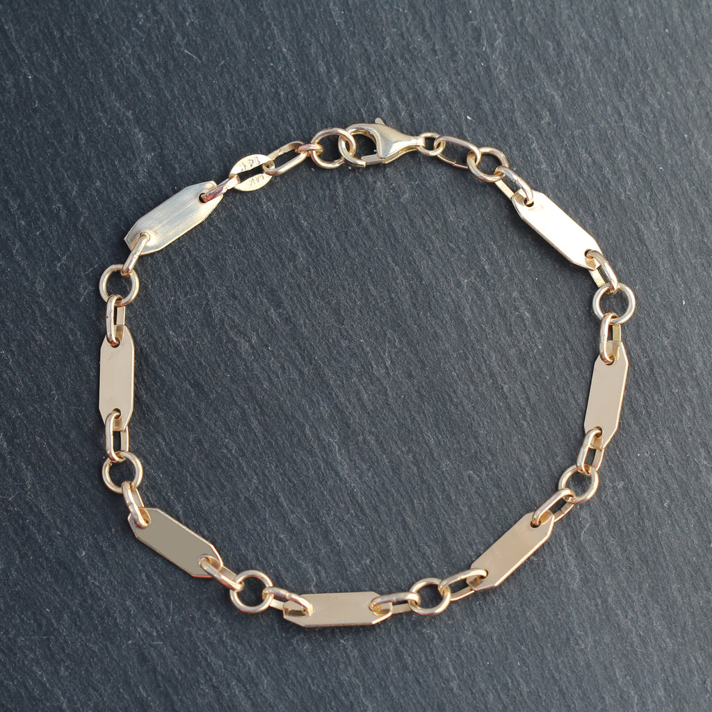 This unique, hefty 14k yellow gold bracelet features long bar link styles that we created using scrap gold and vintage recycled gold with round and oval links in between, creating a one of a kind, ethically made gem!