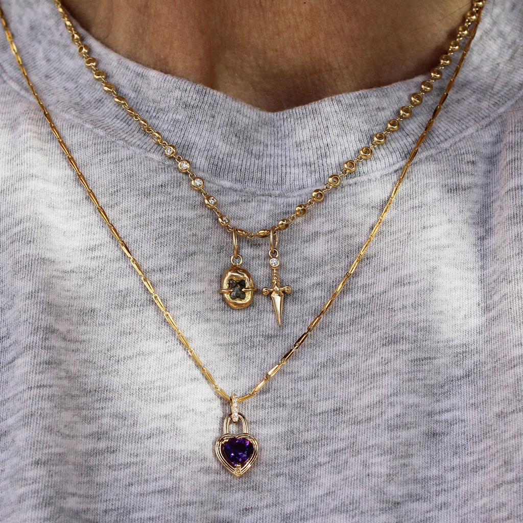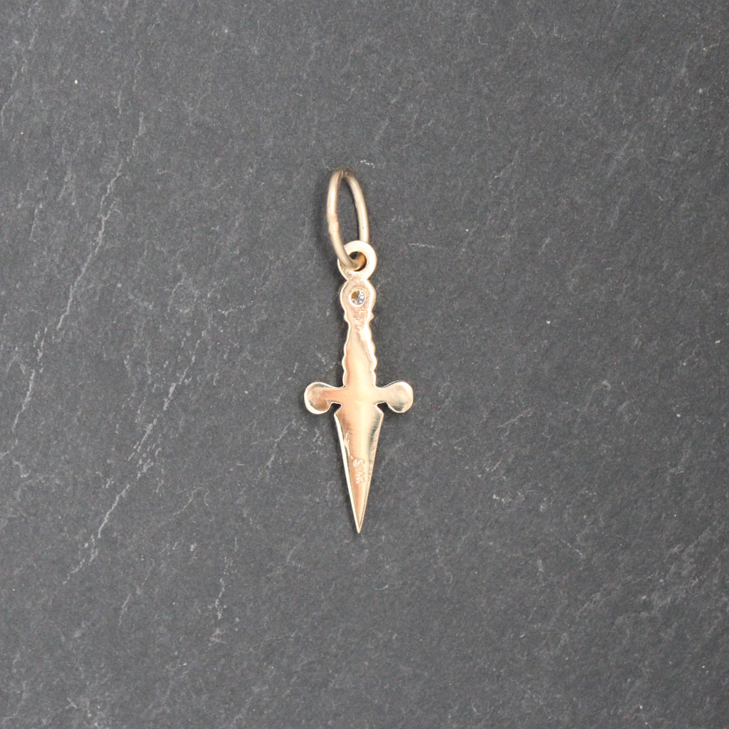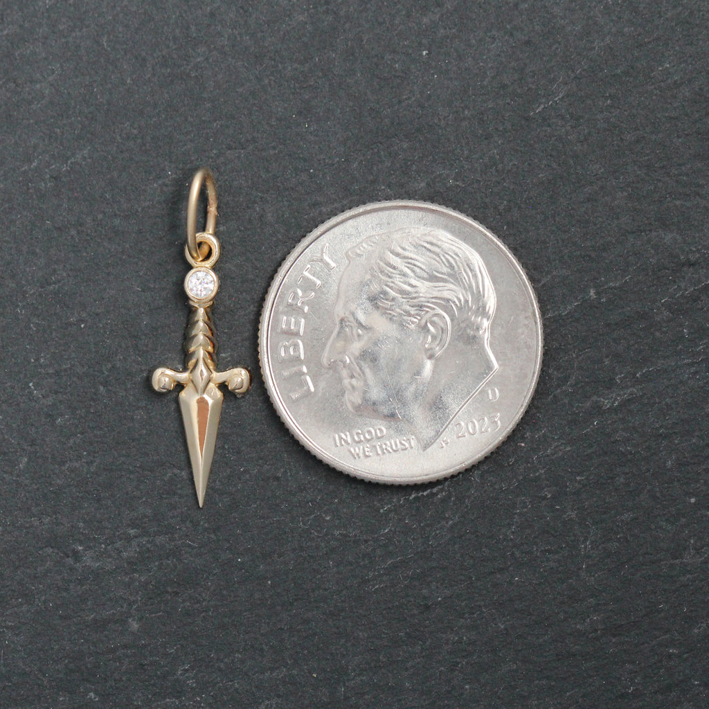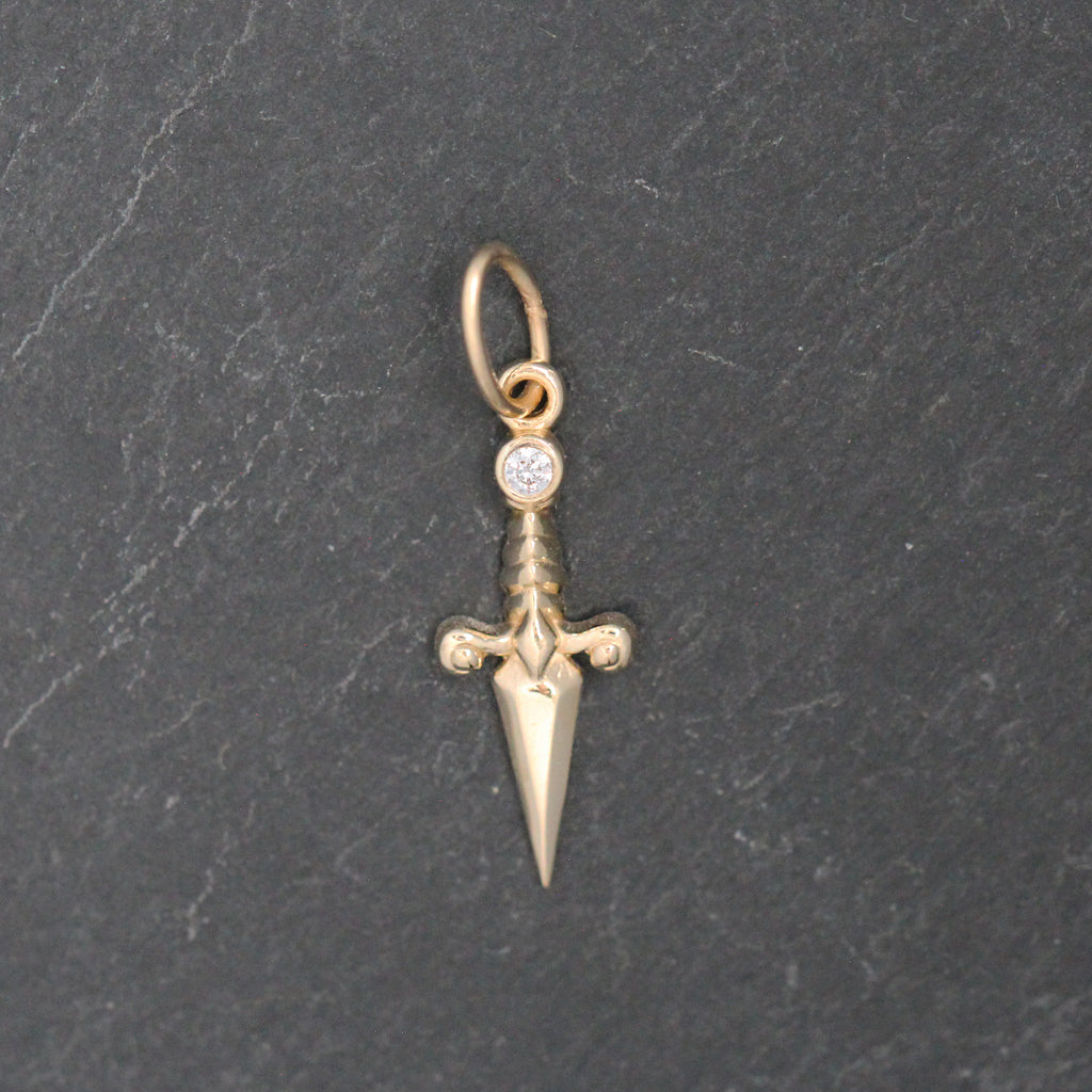 This adorable 14k yellow gold dagger charm features intricate details throughout the handle with a knife cut finish at the sword and a round cut bezel set diamond at the top.