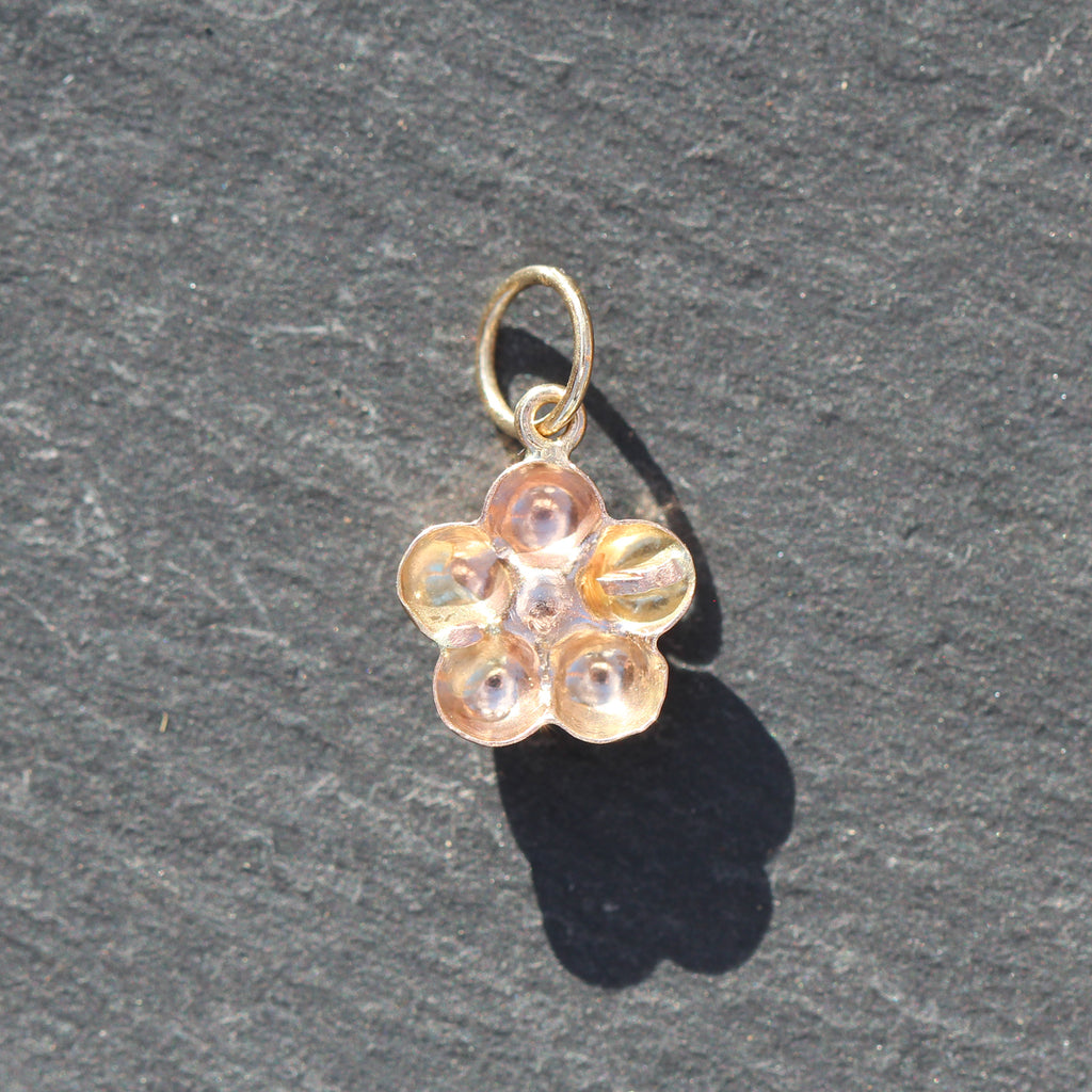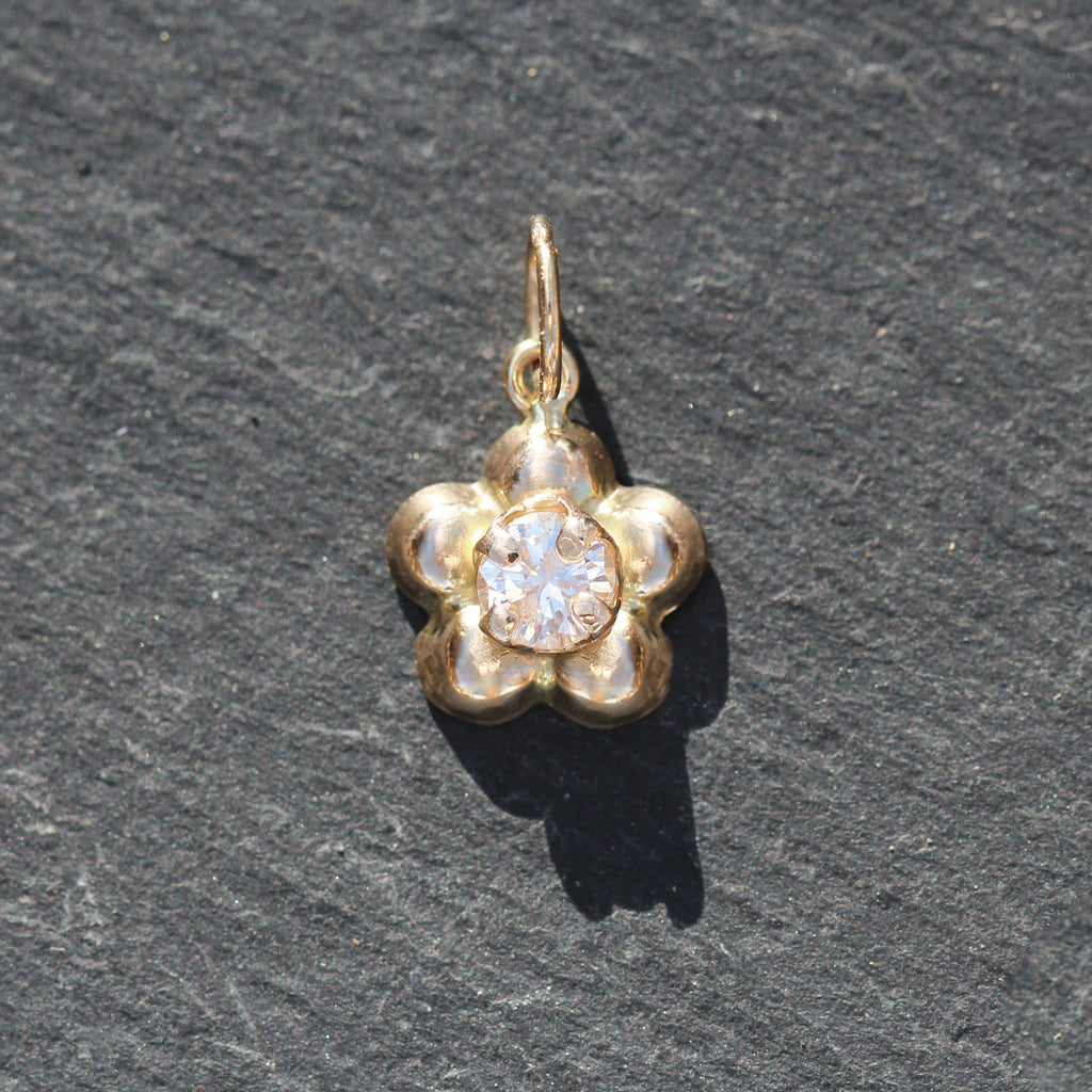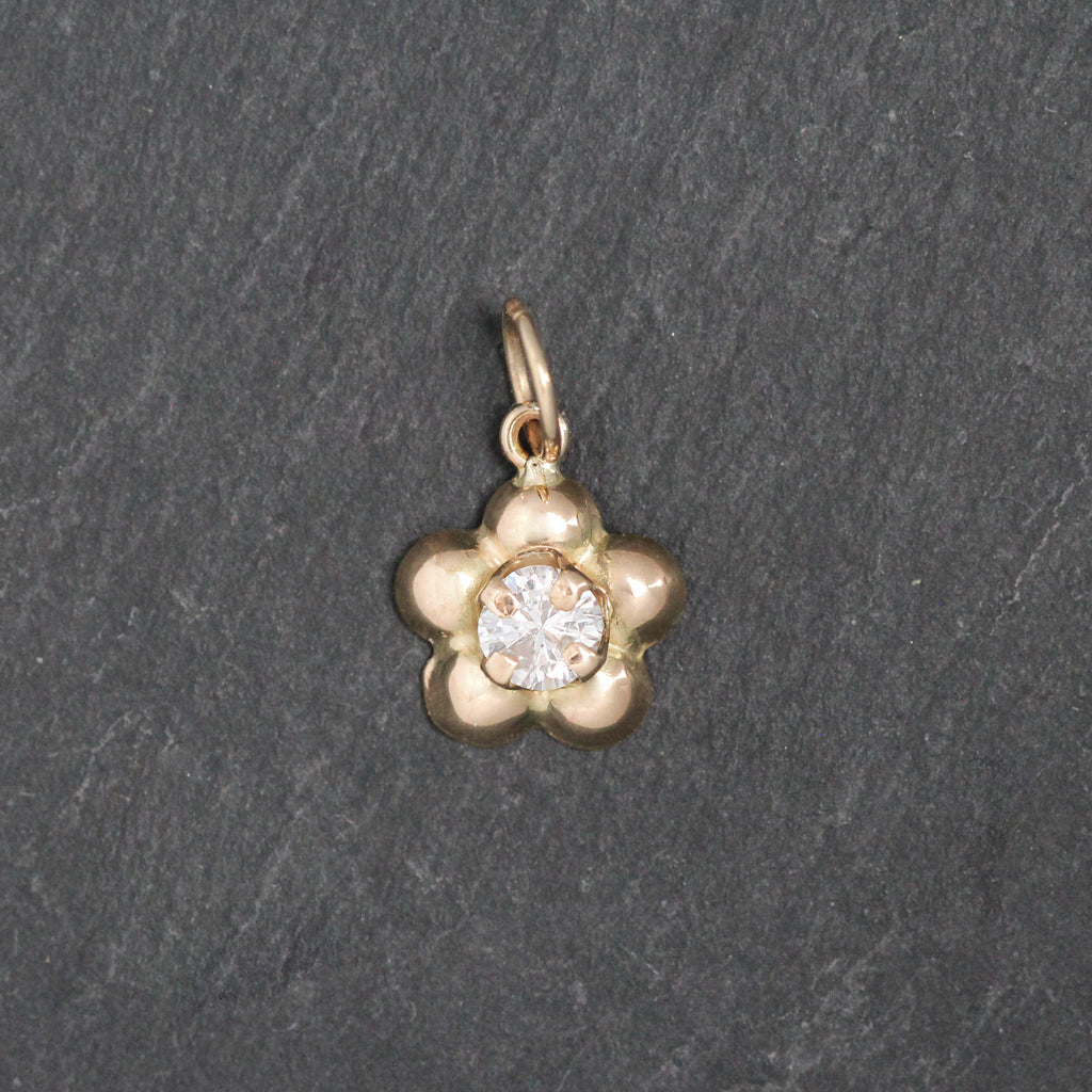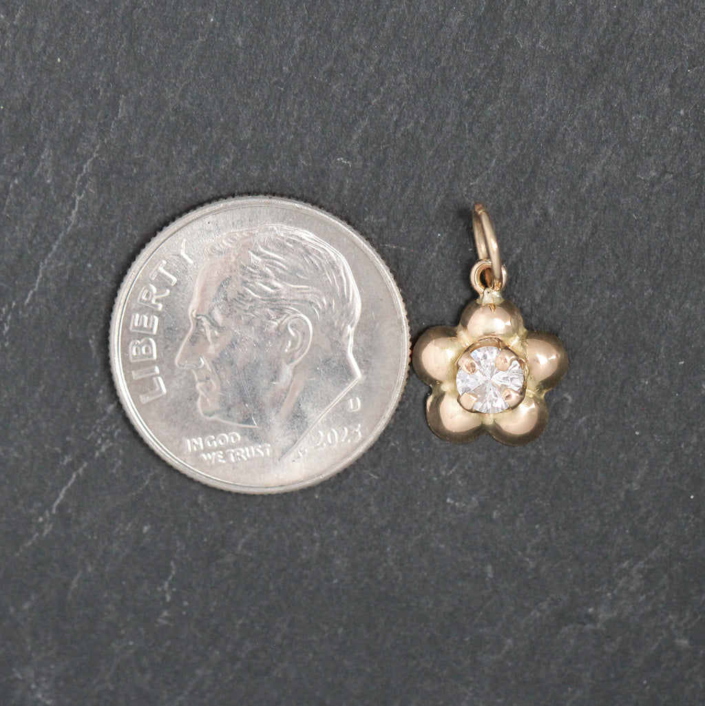 This beautiful 14k yellow gold and diamond charm features a round cut 4 prong set diamond in the middle of a daisy like flower setting.