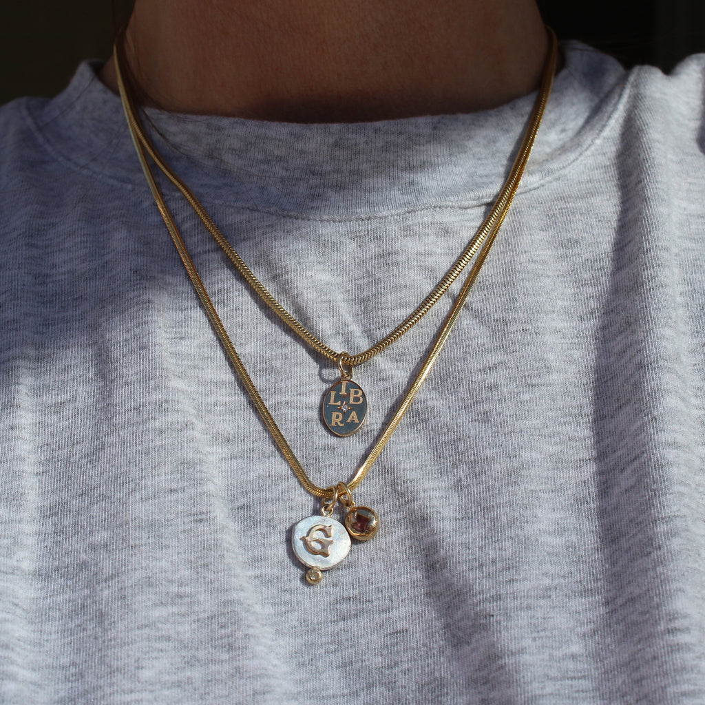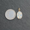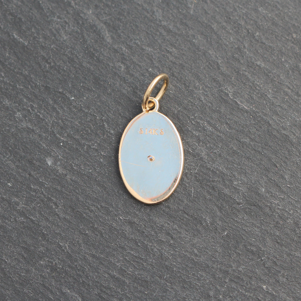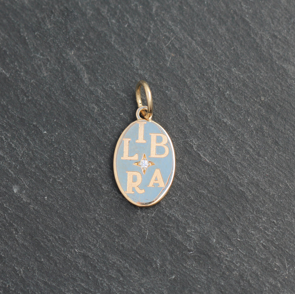 This beautiful 14k yellow gold astrology pendant features the letters for Libra scattered throughout the edges with a starburst style diamond set in the center. It's a great add to any neckmess and makes a great gift as well!