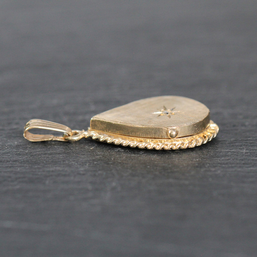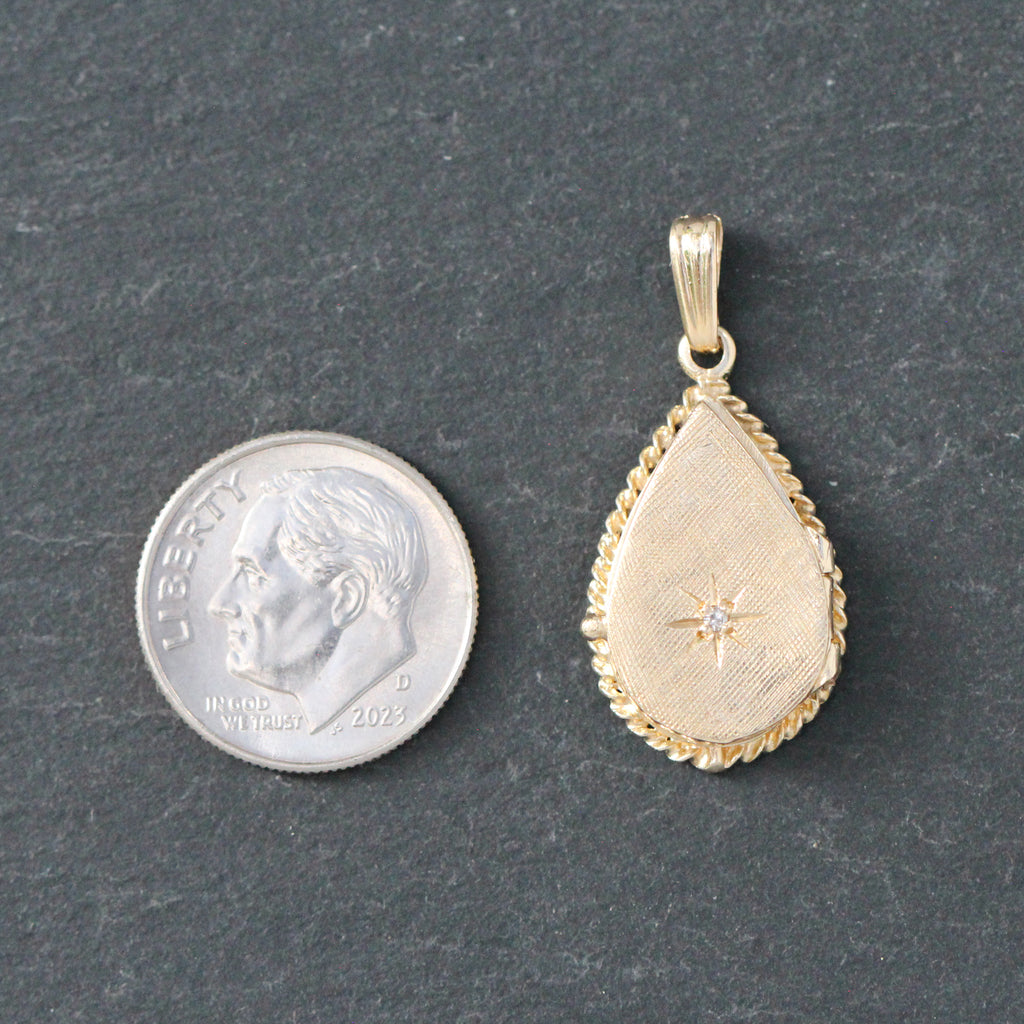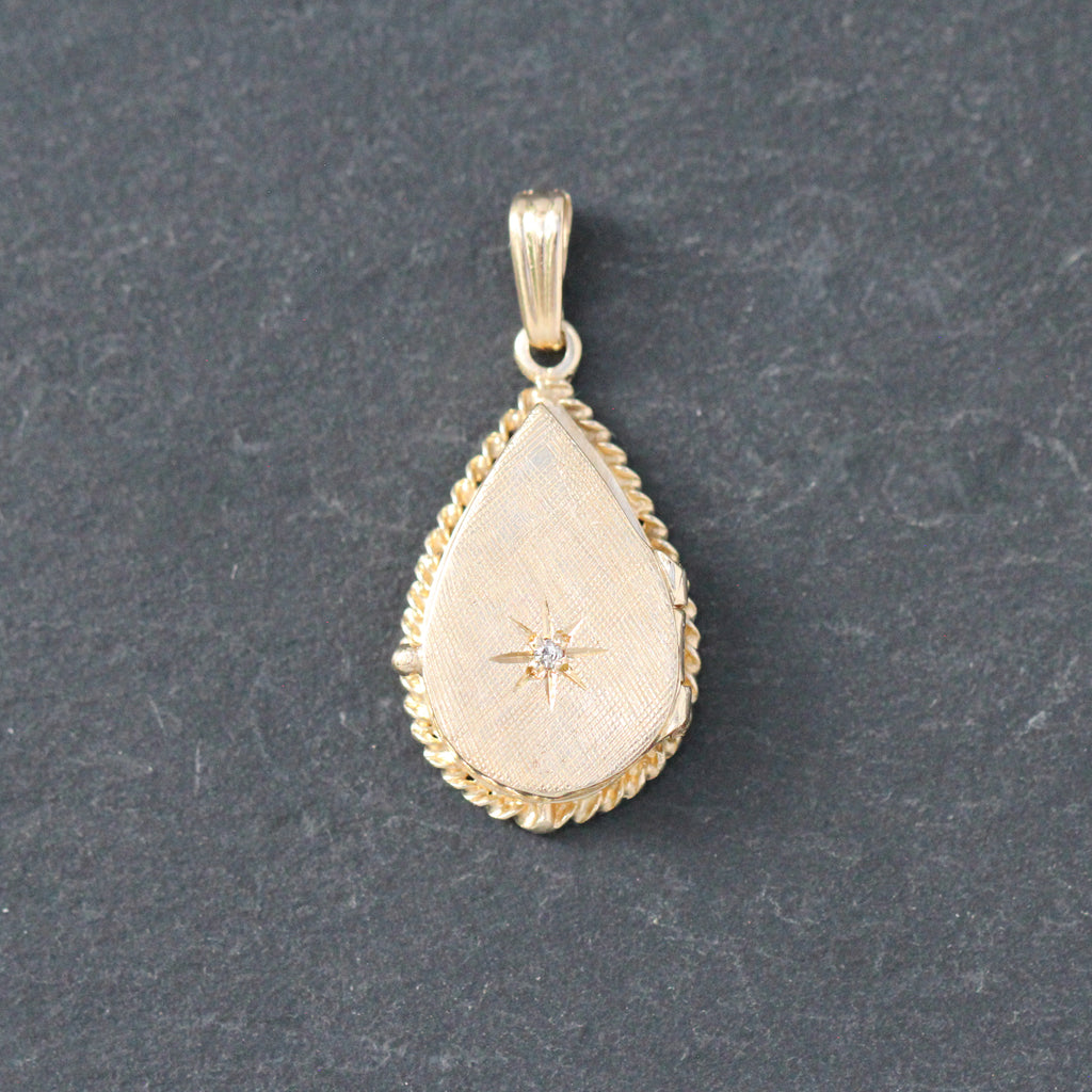 This beautiful 14k yellow gold vintage locket features a tear drop shape with a textured face and a round cut starburst set diamond in the center. Wrapped with rope style detailing on the edges.
