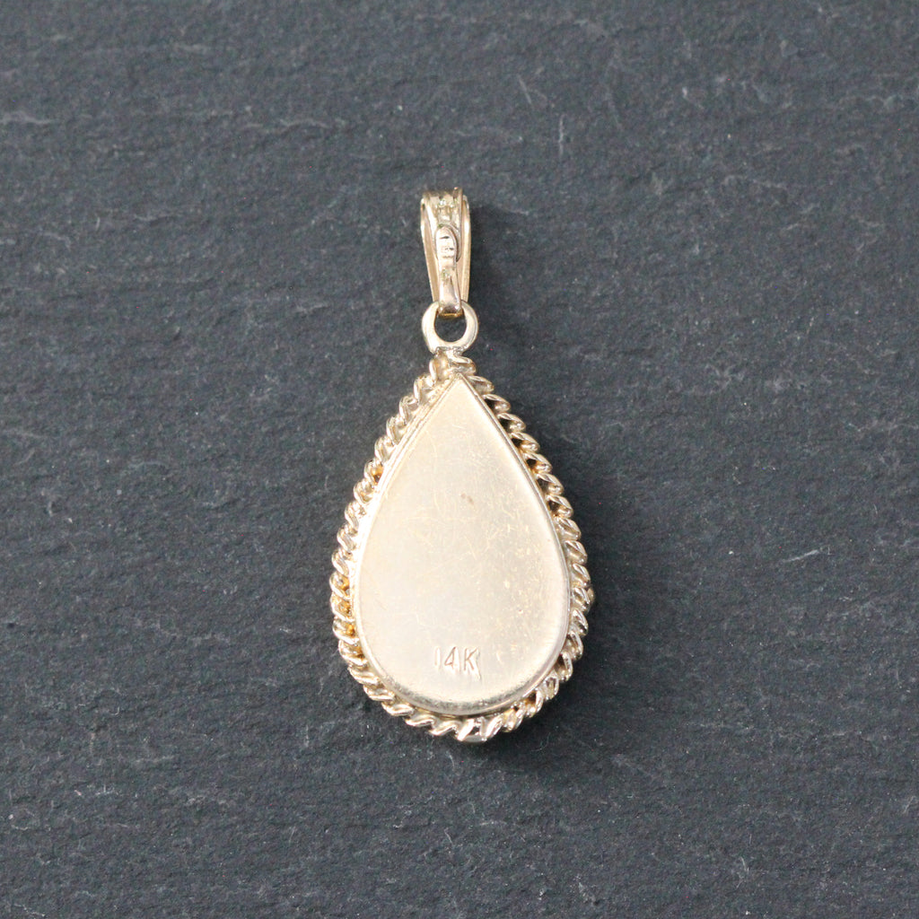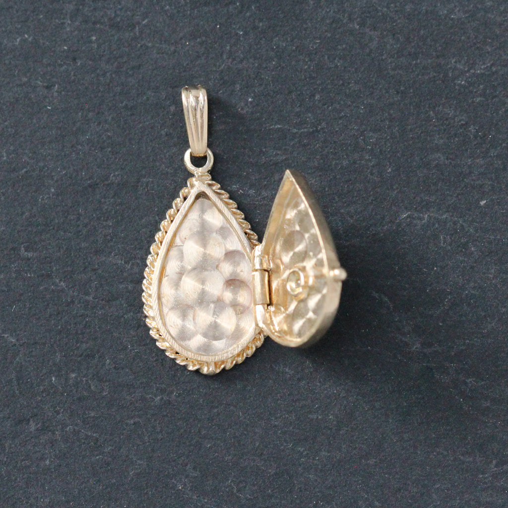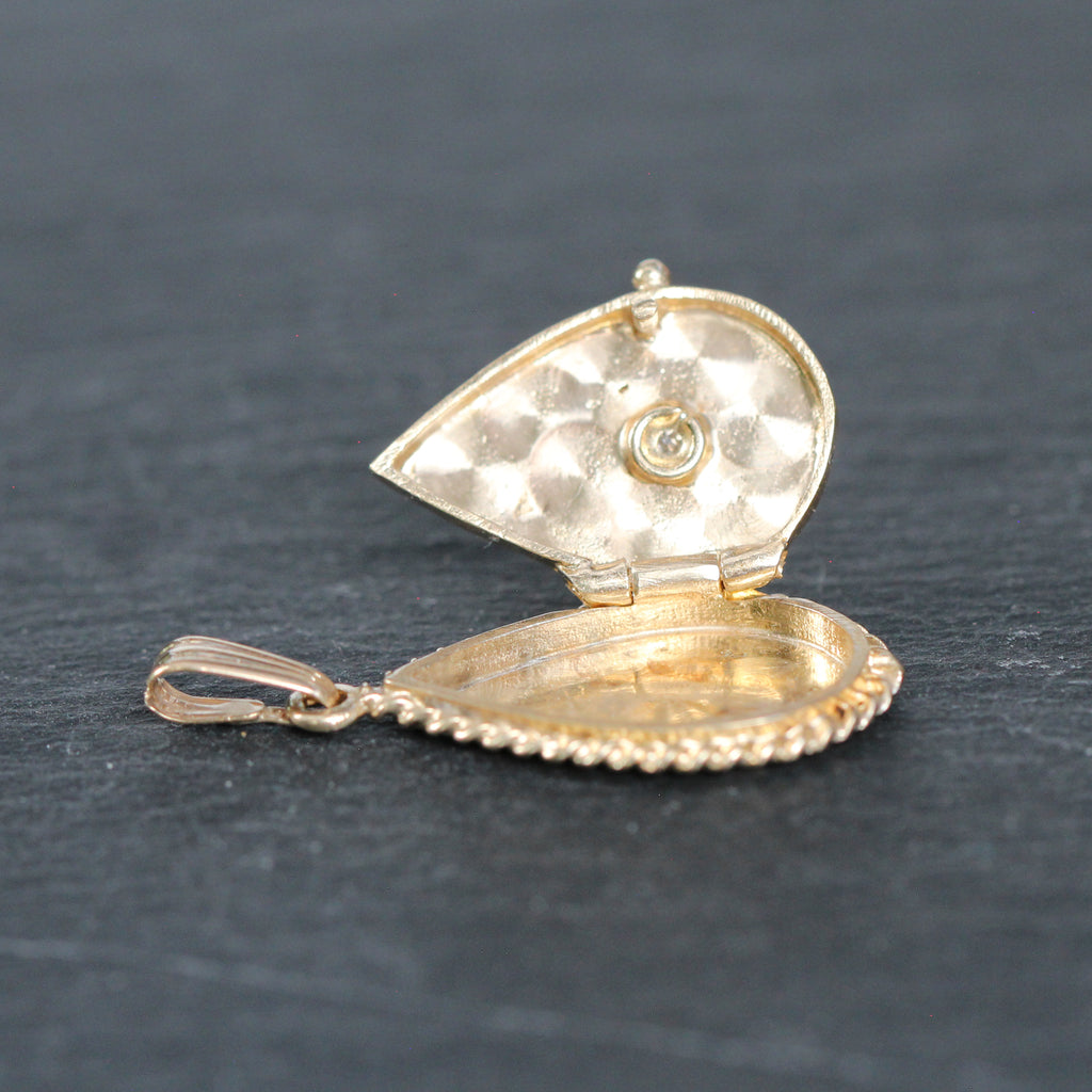 This beautiful 14k yellow gold vintage locket features a tear drop shape with a textured face and a round cut starburst set diamond in the center. Wrapped with rope style detailing on the edges.
