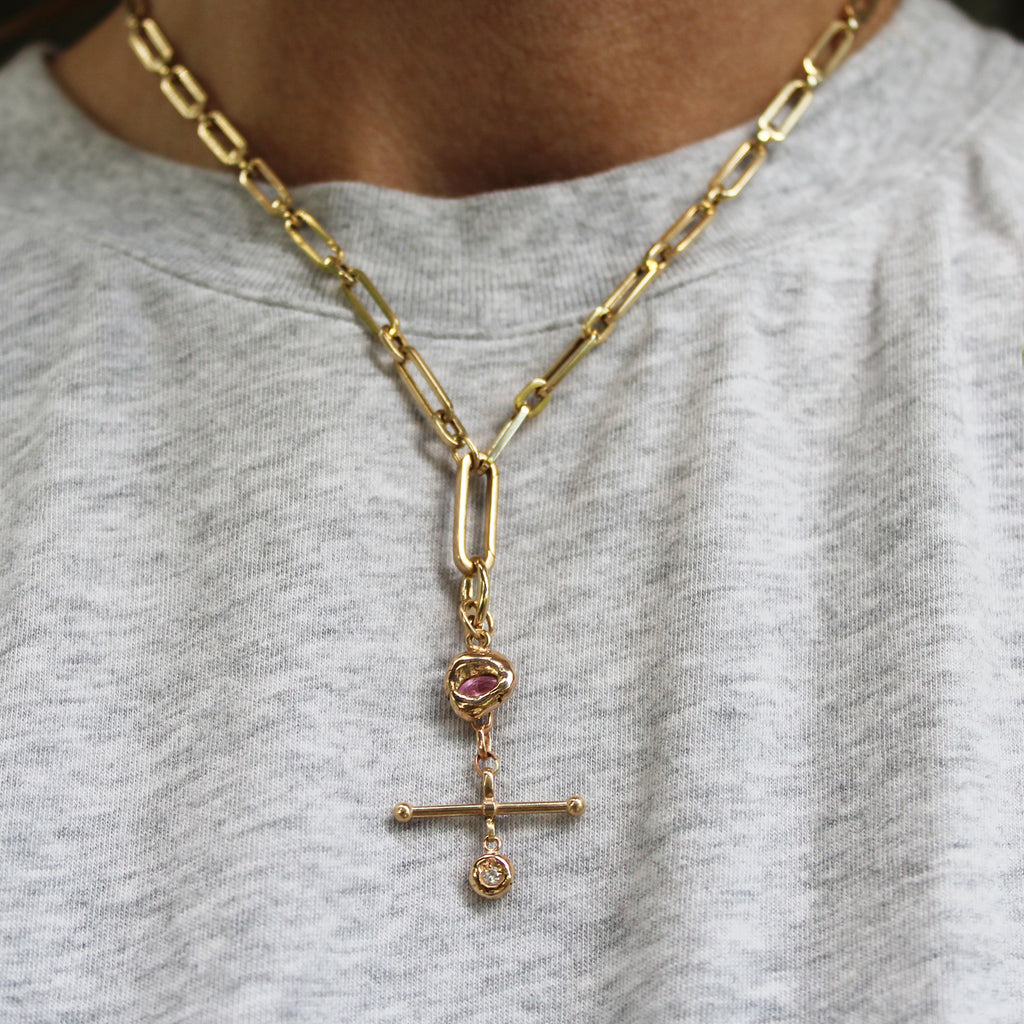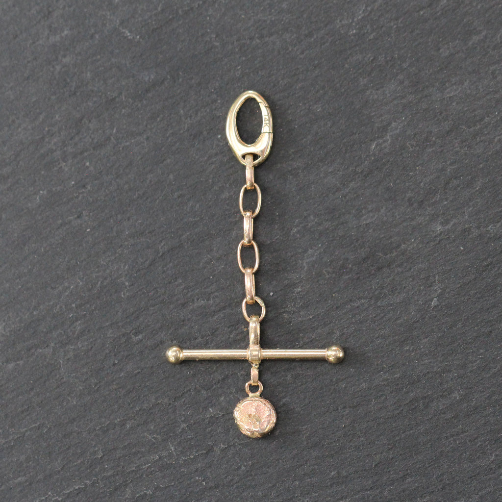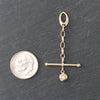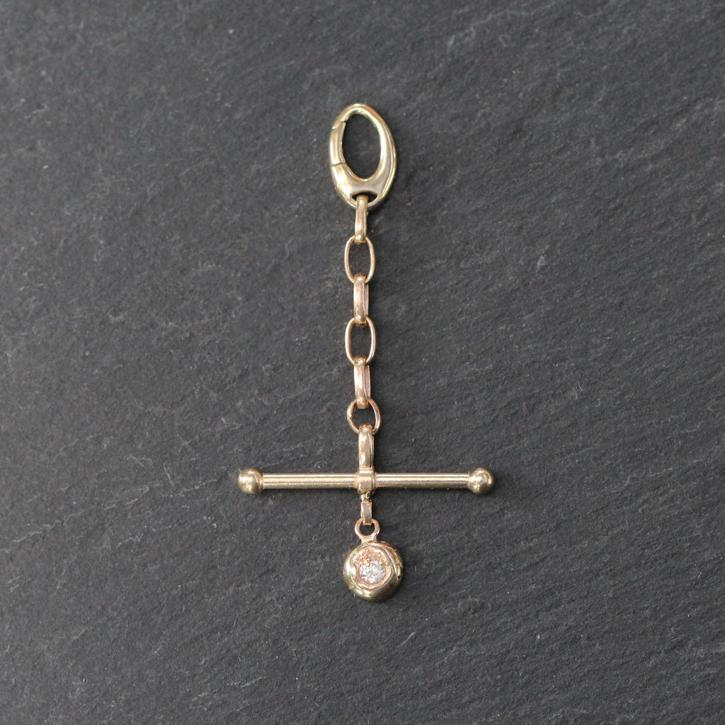 This 14k yellow gold and Diamond Pendant Enhancer Lock features an oval hinge clip lock at the top with elongated rolo links below, a toggle bar and an organic bubble diamond charm dangling at the bottom. It's a great way to switch out charms on your necklaces or used as a pendant on its own!