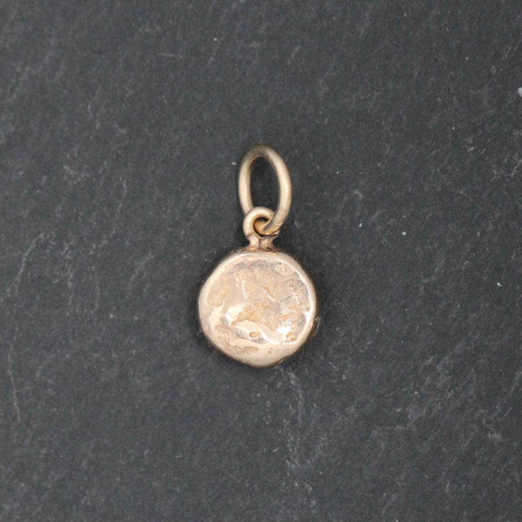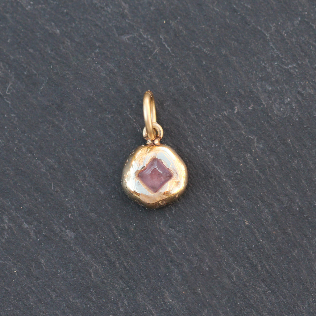 This adorable 14k yellow gold and mauve sapphire charm has been made completely of recycled materials! Featuring a 14k yellow gold organic shaped disc made from scrap gold melted down and reformed with a princess cut mauve sapphire flush set in the center. Topped off with a high polish finish!