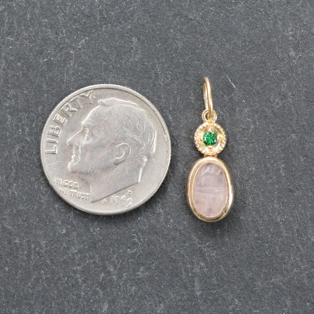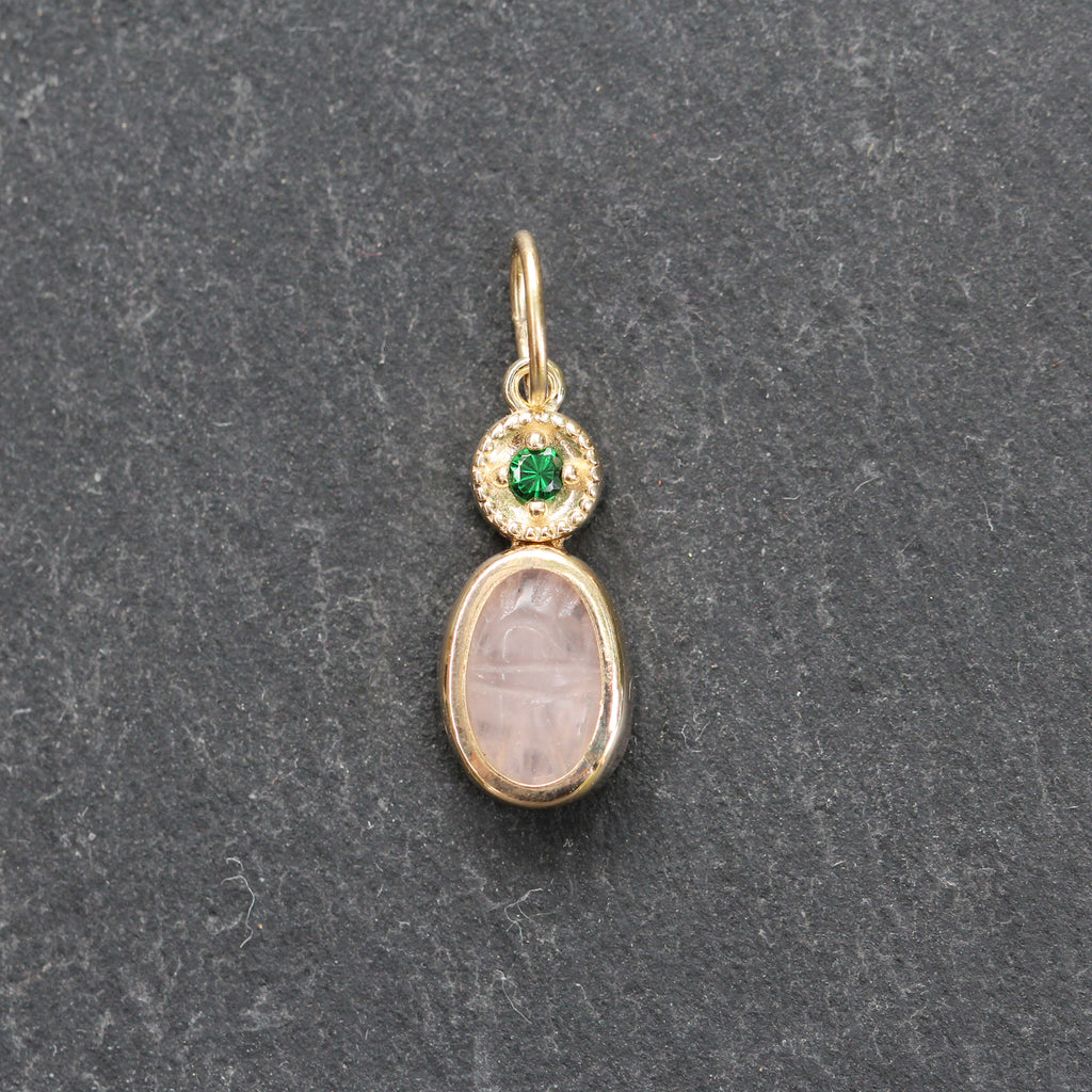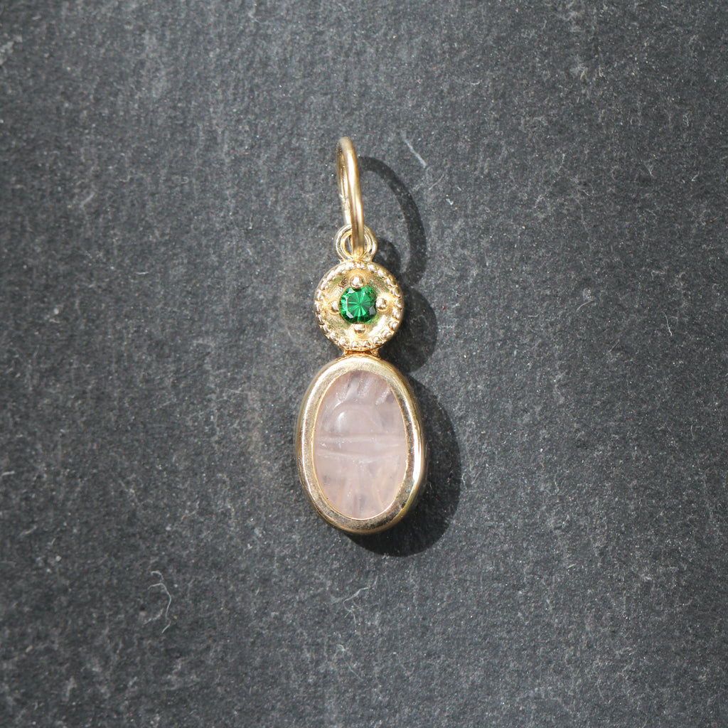 This beautiful 14k yellow gold and rose quartz scarab pendant is truly a rich pop of color! Featuring carved quartz into a scarab beetle, framed in 14k gold and accented with a repurposed round beaded detailed prong set tsavorite at the top creating an ethical, one of a kind talisman pendant!