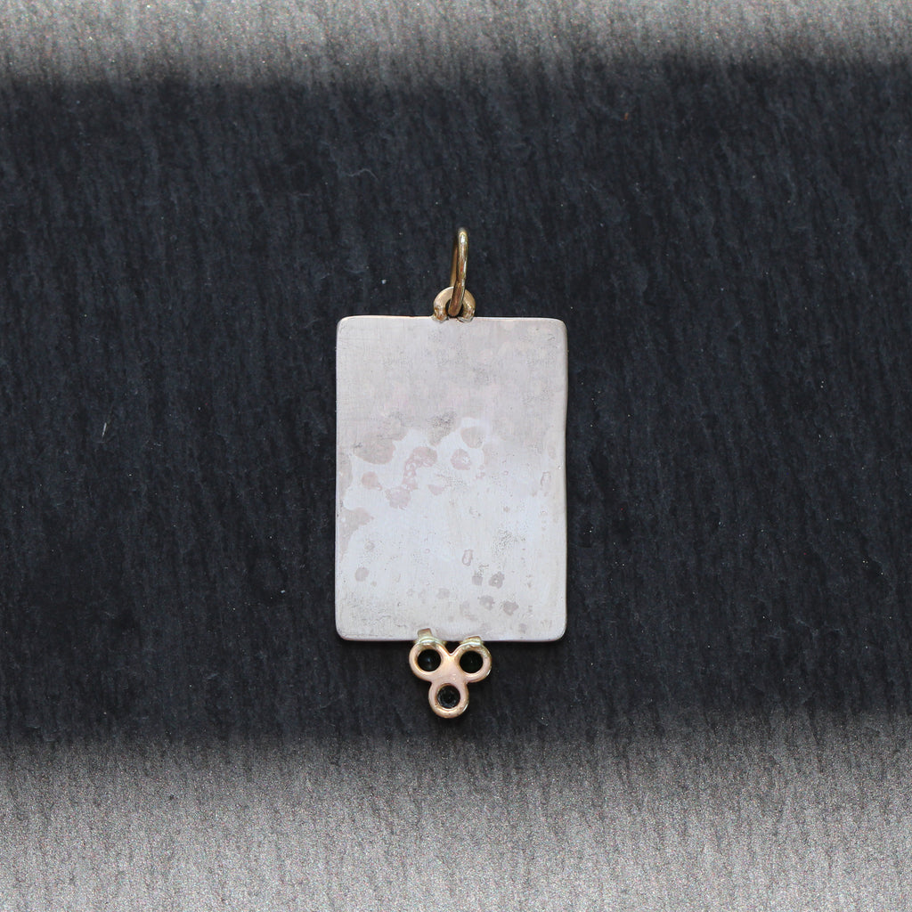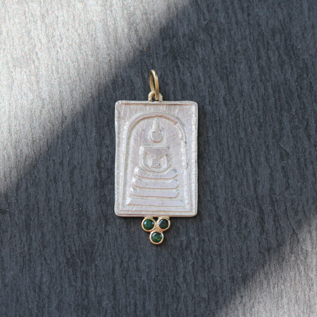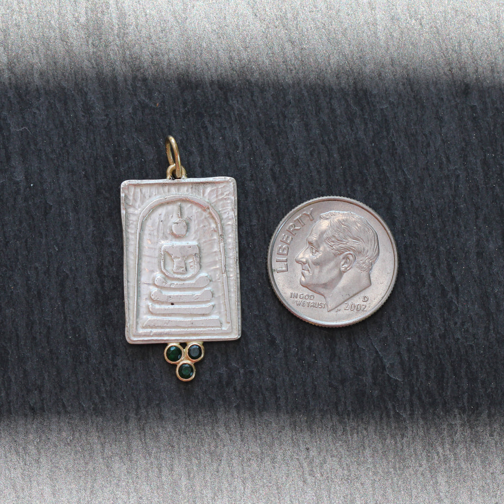 This beautiful mixed metal 14k gold and sterling silver pendant has been etched by us to depict a sitting buddha using recycled melted down and hammered out sterling silver. It features 3 round cut 14k yellow gold bezel set tsavorite at the base, and 14k yellow gold bail at the top!