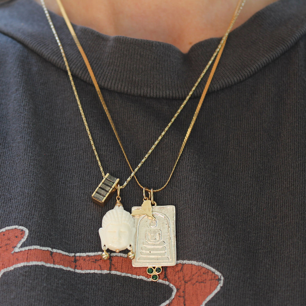 The Buddha is a symbol that brings bright energy, wealth + joyful blessings to its wearer.