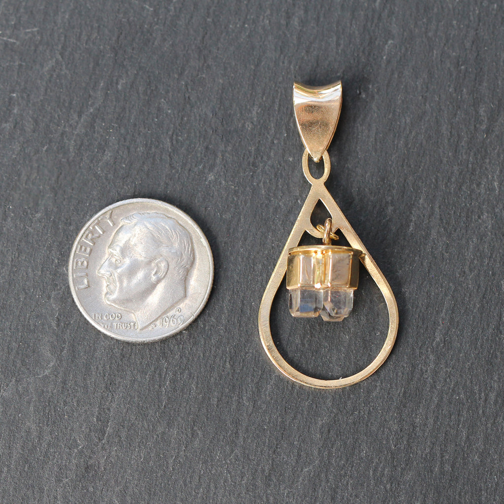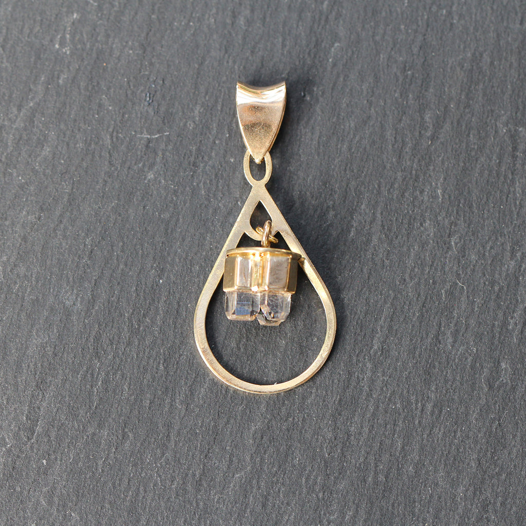 This beautiful pendulum talisman features 18k yellow gold hardware with 3 clear quartz crystal points dangling in the center of a tear drop shaped open frame.