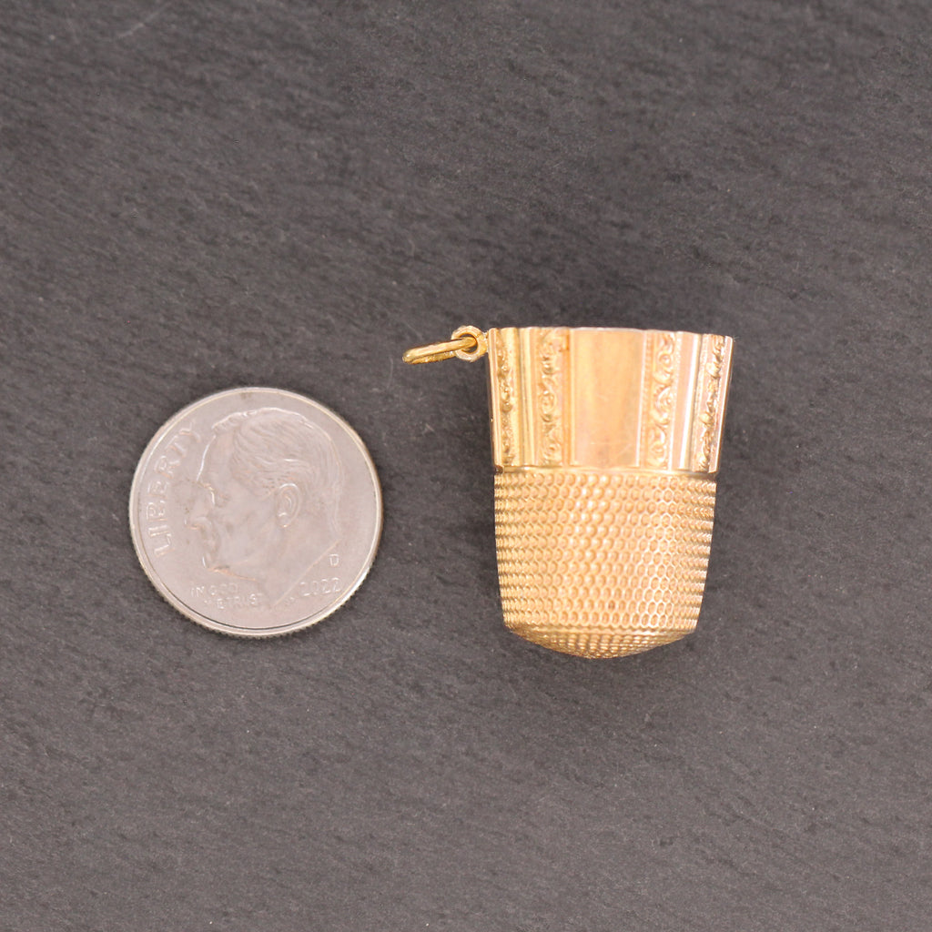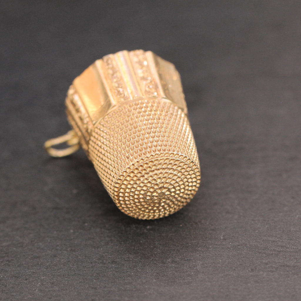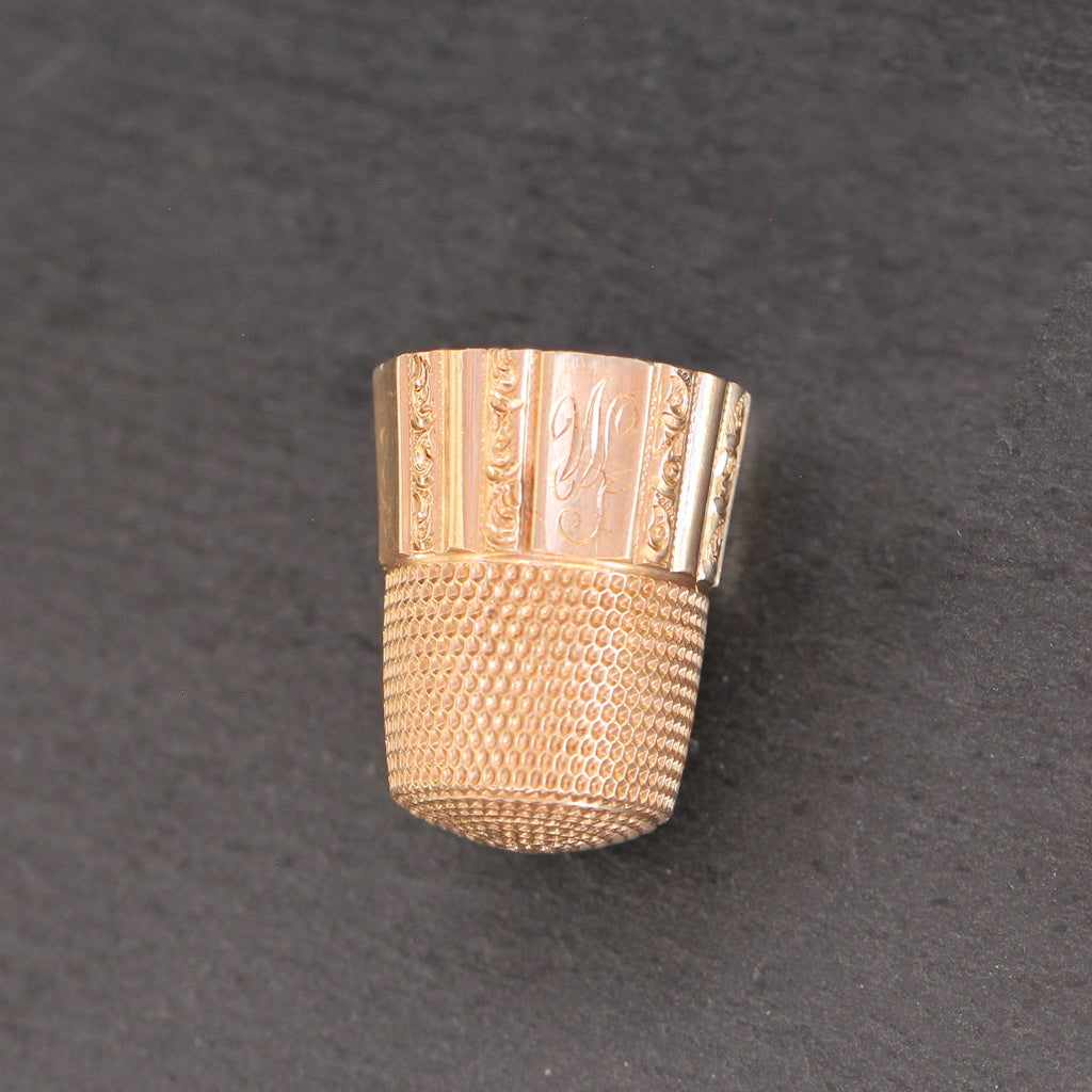 This gorgeous 10k yellow gold thimble features intricate etching throughout along with the textured detail at the base as a real thimble would! There are 2 engravings one with a stylized WT and the other engraving is an 11. This is truly a rare find! Circa pre-1930's.