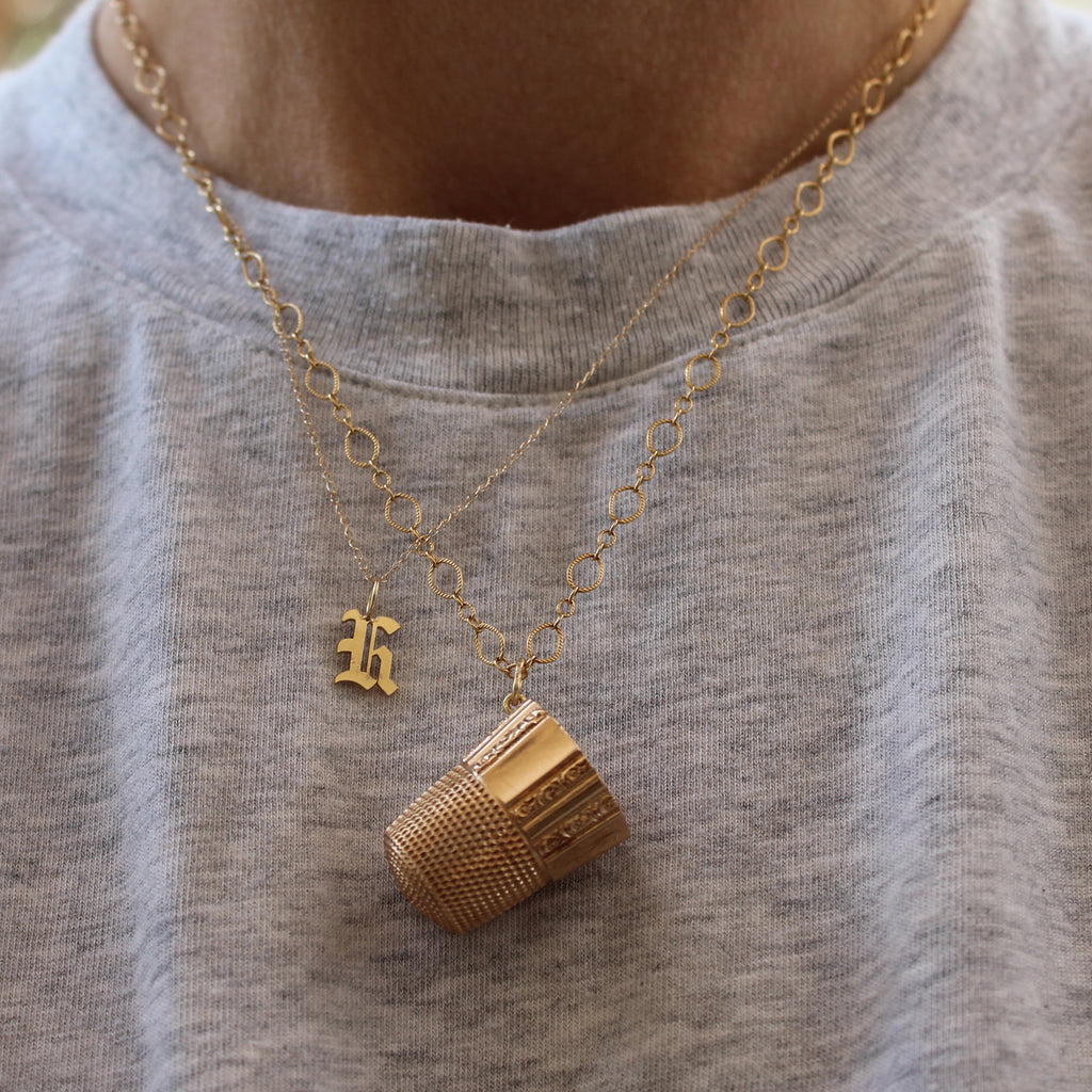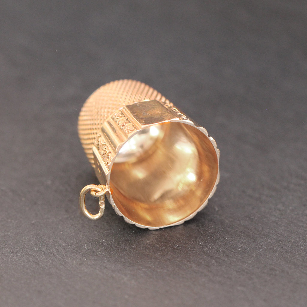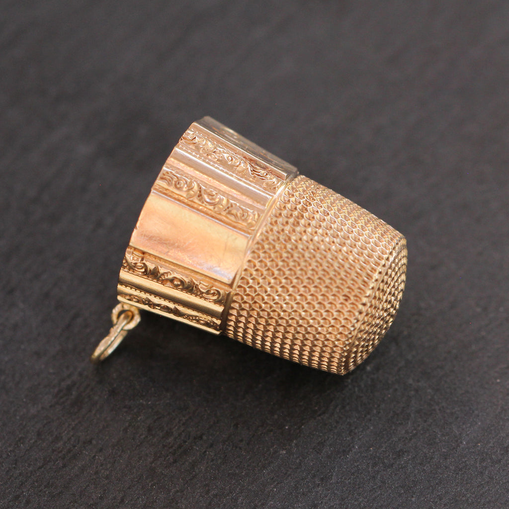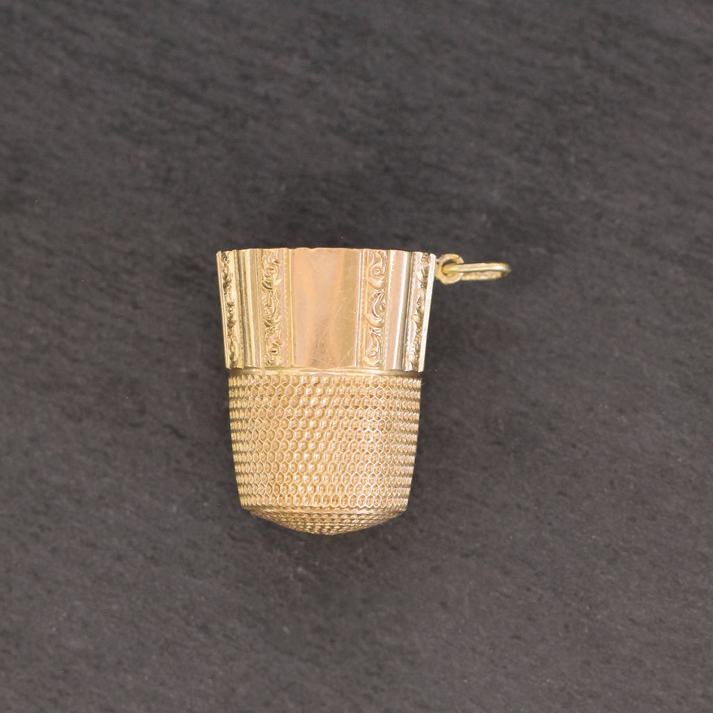 This gorgeous 10k yellow gold thimble features intricate etching throughout along with the textured detail at the base as a real thimble would! There are 2 engravings one with a stylized WT and the other engraving is an 11. This is truly a rare find! Circa pre-1930's.