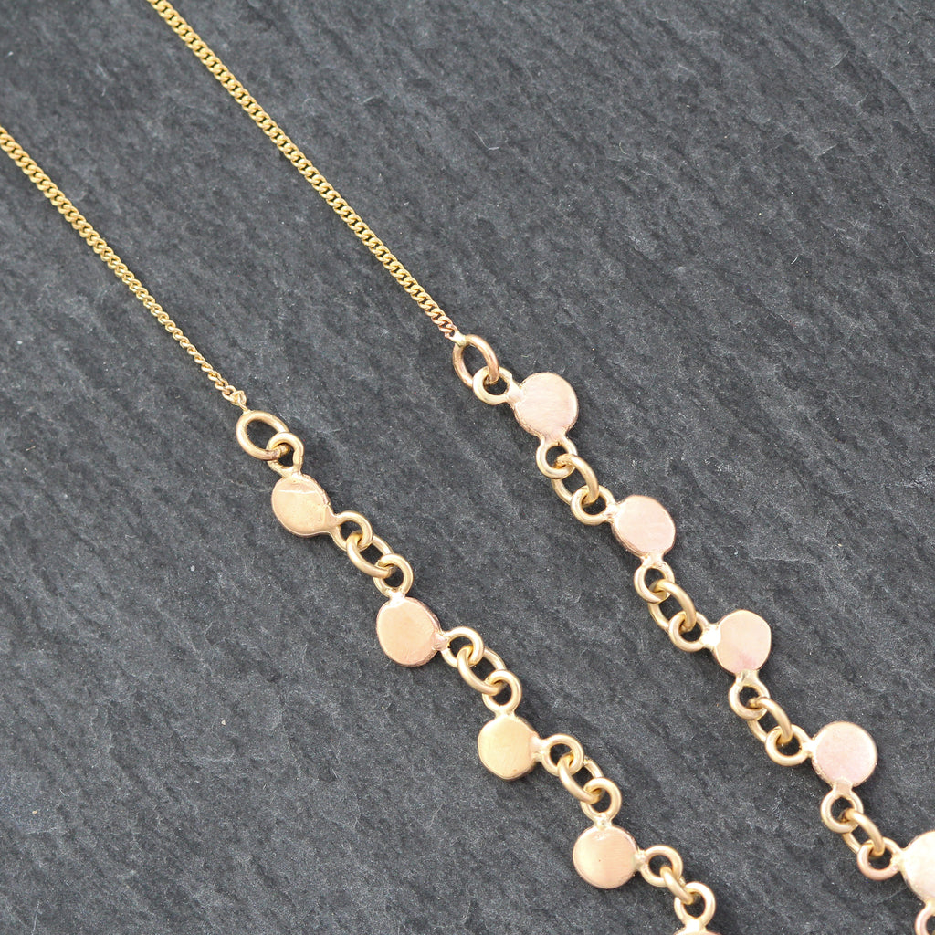 This stunning necklace has been hand crafted by us using 100% recycled materials! The chain features gold disc links that were melted down scrap gold that we hammered out into links. It is detailed with a recycled 10k yellow gold organic bubble stationed in the center with a round cut flush set diamond. At each end is a dainty 10k yellow gold curb chain, It's truly an ethical, one of a kind necklace!