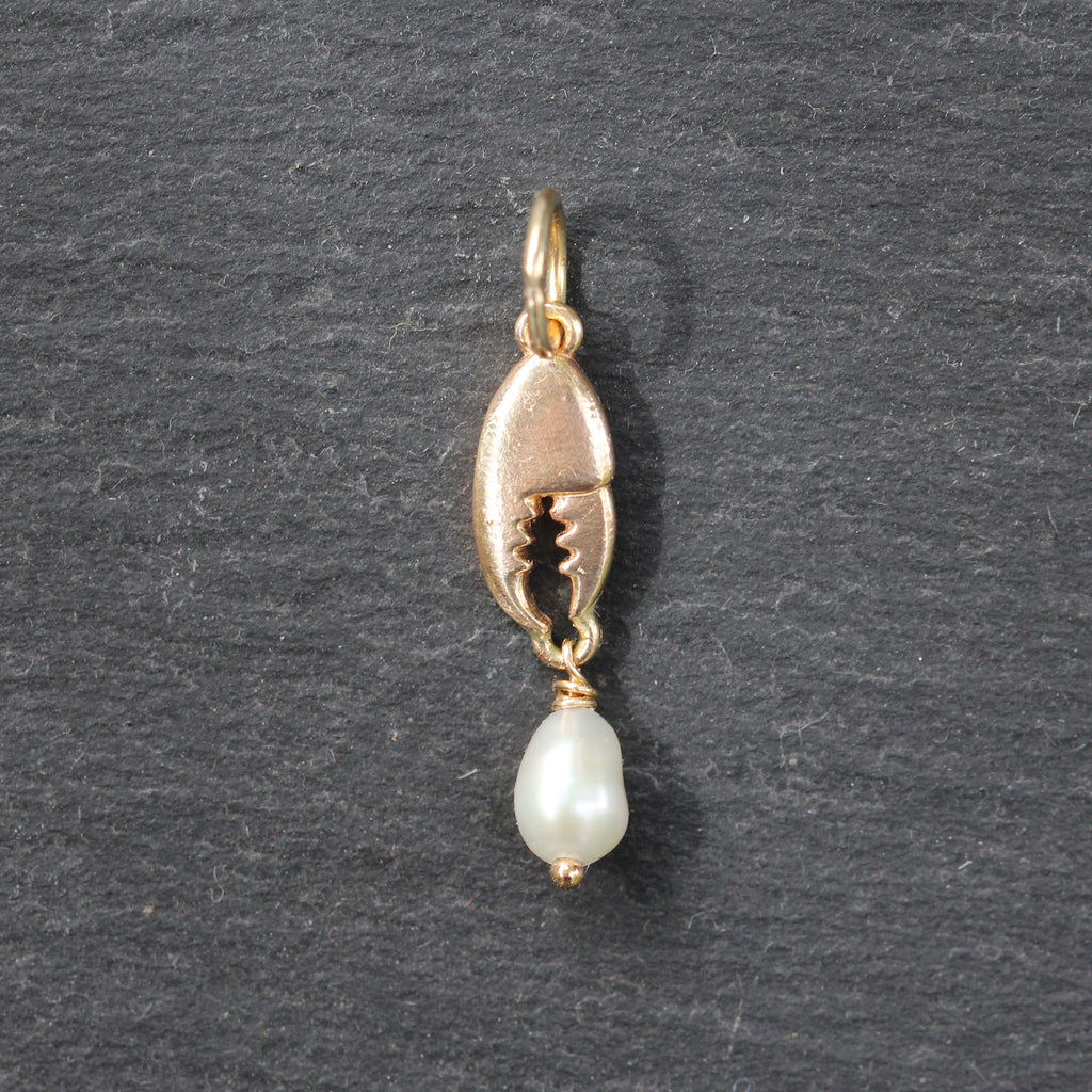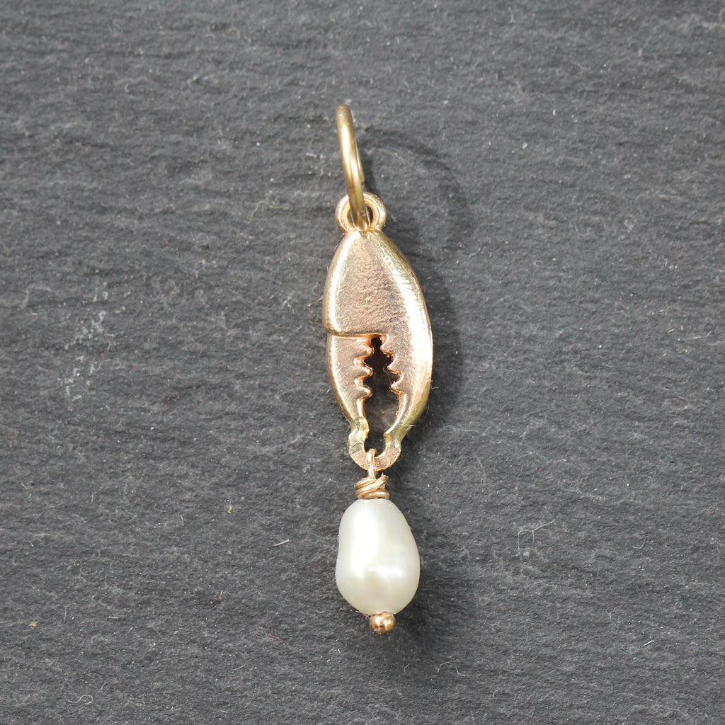 This adorable 14k yellow gold and baroque pearl charm features an intricately detailed lobster claw with a baroque pearl hanging below it. Topped off with a high polish finish!