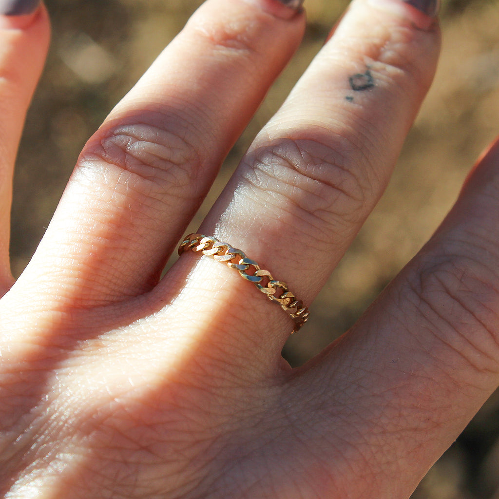 This ring features a 14k yellow gold recycled chain with high polish diamond cut curb links, a simple look on it's own and a great piece to layer and stack with other rings!