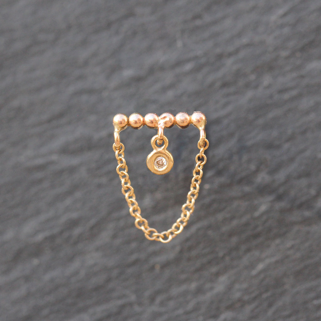 This unique 14k yellow gold and diamond earring features a beaded bar design at the top and has been upcycled by adding recycled 14k gold chain and a round cut bezel set diamond in the center, creating an ethical, one of a kind gem!