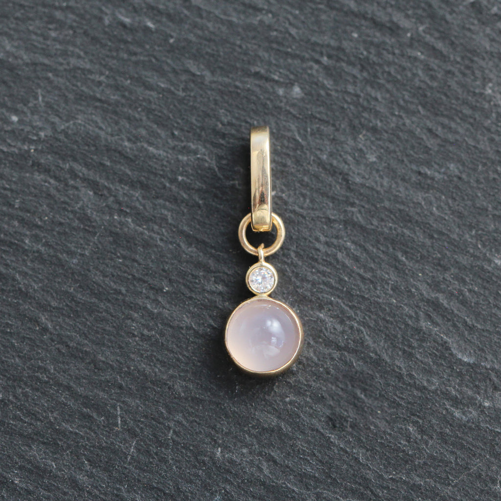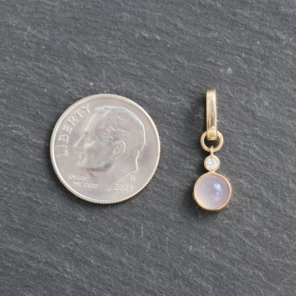 This beautiful 14k yellow gold and chalcedony pendant features a round cut cabochon chalcedony in a bezel setting, detailed with a round cut bezel set diamond at the top. Topped off with a high polish finish!