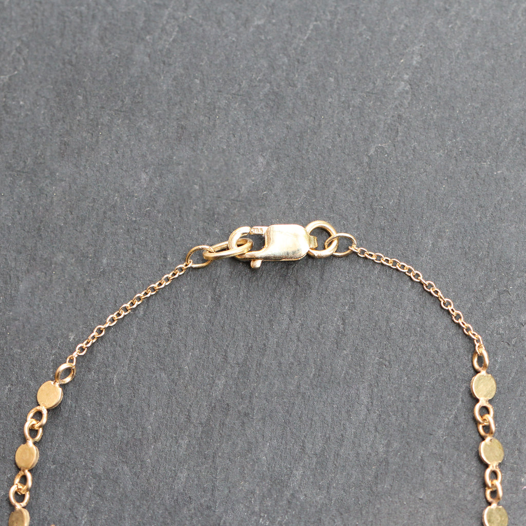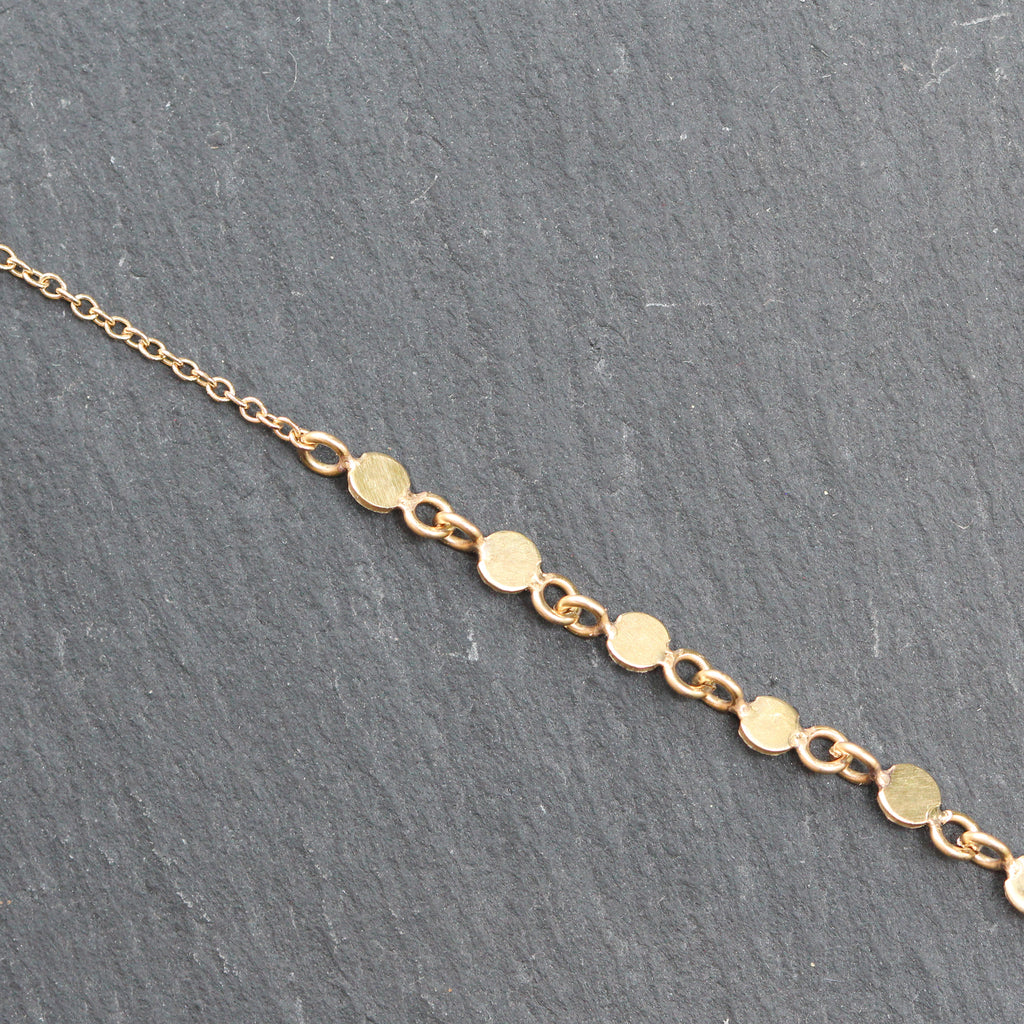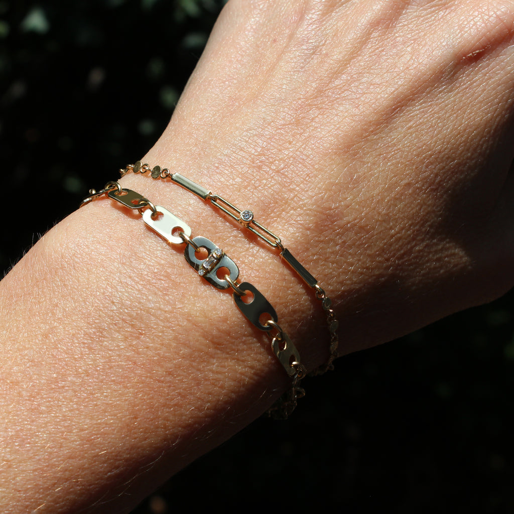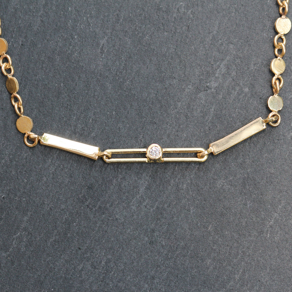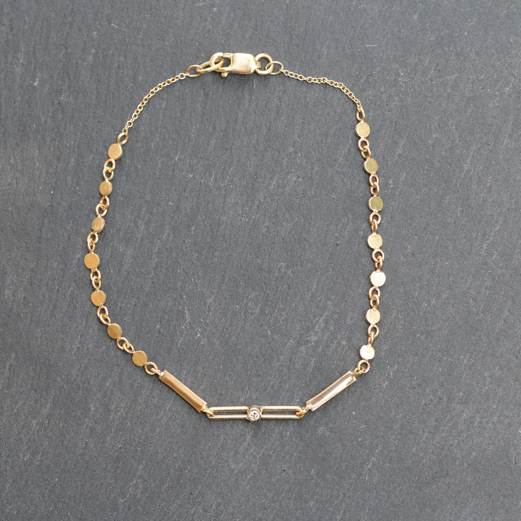 This beautiful 14k yellow gold and diamond bracelet features 3 different chain styles with recycled gold cut disc shape links on either end, 2 bar links, and an elongated style chain at the center detailed with a bezel set diamond.