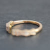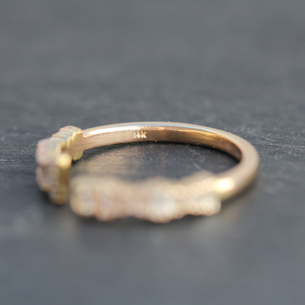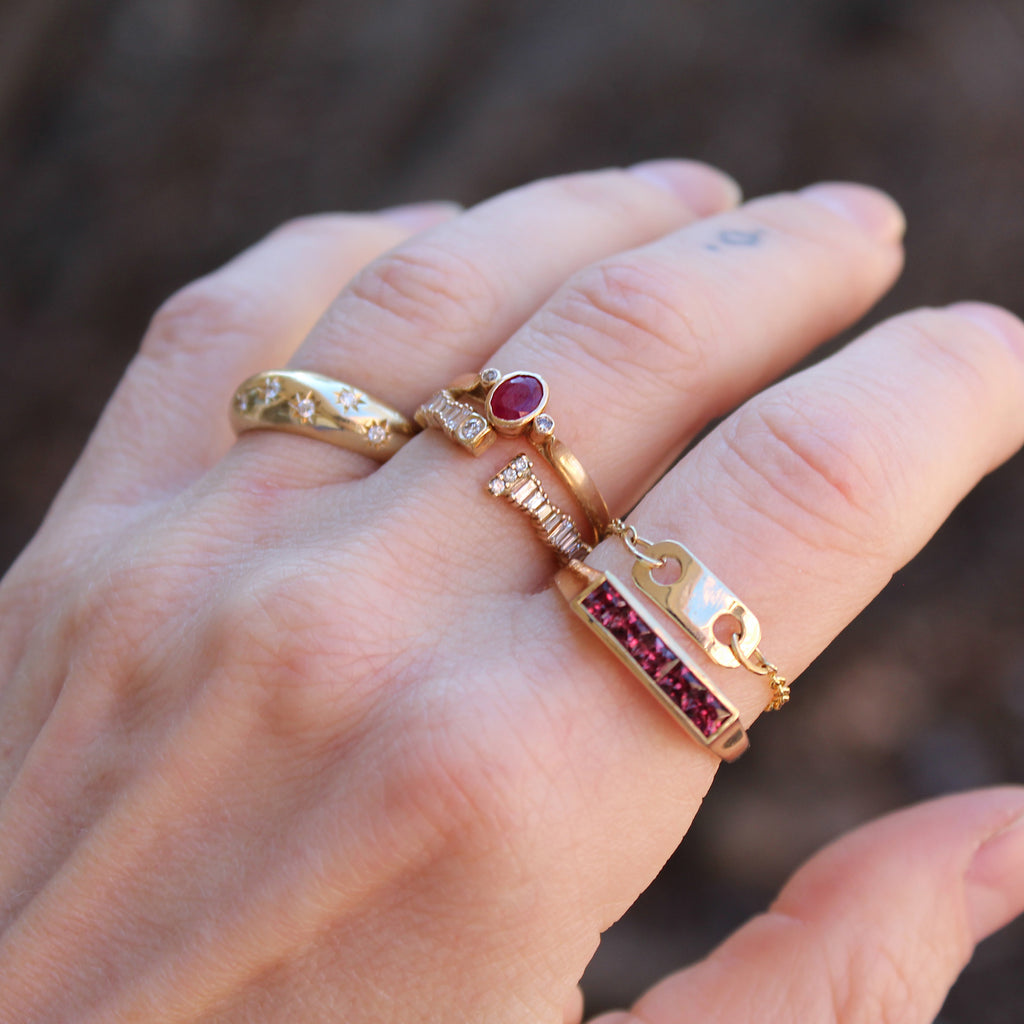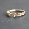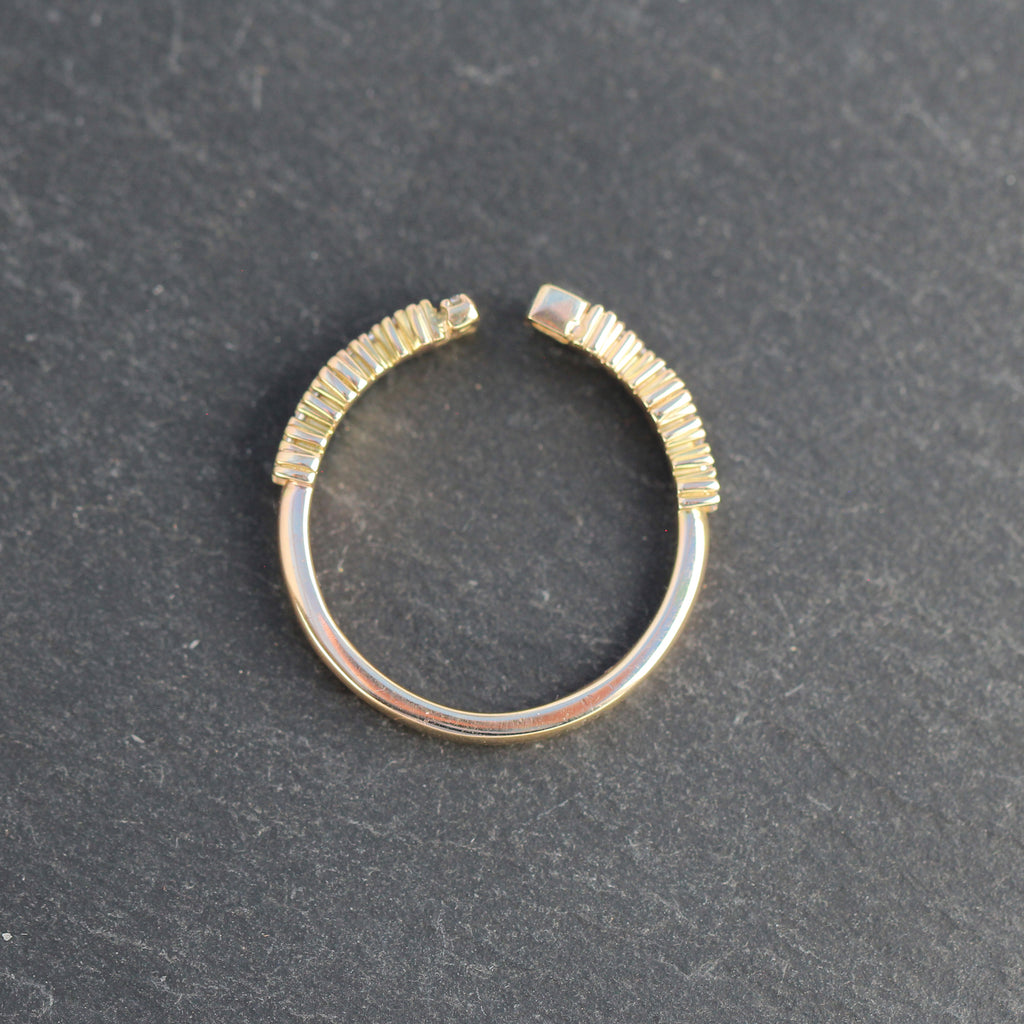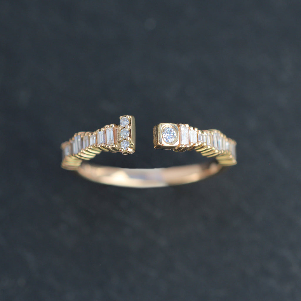 This beautifully unique 14k yellow gold open front ring features prong set baguette diamonds on each side of the ring shank with a diamond bar at one open end and a round cut bezel set square shaped diamond on the other open end. It's a unique, ethically made gem!