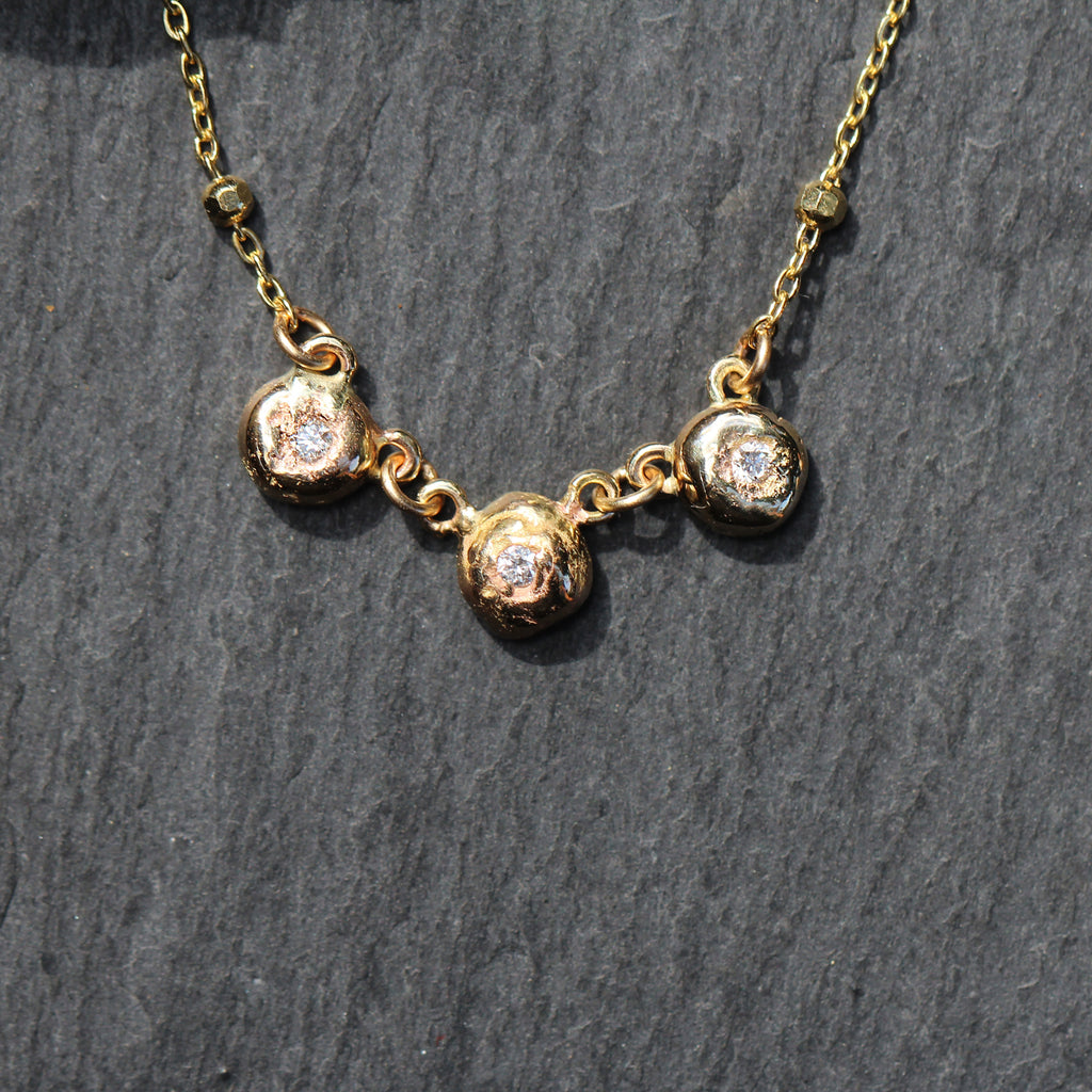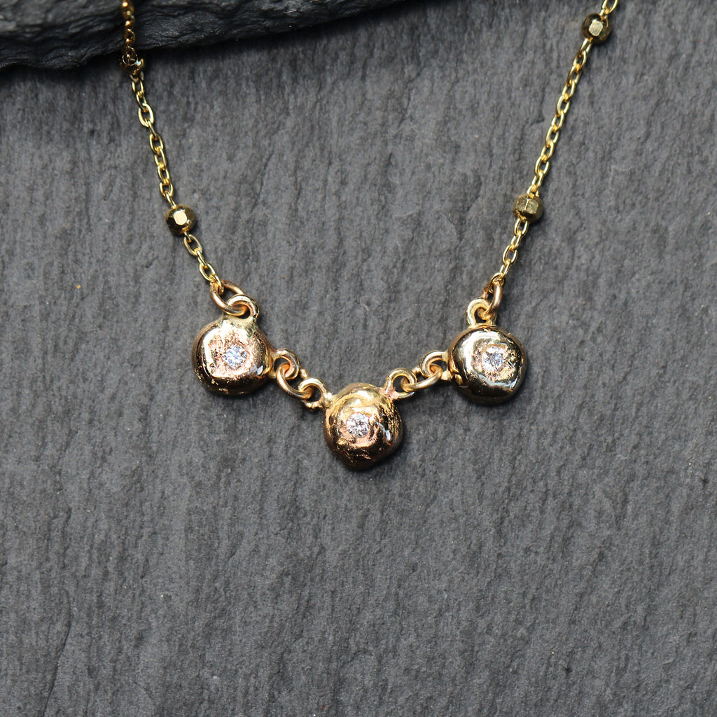 This gorgeous 14k yellow gold and diamond station necklace features 3 recycled gold organic bubble stations in the center with round cut flush set diamonds. All set on a 14k recycled satellite Chain. It's a unique twist on a classic diamond station necklace!