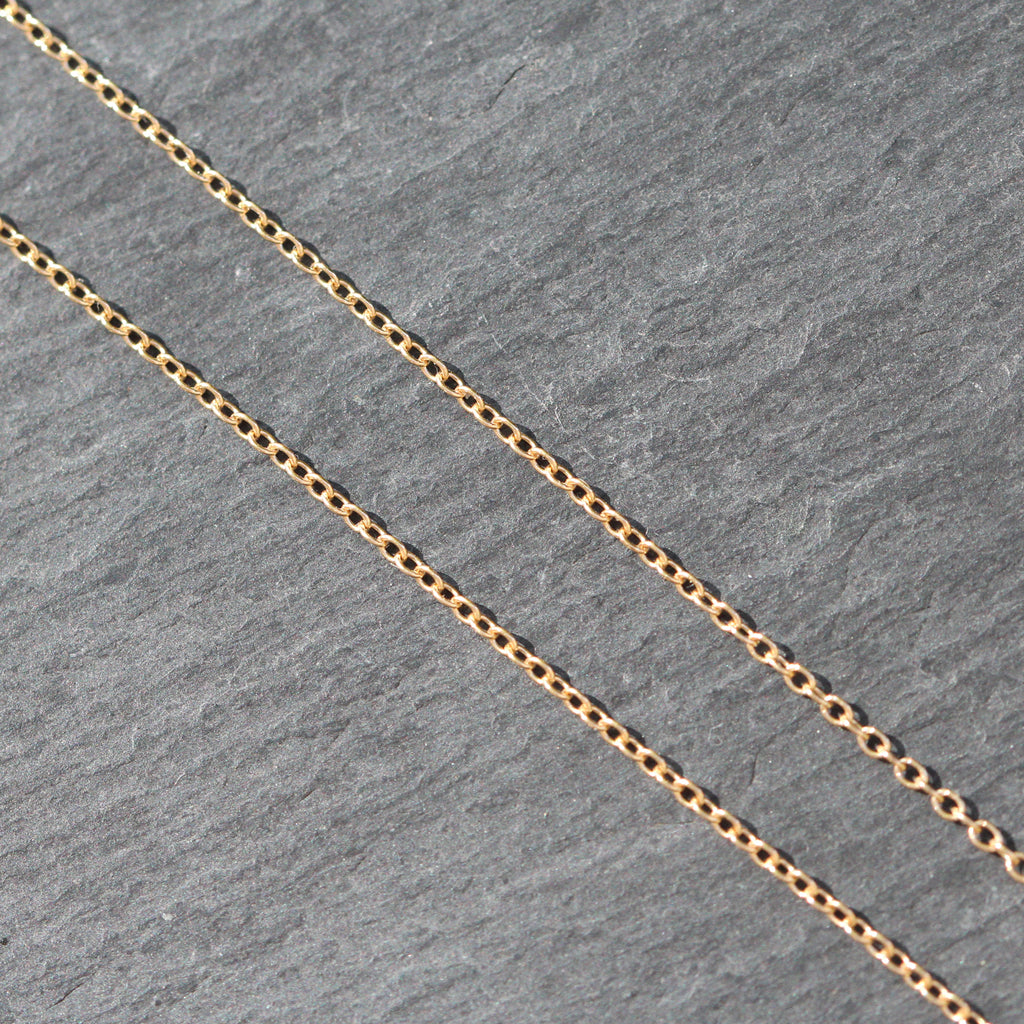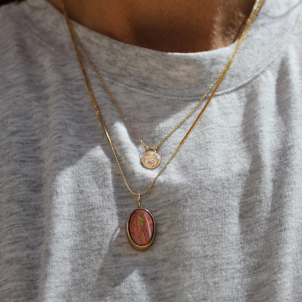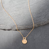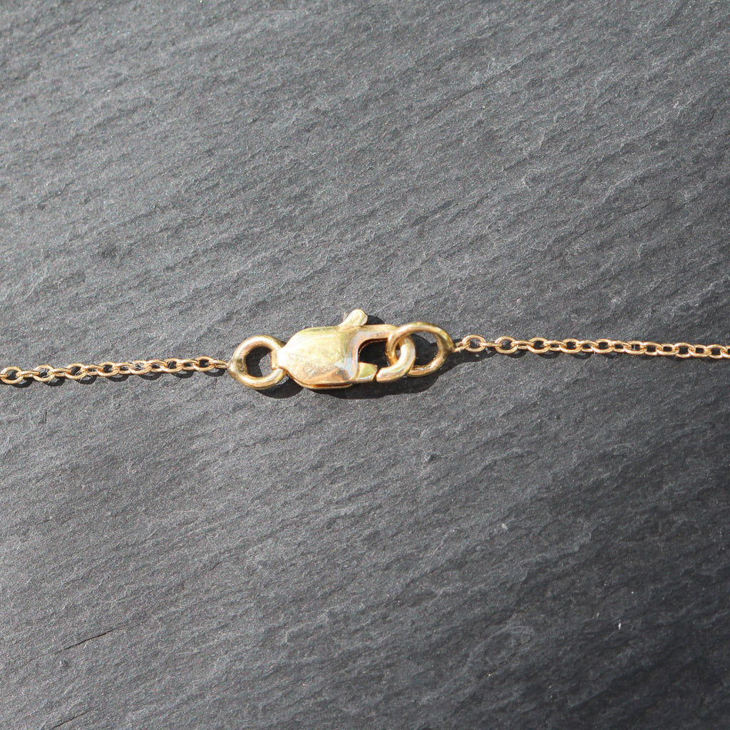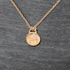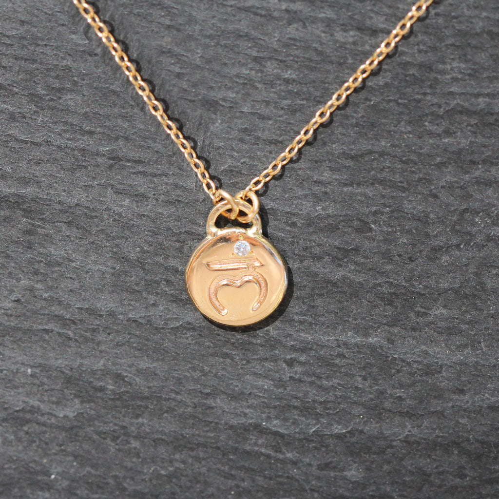 This stunning diamond station necklace features a 14k yellow gold cable link chain with a round root chakra charm stationed in the center. The pendant features the engraved root chakra symbol in the center with a round cut diamond just above it.