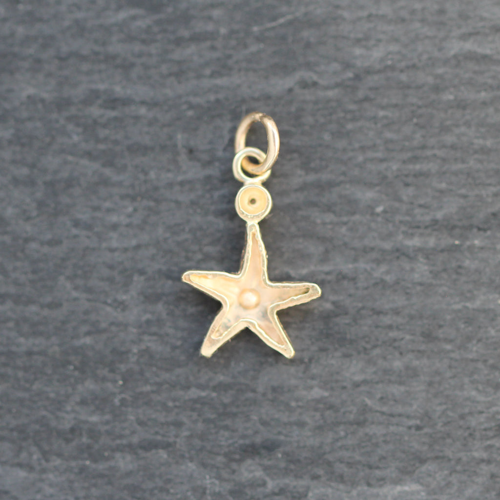 This adorable 14k yellow gold starfish charm features a round cut bezel set diamond at the top and a tiny flush set diamond in the center. It's the perfect addition to any charm bracelet or neckmess!