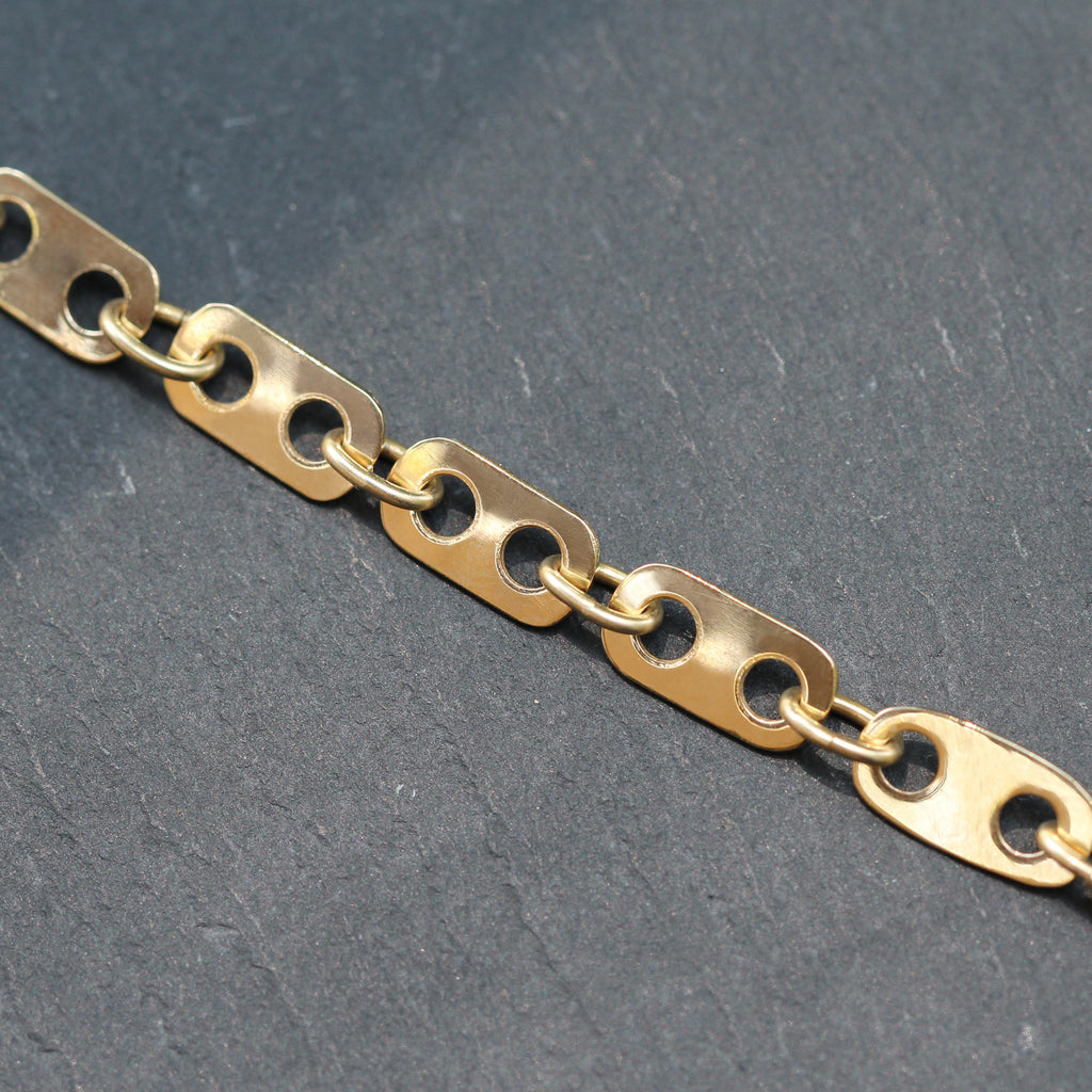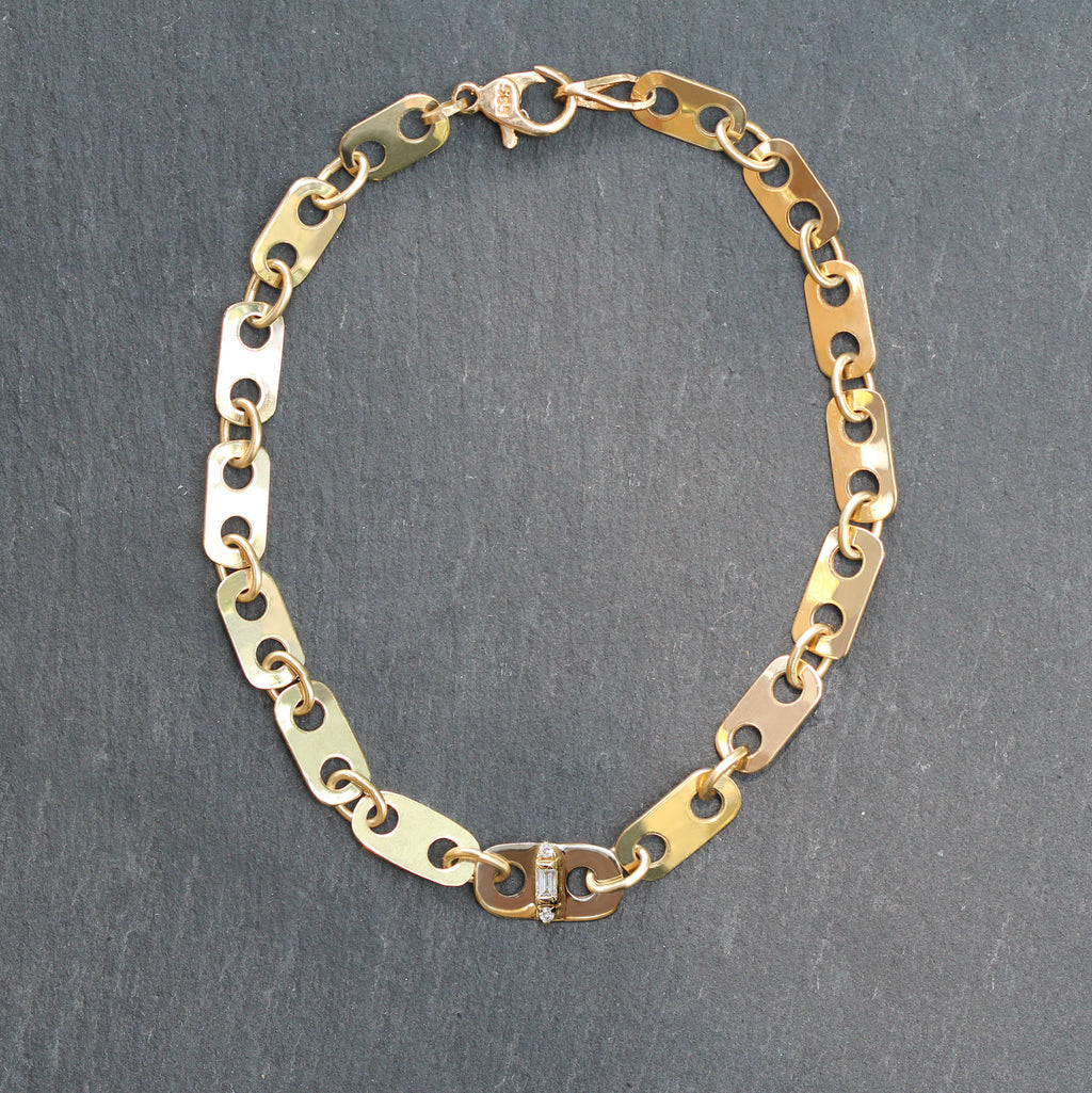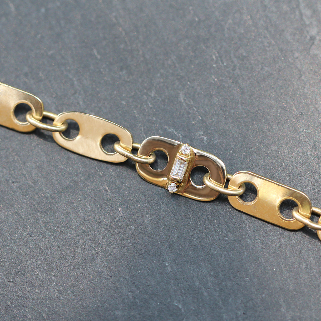 This beautiful 14k yellow gold and diamond bracelet features recycled gold cut into the shape of wide anchor links with the addition of a diamond bar detail through the center anchor link. It's a beautiful, unique take on a classic piece and the upcycling process makes it an ethical, one of a kind gem!