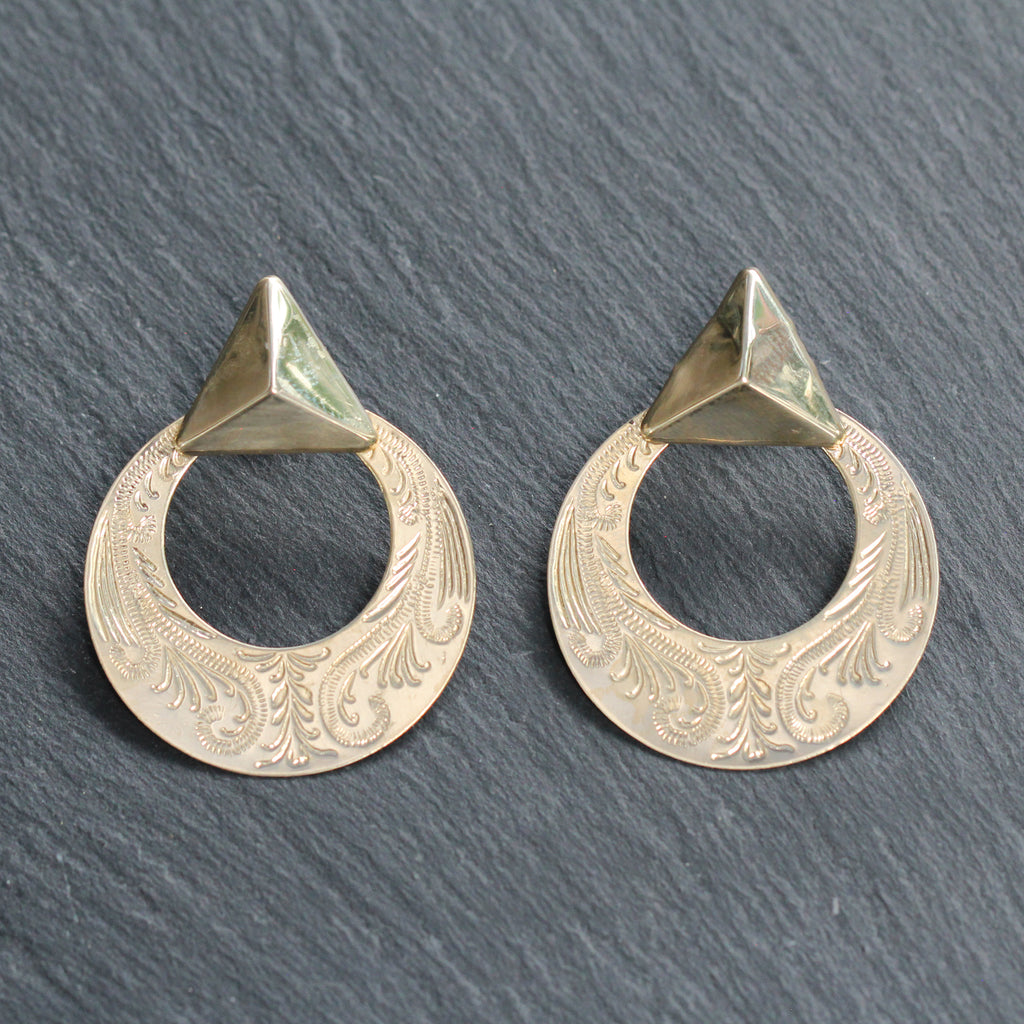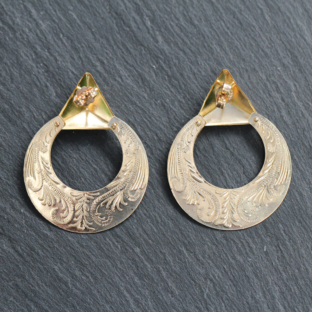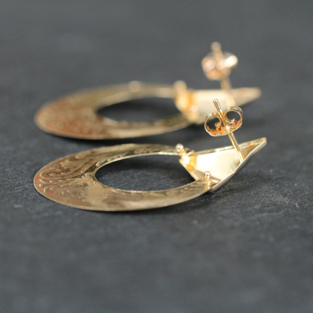 These beautiful, unique 14k yellow gold etched door knocker stud earrings feature triangular style stud tops with intricately etched gold loops below. They are truly a one of a kind, statement pair of earrings!