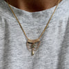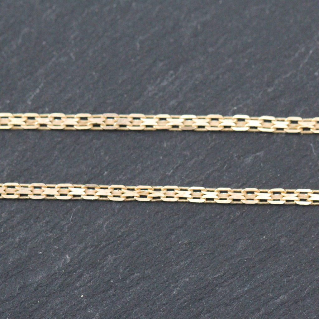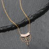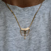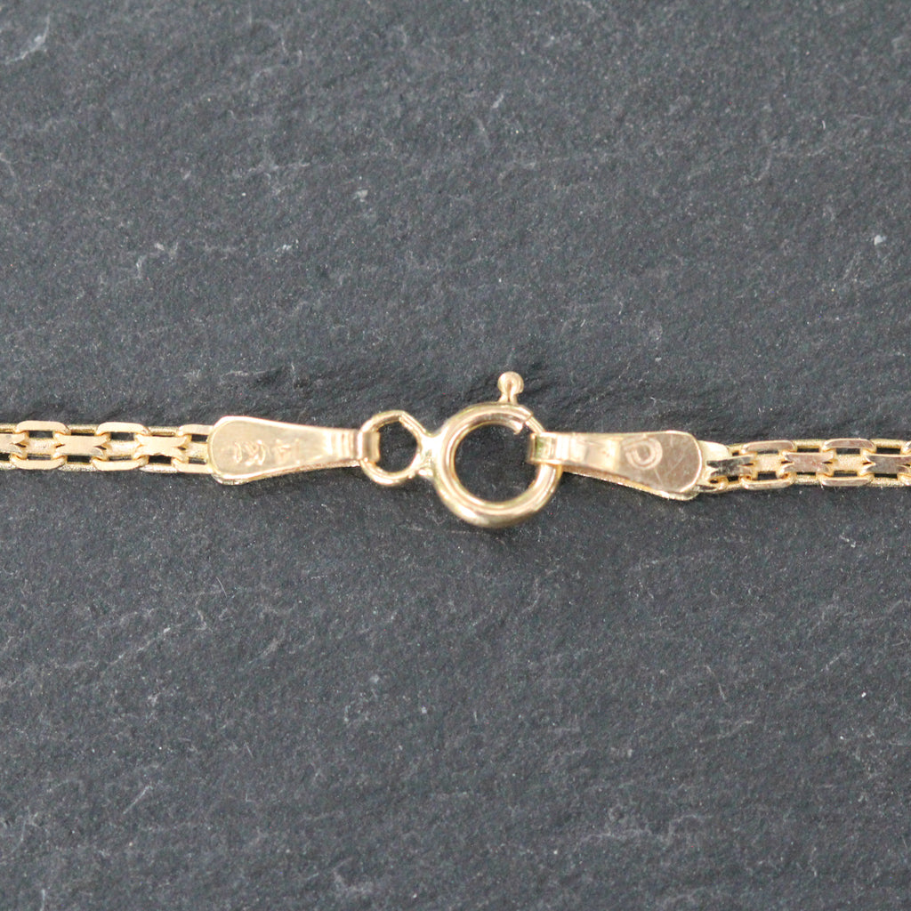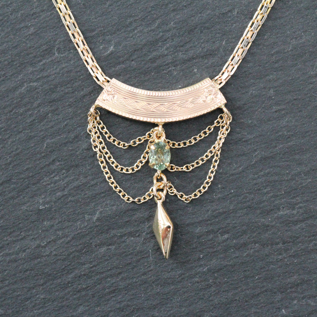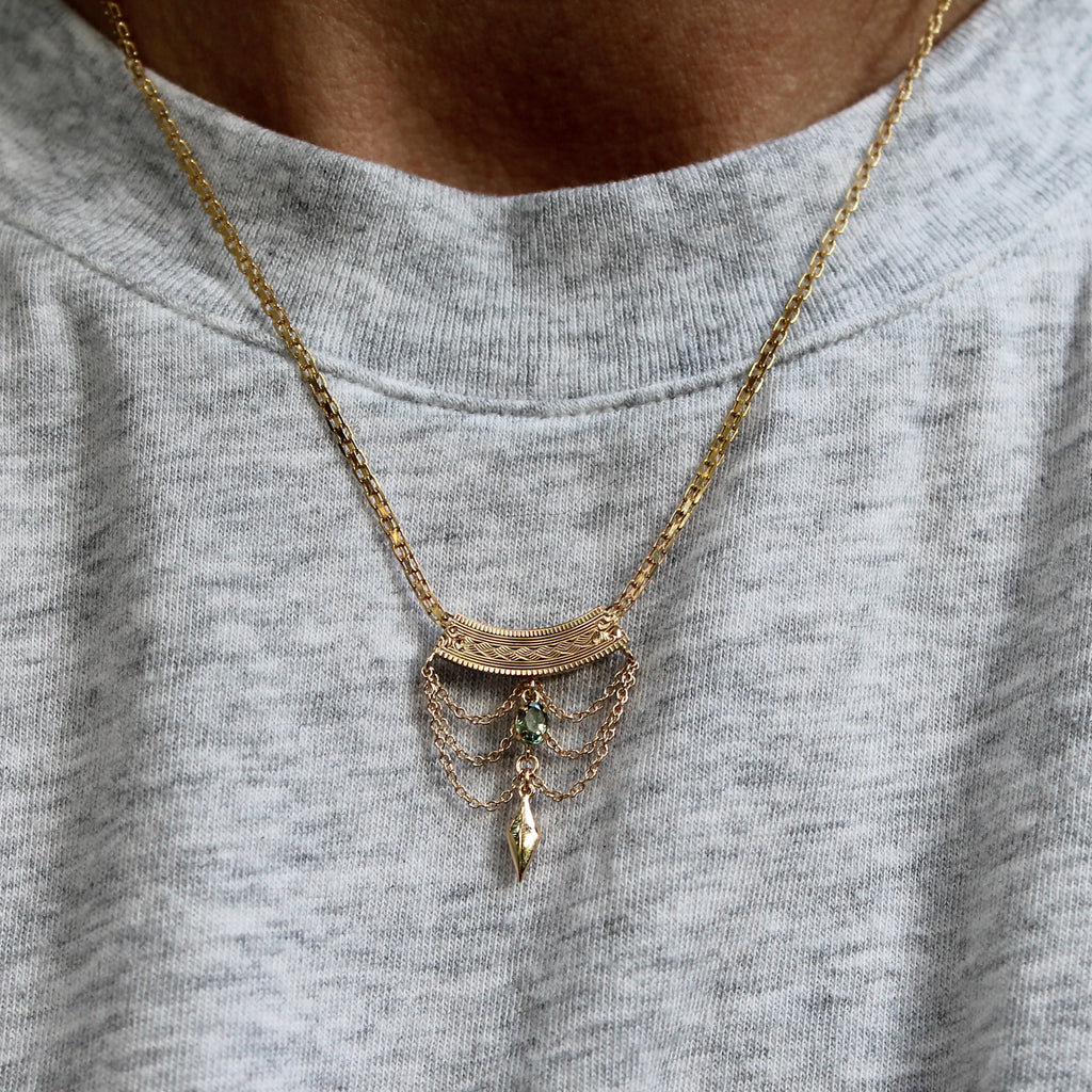 This beautiful 14k yellow gold bib necklace is truly a one of a kind gem! It features a fancy link high polished recycled gold chain with a vintage curved bar we added to the center, along with draped cable chains hanging below and an oval cut prong set green sapphire in the center topped off with a pendulum charm dangling at the base! We used all vintage materials to upcycle this piece, creating a one of a kind, ethical statement necklace!