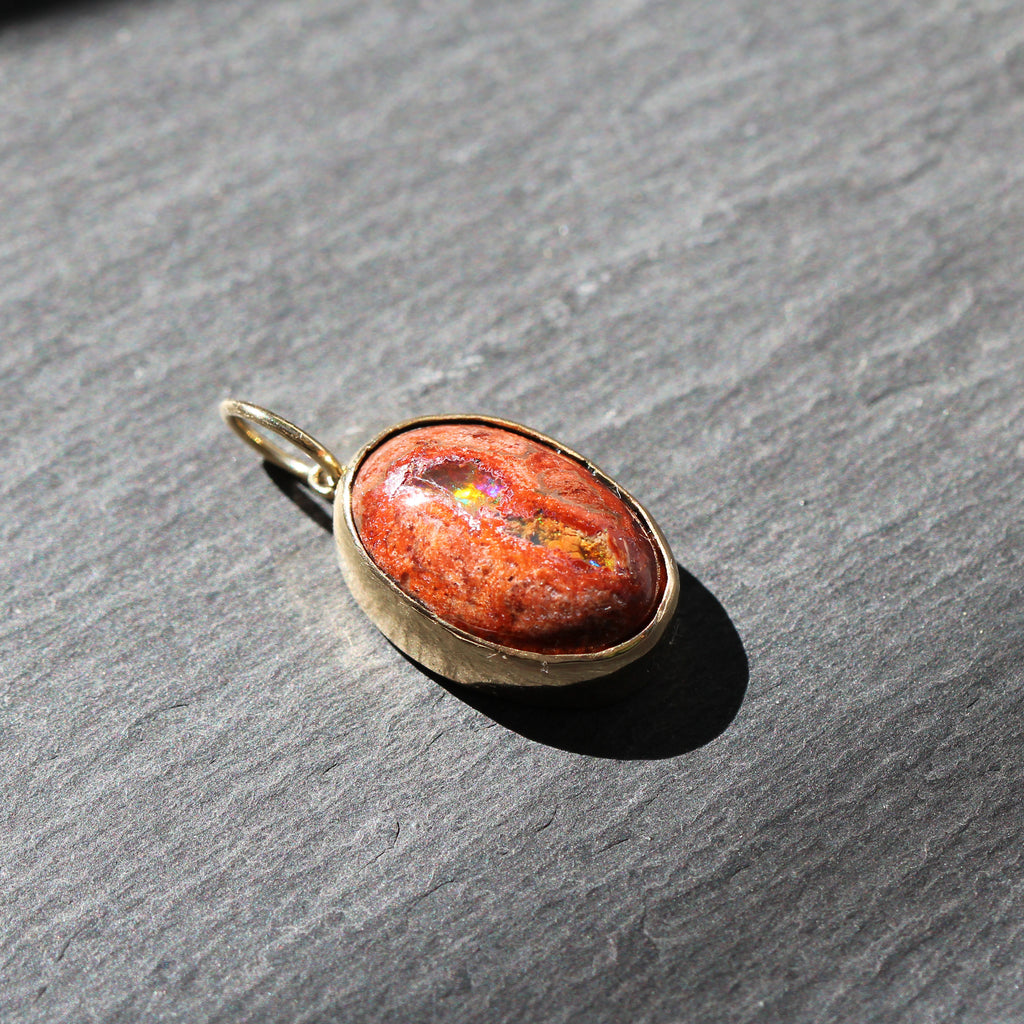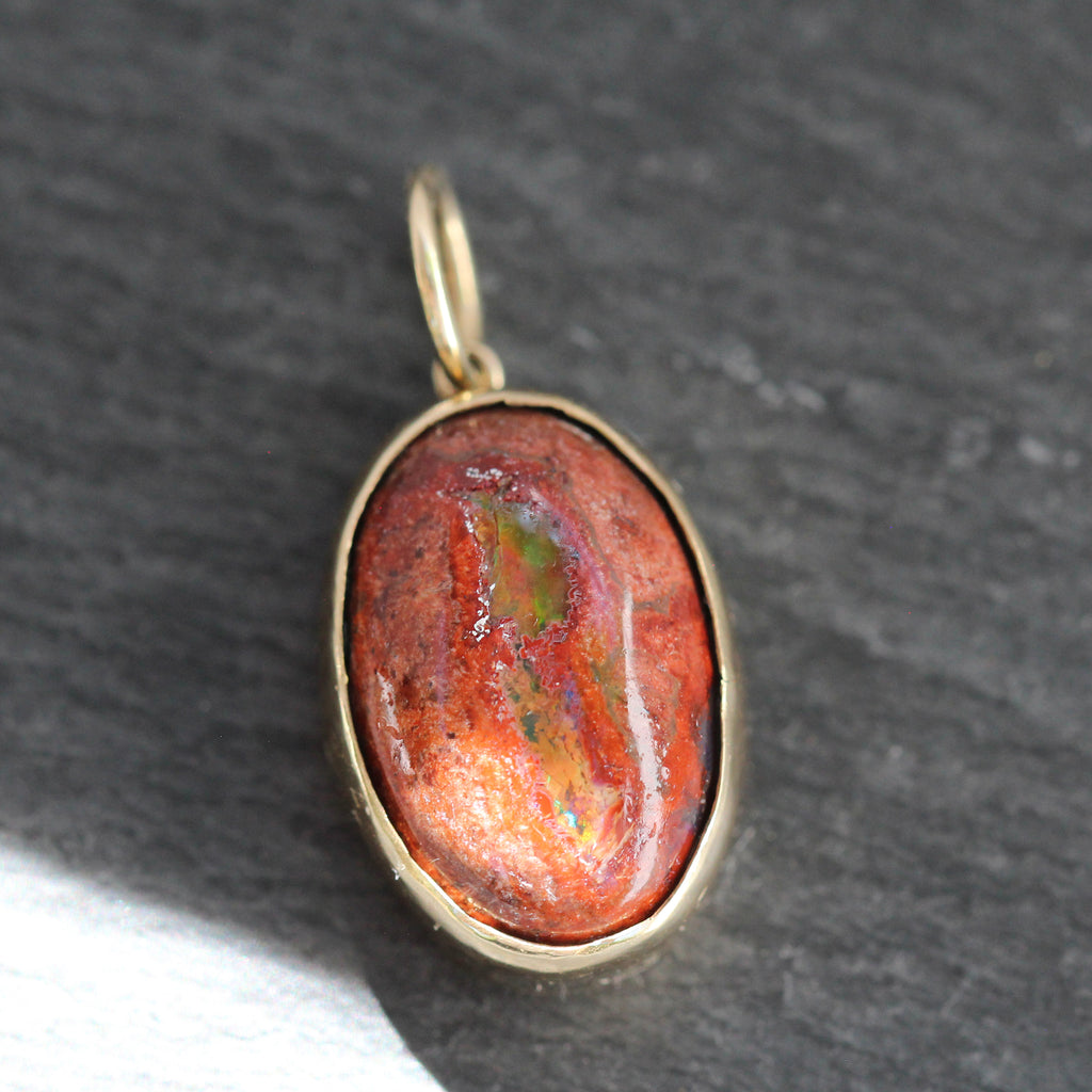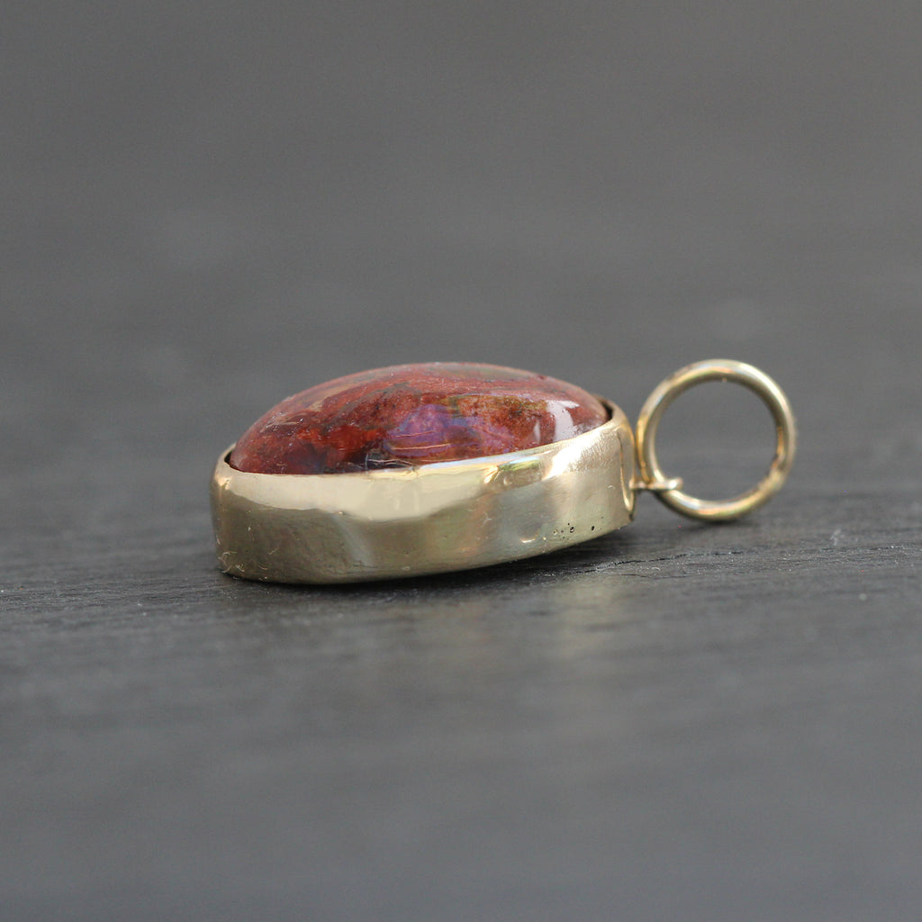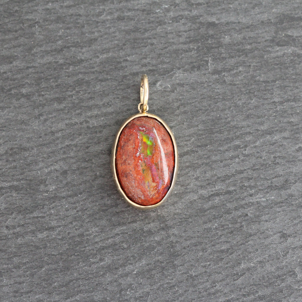 This 14k yellow gold and Cantera Opal pendant is absolutely stunning. It features a beautiful cabochon opal with mauve to red hues and a translucent iridescent streams through the center. In a bezel setting with a high polish finish it makes for the perfect statement pendant!