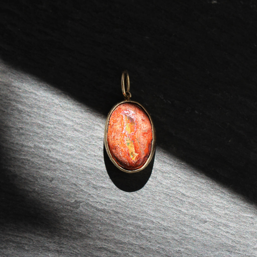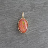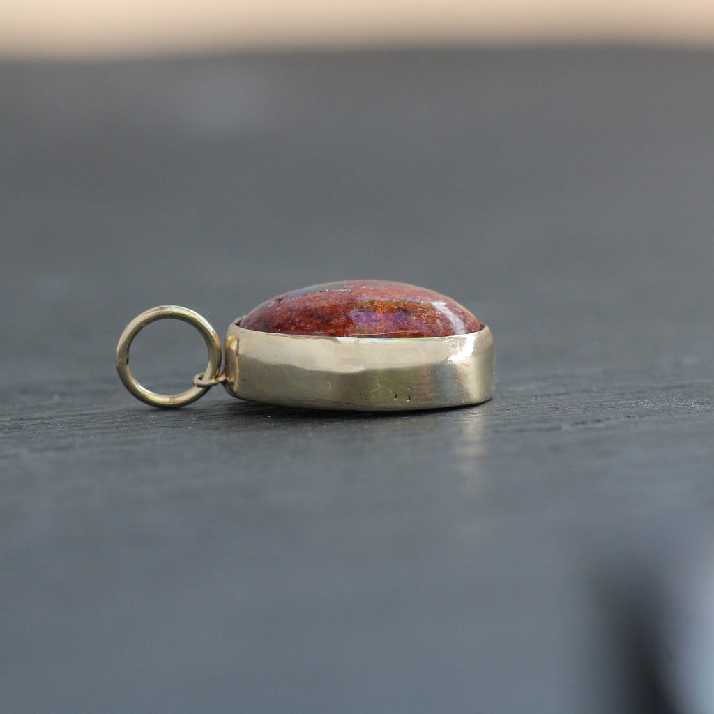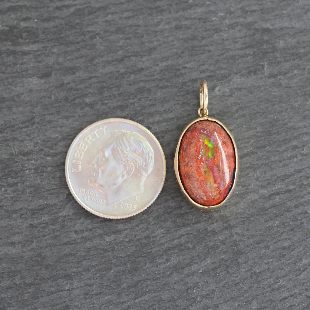 This 14k yellow gold and Cantera Opal pendant is absolutely stunning. It features a beautiful cabochon opal with mauve to red hues and a translucent iridescent streams through the center. In a bezel setting with a high polish finish it makes for the perfect statement pendant!