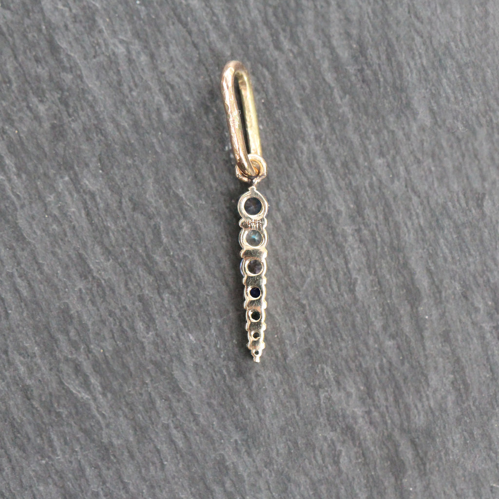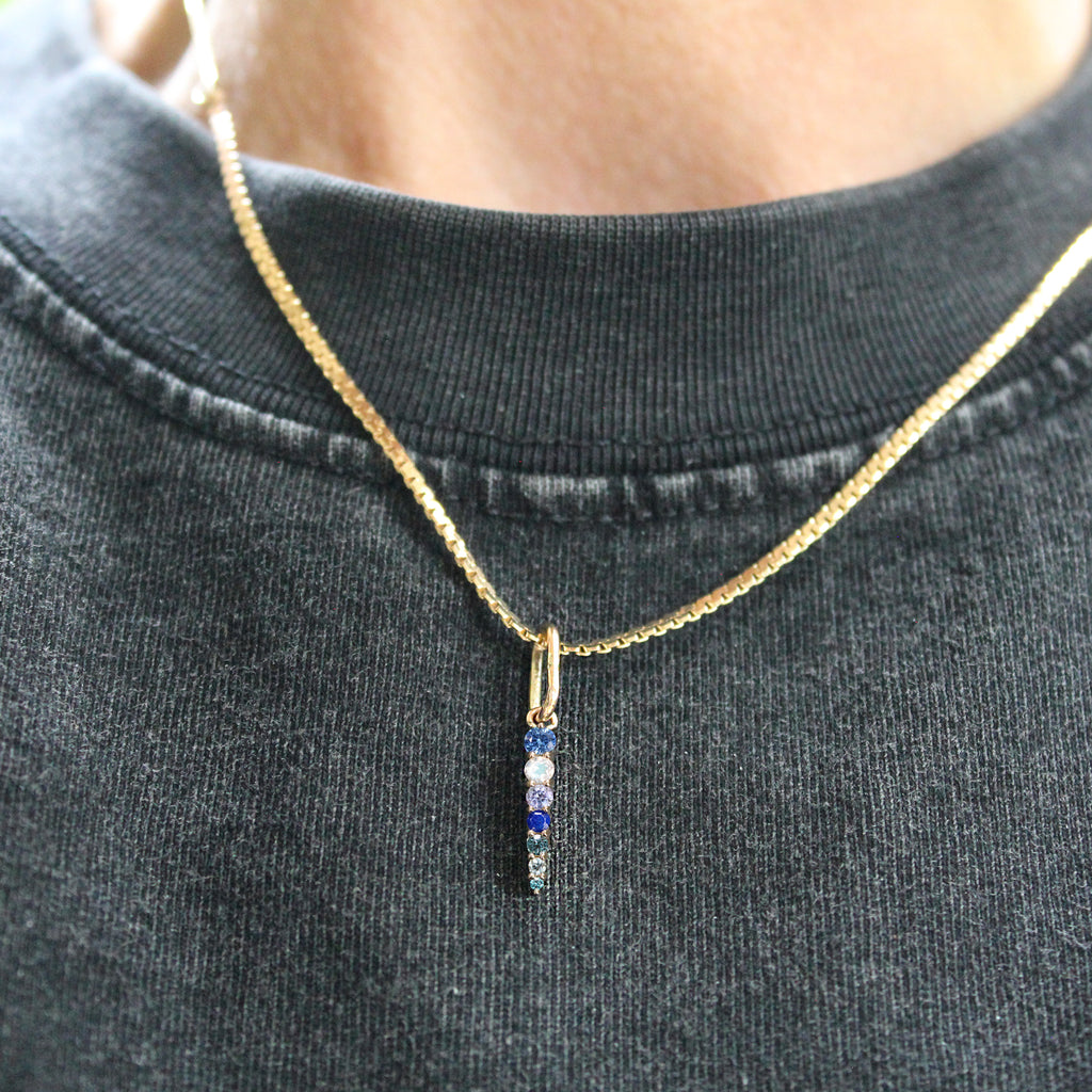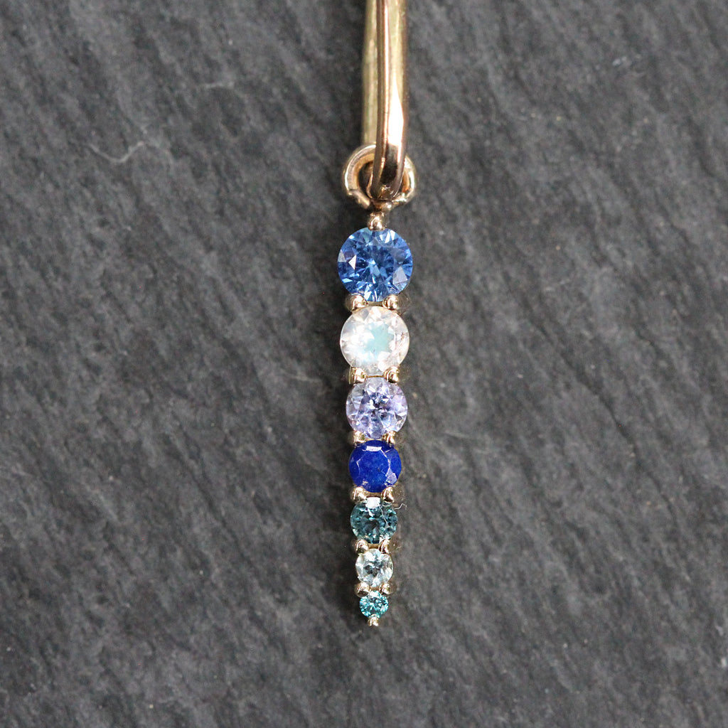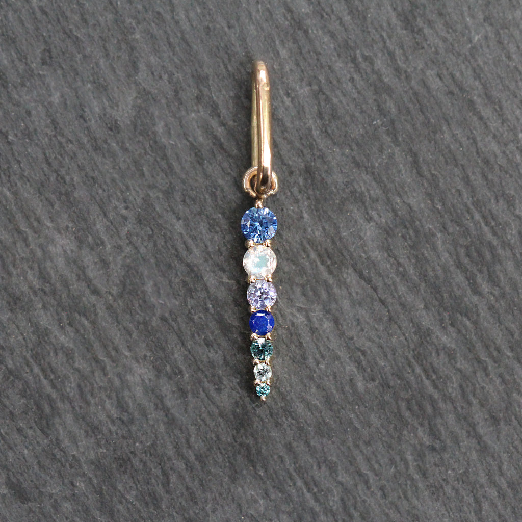 This 14k yellow gold bar spike style charm features round cut faceted shared prong gemstones. Gemstones include: Aquamarine, Sapphire, London Blue Topaz, Tanzanite, Moonstone, Lapis, + Blue Diamond