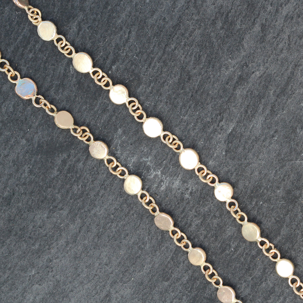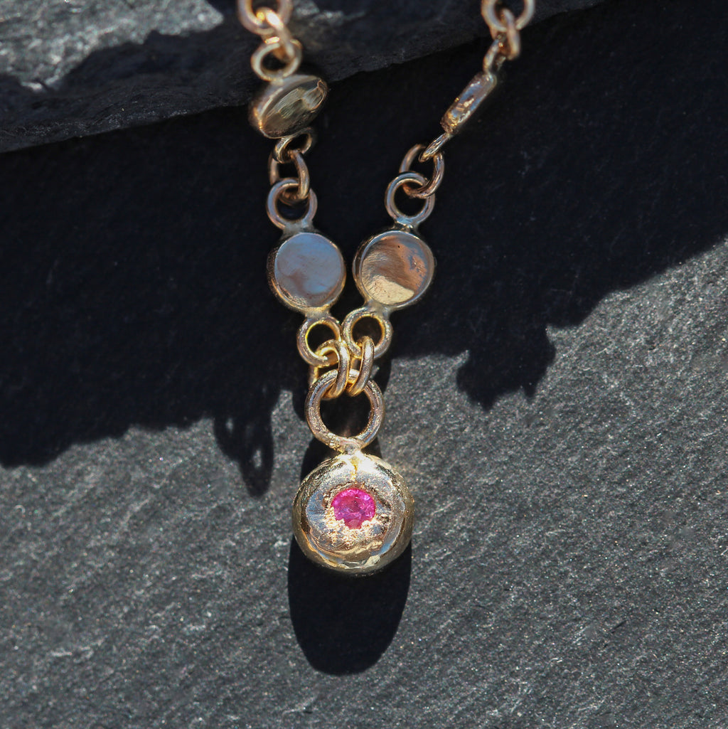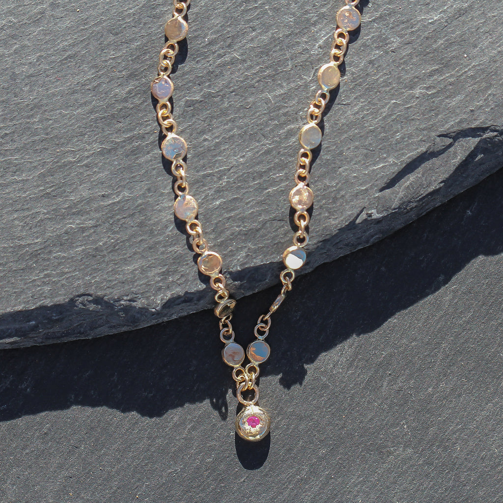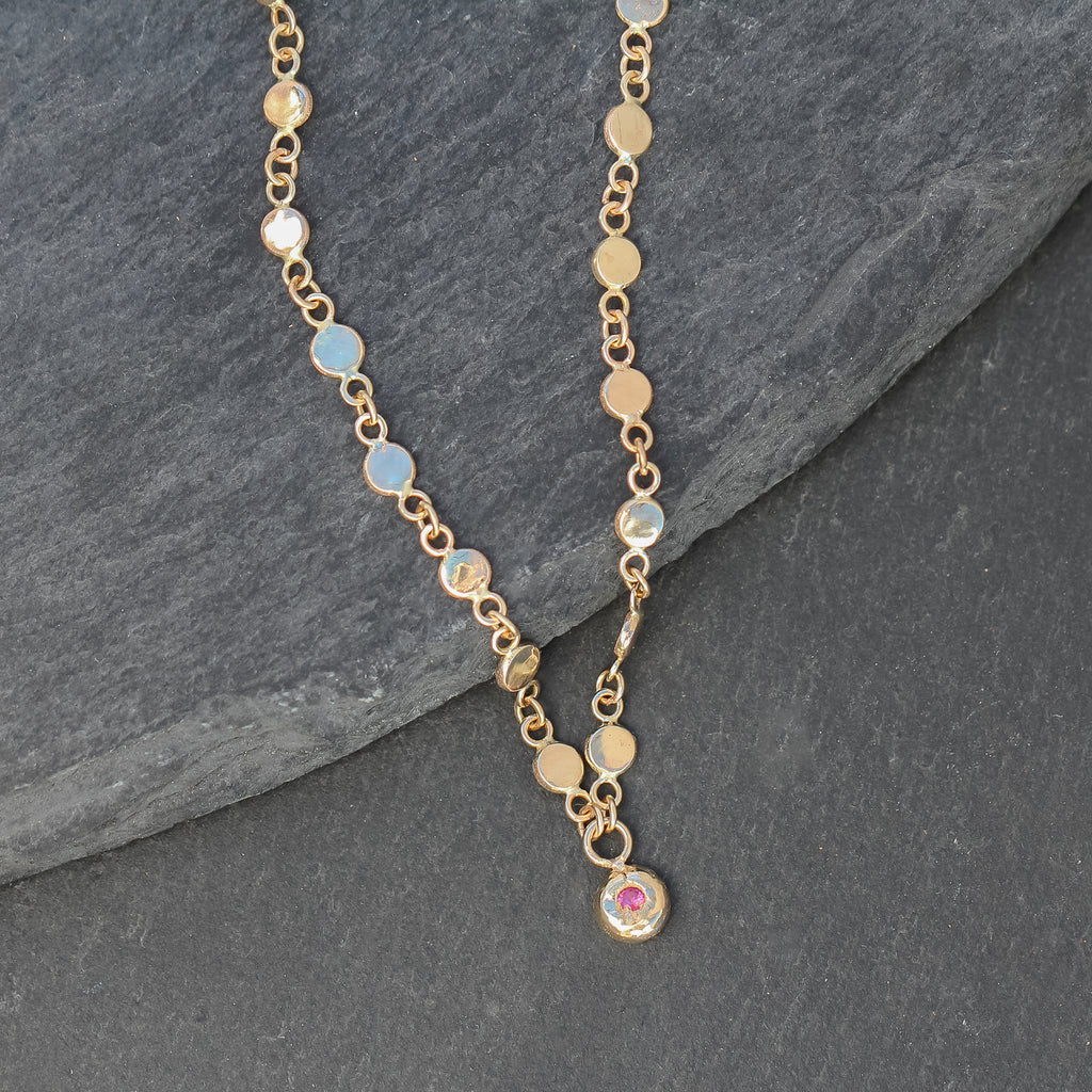 This stunning necklace has been hand crafted by us using 100% recycled materials! The chain features gold disc links that were melted down scrap gold that we hammered out into links. It is detailed with a recycled 14k yellow gold organic bubble station charm with a round cut flush set pink sapphire in the center. It's truly an ethical, one of a kind necklace!