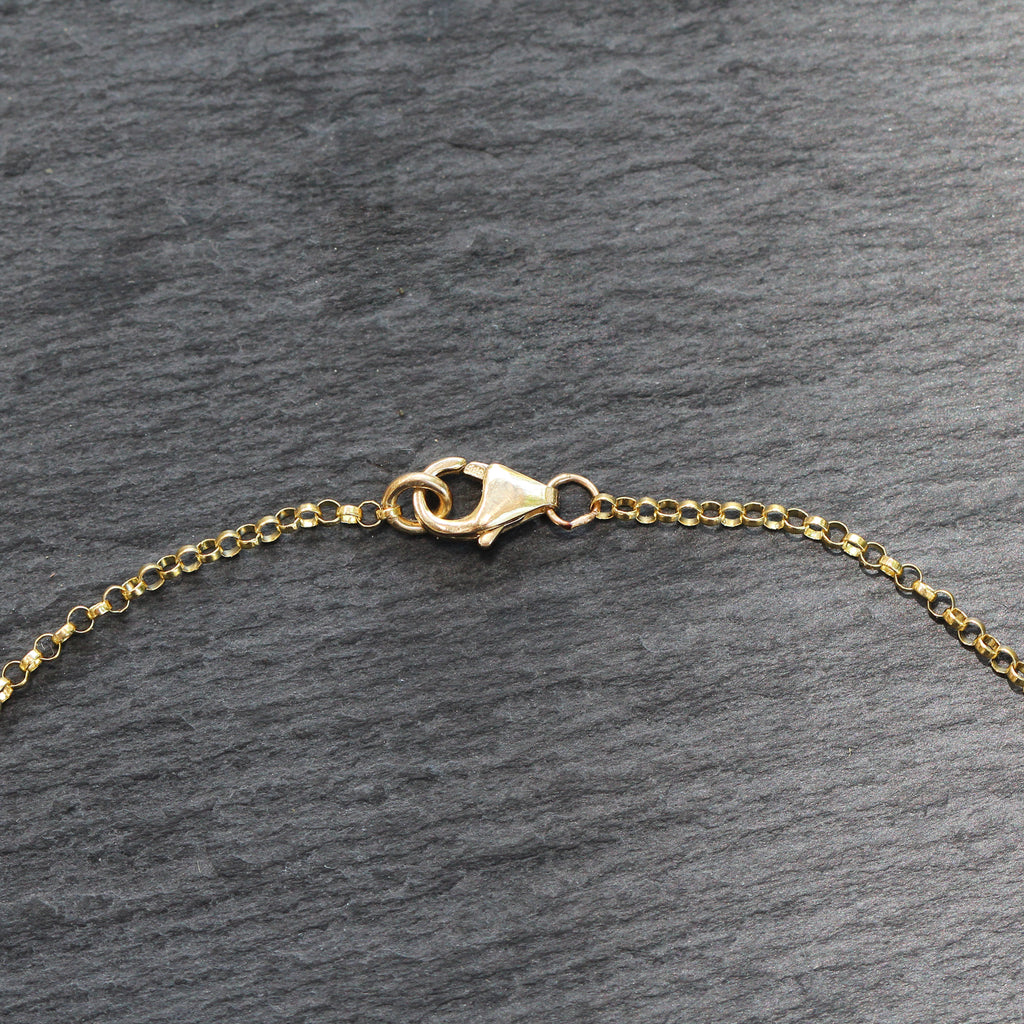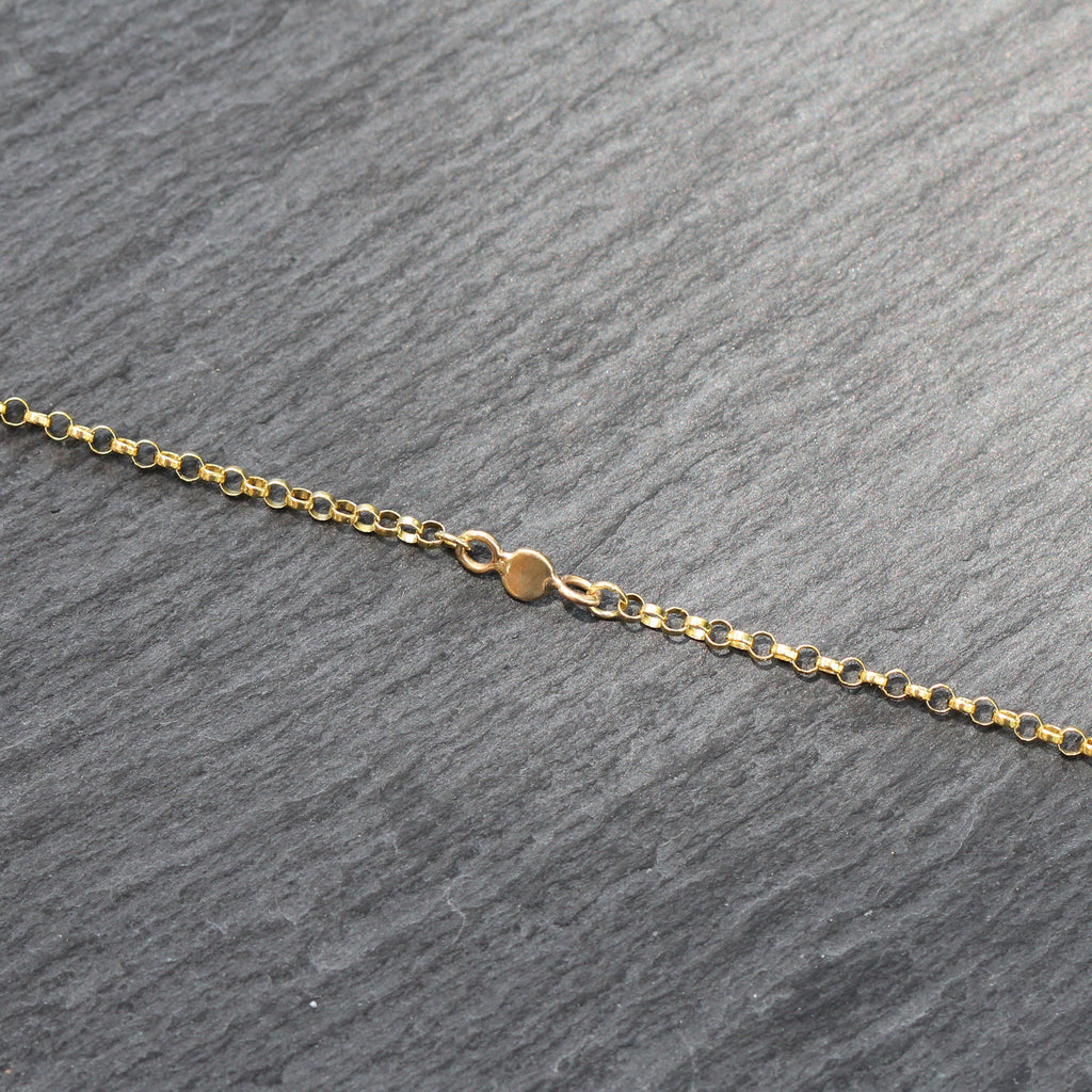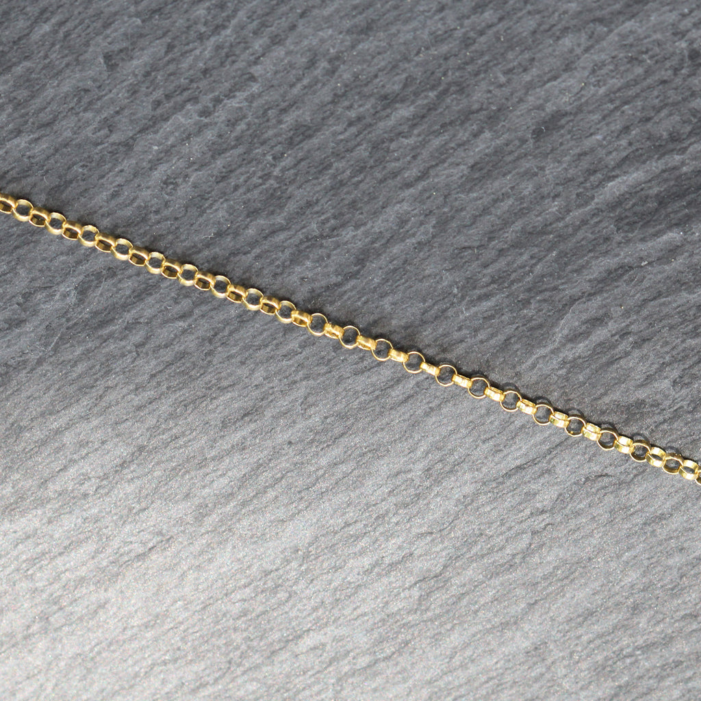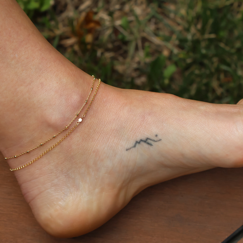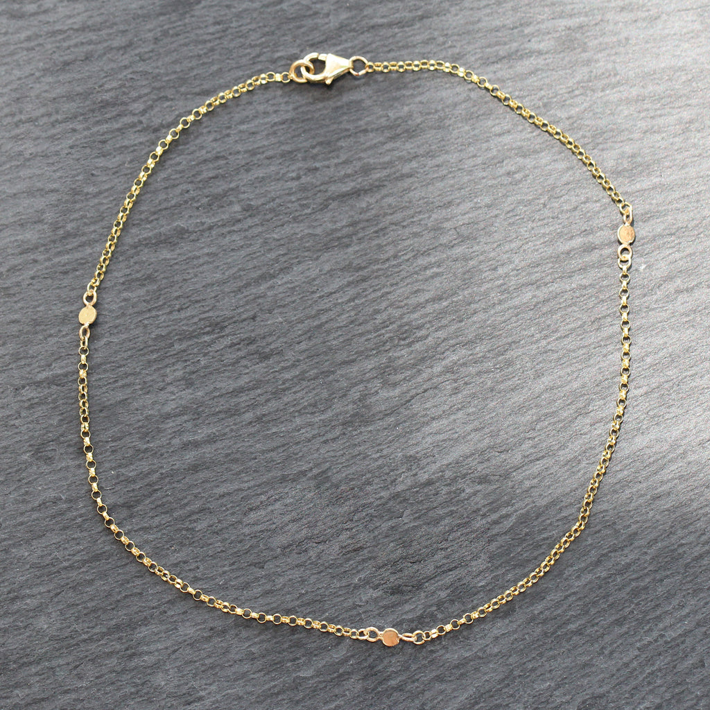 This 14k gold rolo link chain anklet features 3 station discs throughout. It is the perfect accessory for summer. The yellow gold chain is closed with a sturdy 14k lobster claw clasp.