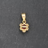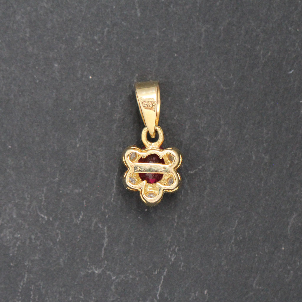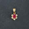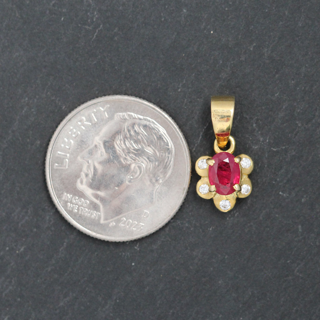 This stunning antique 14k yellow gold + Ruby charm features an oval cut prong set ruby in the center with 5 round cut flush set diamonds on the petals.