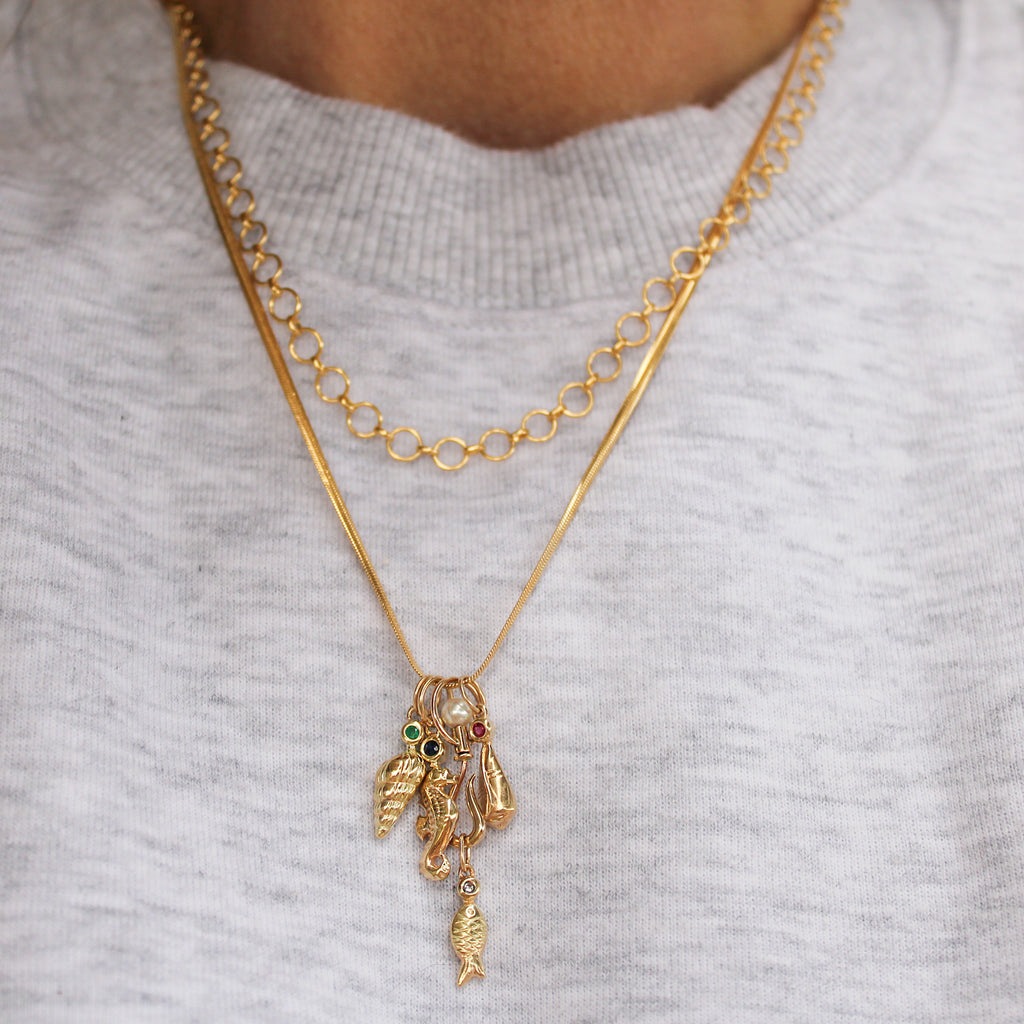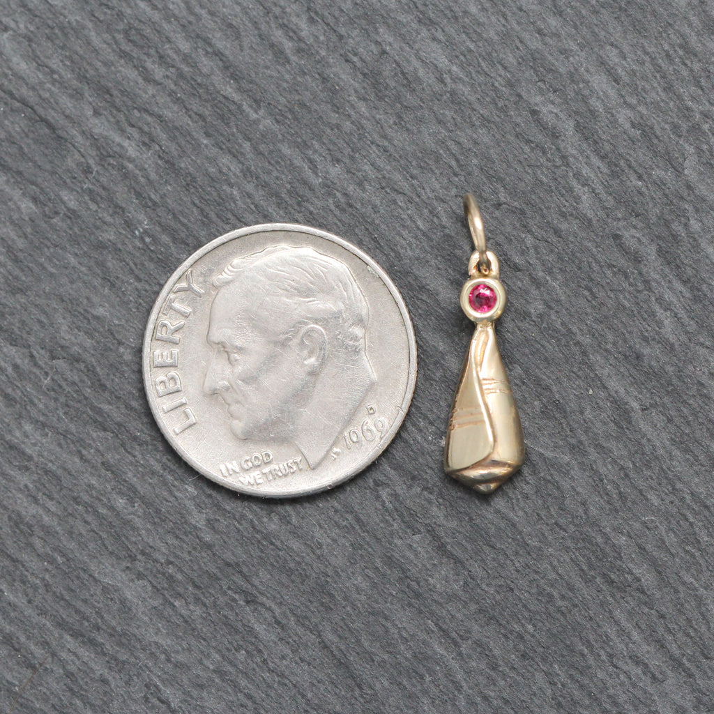 This adorable 14k yellow gold seashell charm features a round cut bezel set ruby at the top. It's the perfect addition to any charm bracelet or neckmess!
