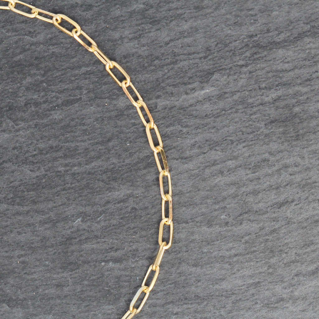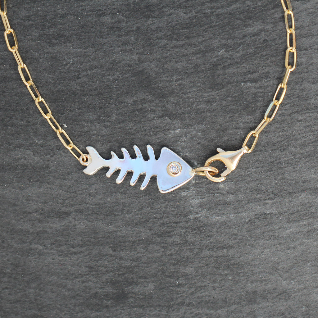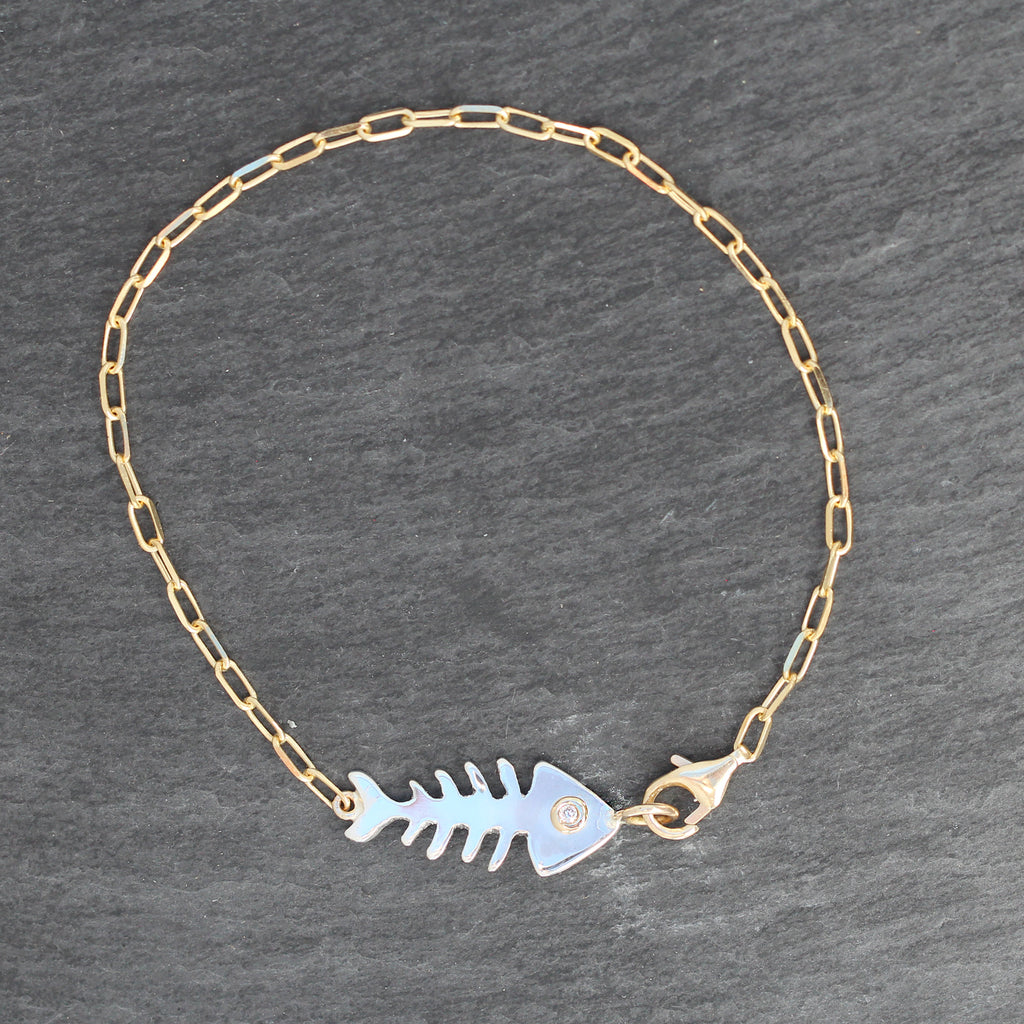 This 14k yellow gold + sterling silver station bracelet features a 14k yellow gold paperclip link chain with a hand cut sterling silver fish skeleton detailed with a 14k yellow gold round cut bezel set diamond as the eye.